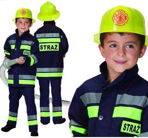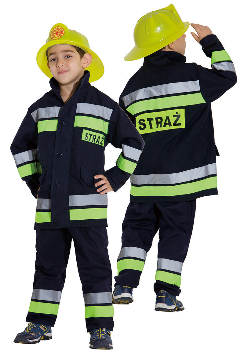 Wspaniałe przebranie na karnawał, bal przebierańców, czy do zabawy w odgrywanie ról! Oryginalny strój dzięki, któremu Twój synek zostanie odważnym strażakiem. Strój posiada polskie napisy STRAŻ na plecach i froncie, a także wyglądający, jak prawdziwy strażacki hełm z tworzywa. Strój jest zapakowany w przeźroczysty pokrowiec zamykany zamkiem błyskawicznym, dodatkowo zawieszony na wieszaku.
