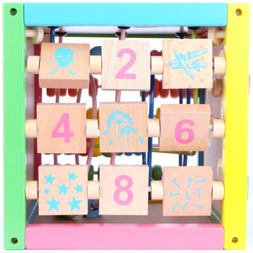 Zaczarowane Pudełko to zabawka edukacyjna dla rocznego dziecka. Każda ze ścian kryje nową, wciągającą zabawkę: labirynt, liczydło, tablicę, obrotowe klocki z cyferkami i rysunkami zwierząt.