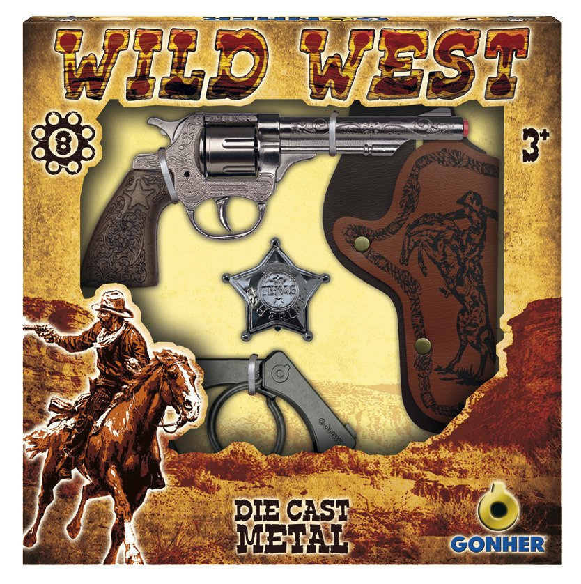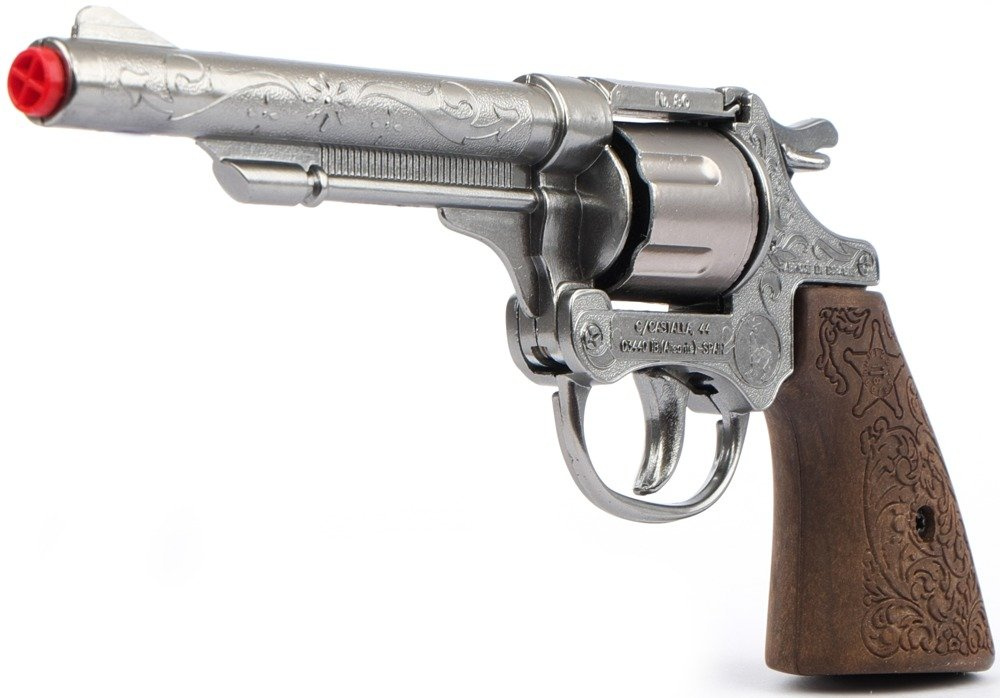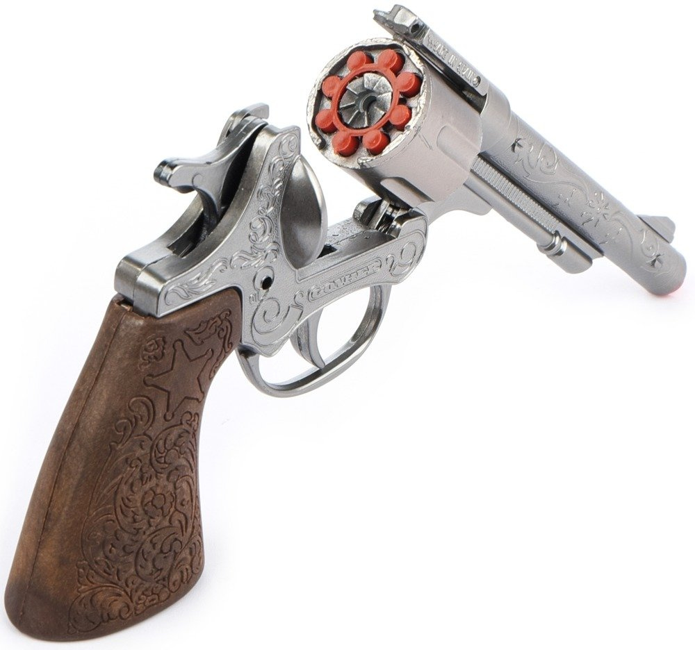 Duży, metalowy rewolwer produkowany jest w Hiszpanii przez cenioną firmę Gonher, która od wielu lat zajmuje się produkcją tego typu zabawek.