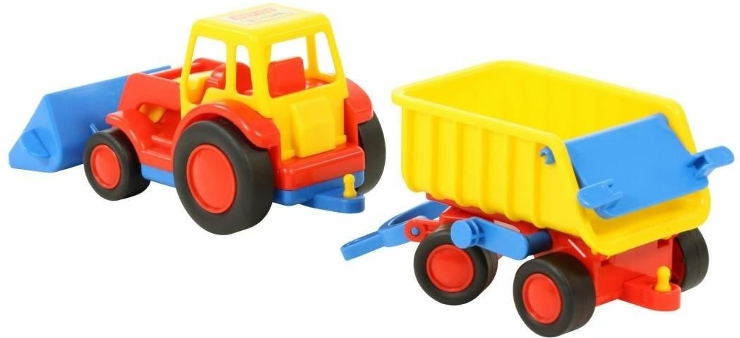 Traktor + ładowarka z przyczepą to pojazd wyposażony w ruchomą łyżkę do nabierania i transportowania. Kabina jest przestronna i pozwala na umieszczenie w niej ulubionej figurki naszego malucha. Pojazd posiada dodatkowy element jakim jest przyczepa. Kontener przyczepy można podnosić i opuszczać przy pomocy specjalnej rączki umieszczonej na jej boku. Produkt wykonany jest z wysokiej jakości plastiku i dostępny w dwóch podobnych kolorystykach.