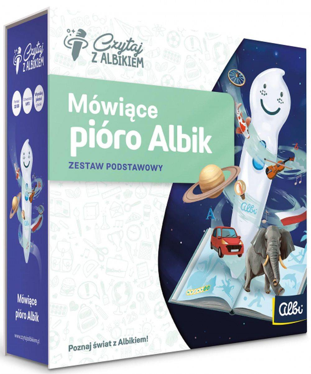 Edukacyjne pióro Albik to doskonały przewodnik po wszystkich książkach z serii " Czytaj z Albikiem ". Pióro, dzięki aktualizacjom oprogramowania (bezpłatnym) będzie współgrało z każdą z nowości wydawniczych. Sięgając do książki z elektronicznym piórem Albik za każdym razem można odkryć coś nowego. Pióro umożliwia także nagrywanie i kodowanie swoich tekstów lub piosenek. Służą do tego naklejki, do których można przypisać swoje treści dźwiękowe.
