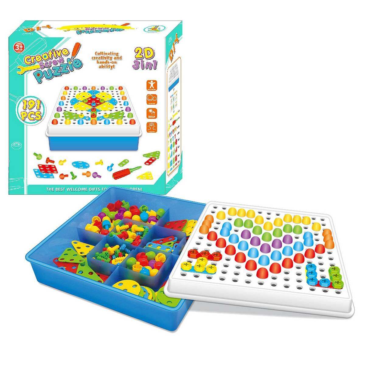 Twórz niesamowite wzory na płasko za pomocą zestawu-układanki ze śrubokrętem. Przykręcanie kolorowych śrubek wymaga precyzji ruchów ręki, przez co zabawka rozwija małą motorykę i zdolności manualne.