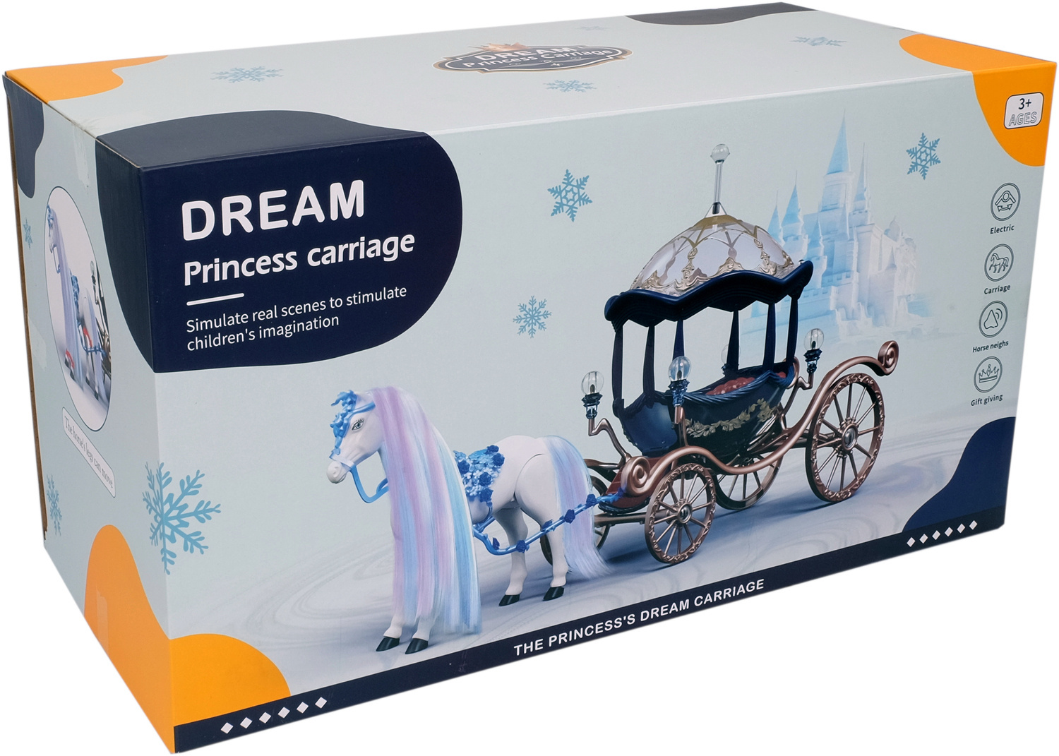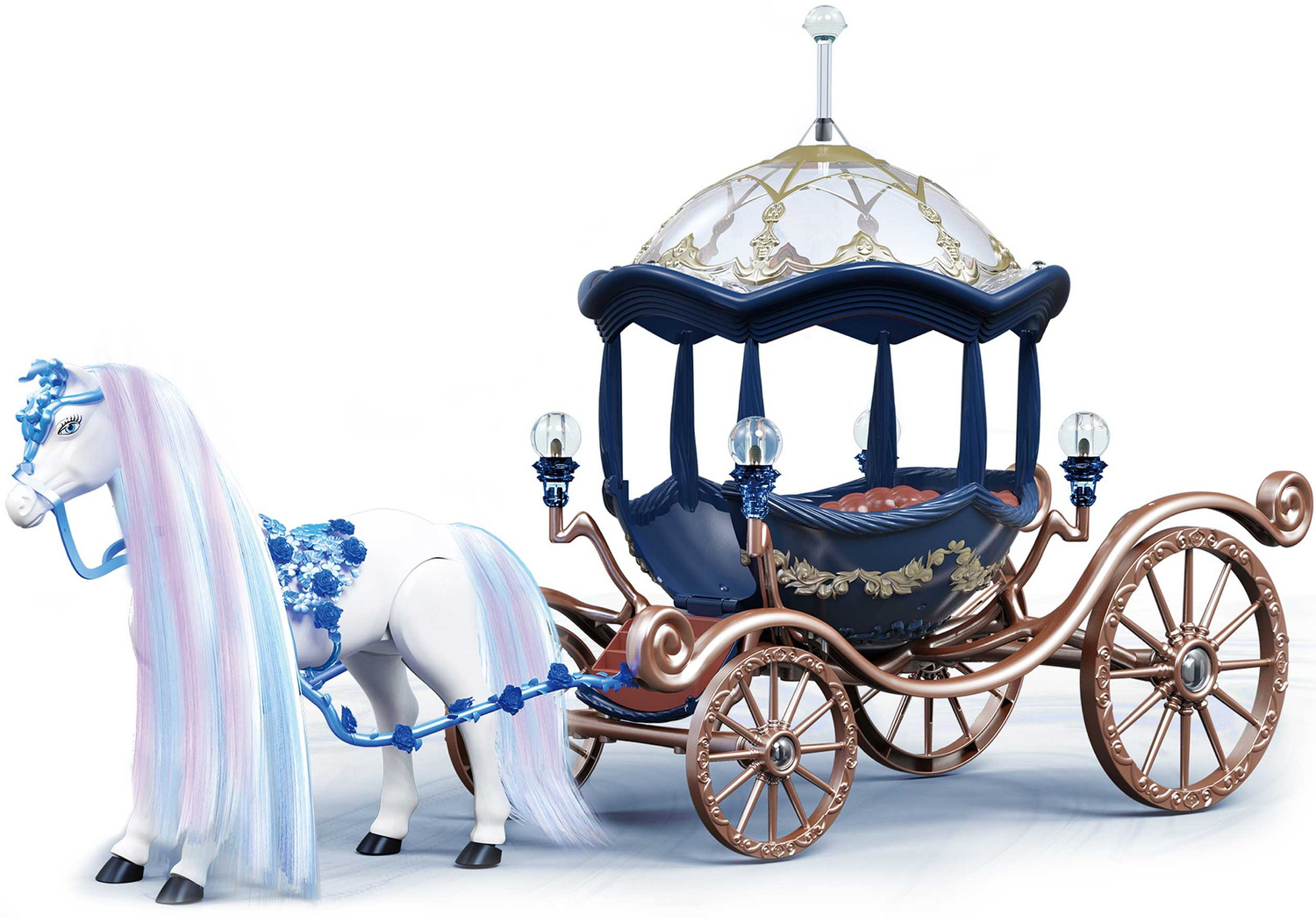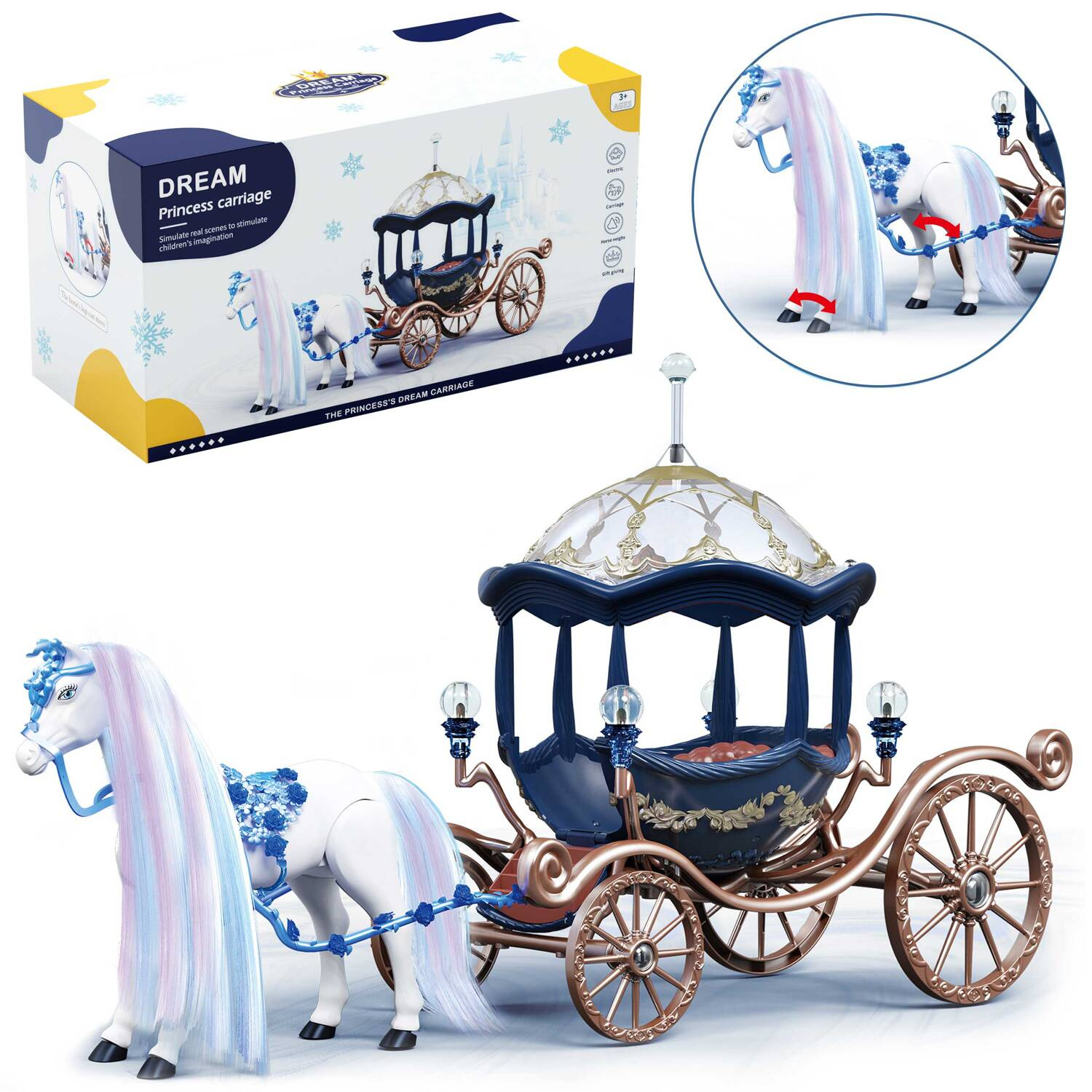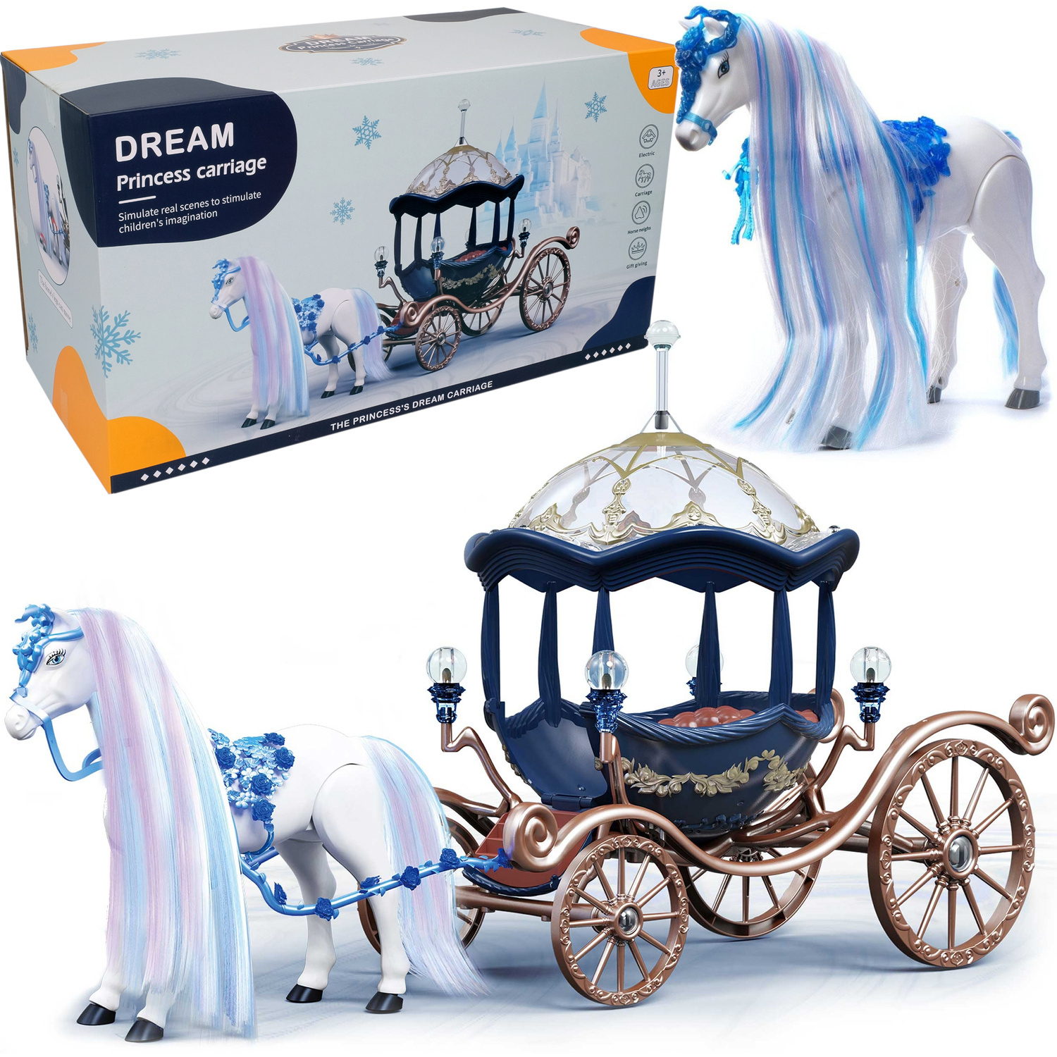 Bajkowa kareta dla lalek w kształcie dyni pozwoli każdej małej księżniczce przenieść się w świat fantazji i spełnić swe marzenia. Niebieska karoca na kołach, z przezroczystym dachem, zawiezie ulubioną laleczkę (pasuje np. do lalek Barbie) na bal do królewskiego zamku. Ciągnie go przepiękny biały, długowłosy koń z uprzężą, który chodzi i wydaje prawdziwe odgłosy. Drzwi bajkowego pojazdu otwierają, a do wnętrza prowadzą schodki.. Konikiem po zdjęciu uprzęży możesz też bawić się samodzielnie. Czyż to nie cudowne?