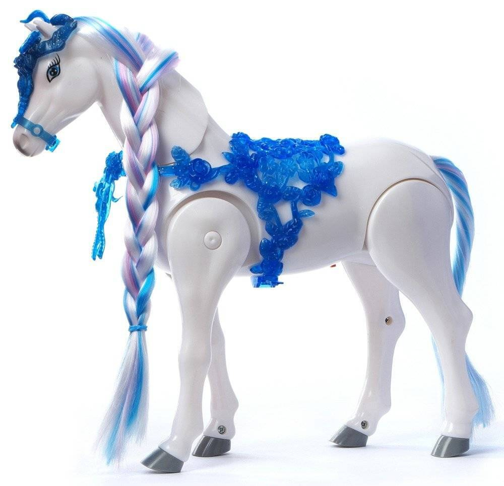 Przepiękny biały, połyskujący, długowłosy koń z różową uprzężą. Przesuń przycisk, a koń zacznie wydawać odgłosy zupełnie jak prawdziwy i poruszać się.