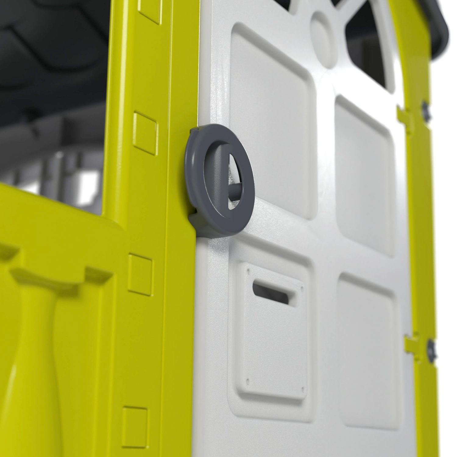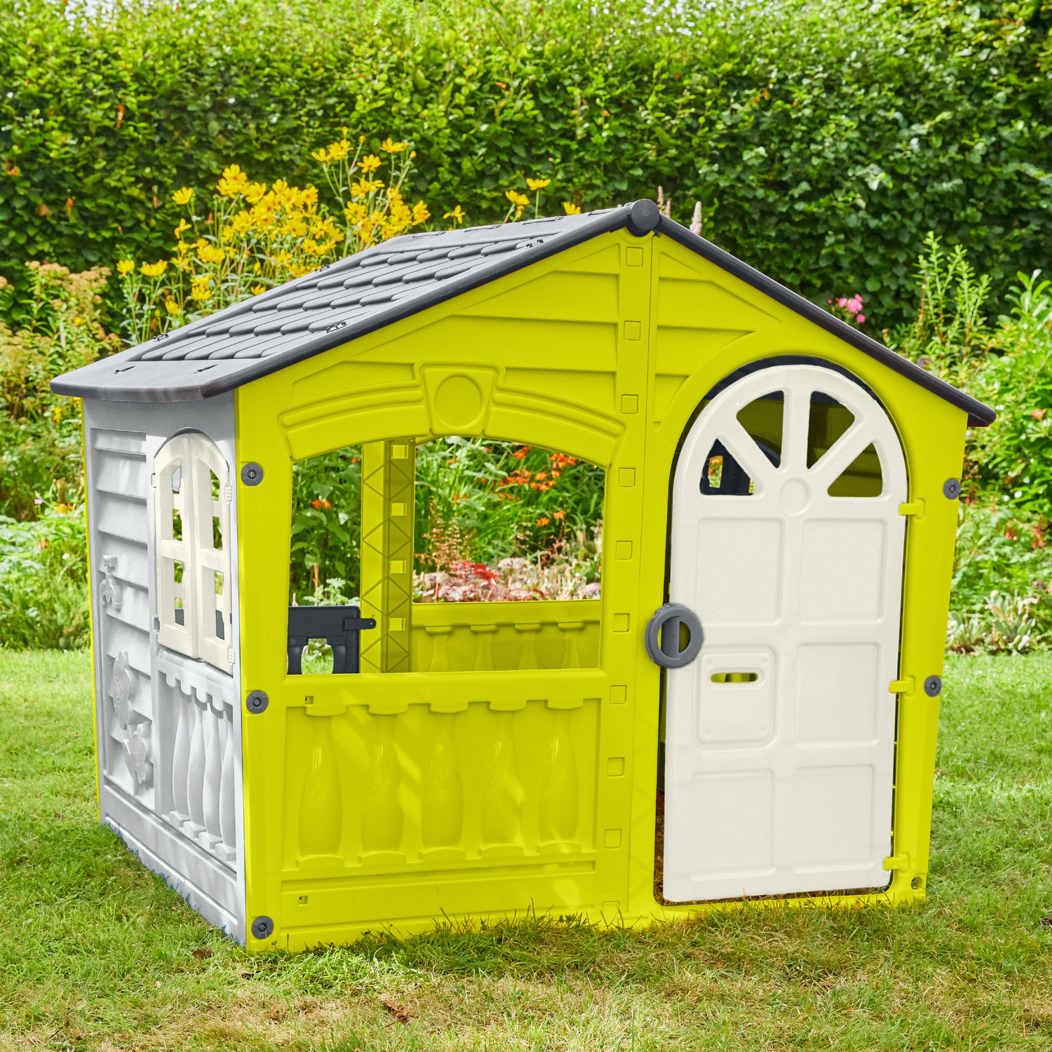 Przestronny domek ogrodowy stanie się ulubionym miejscem zabaw Twojej pociechy i jej przyjaciół. Oryginalnego charakteru nadaje mu modna, żywa kolorystyka i ściany ozdobione naklejkami z motywem kwiatków, skrzynki na listy czy kraniku do podlewania.