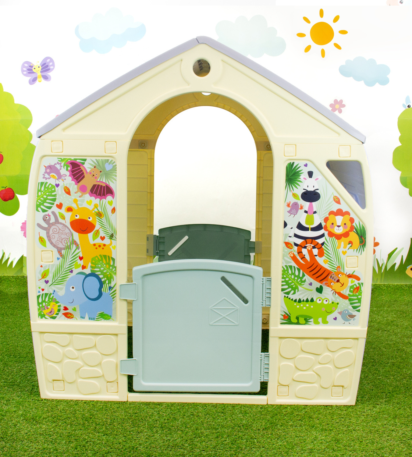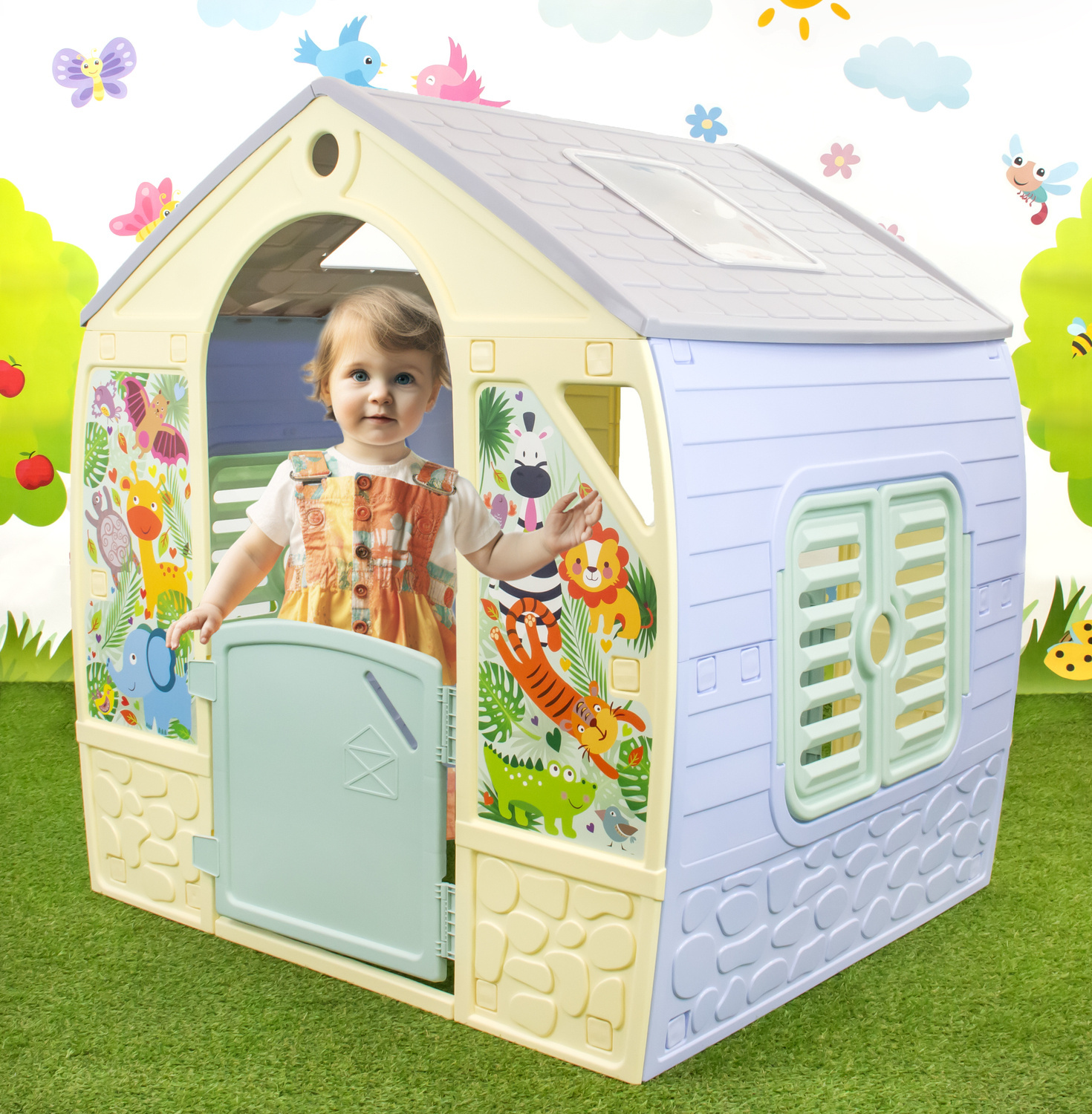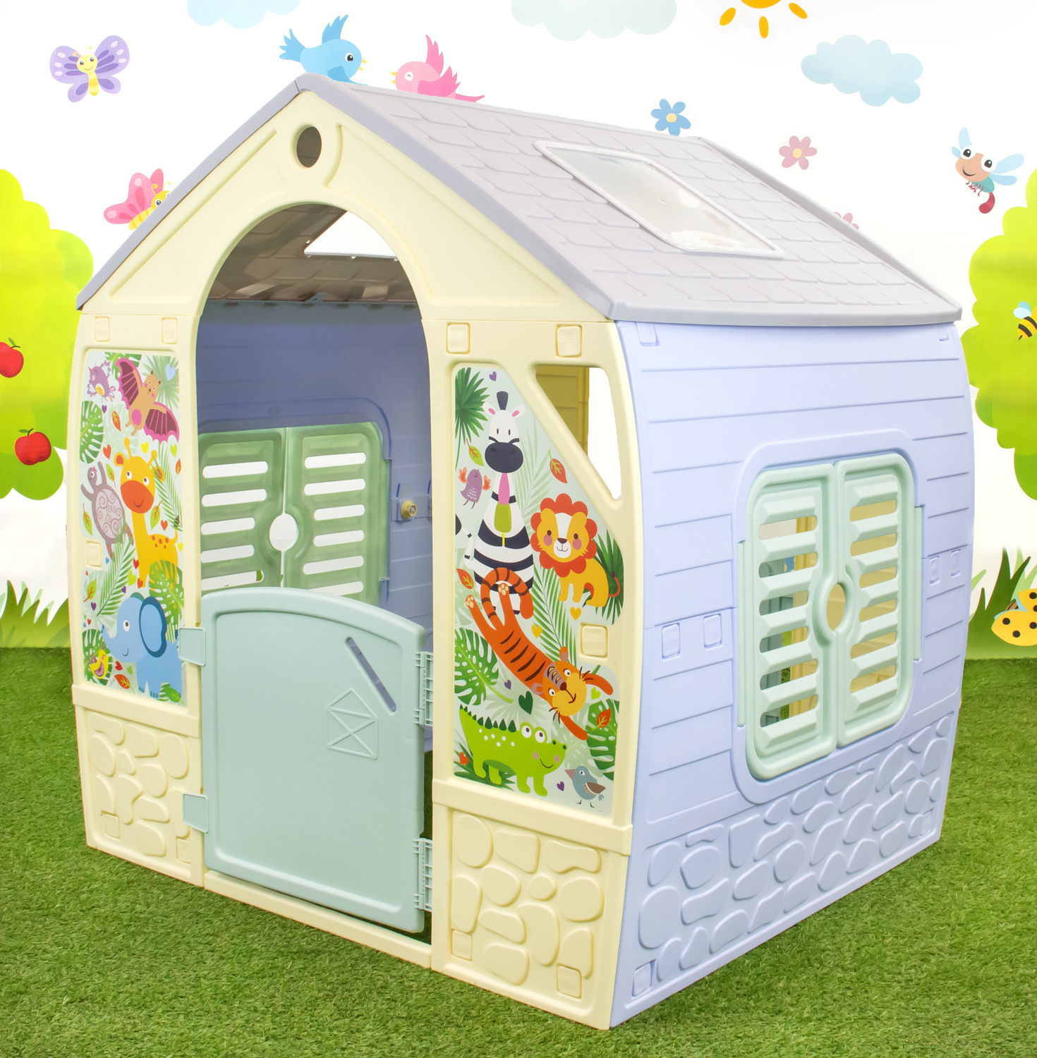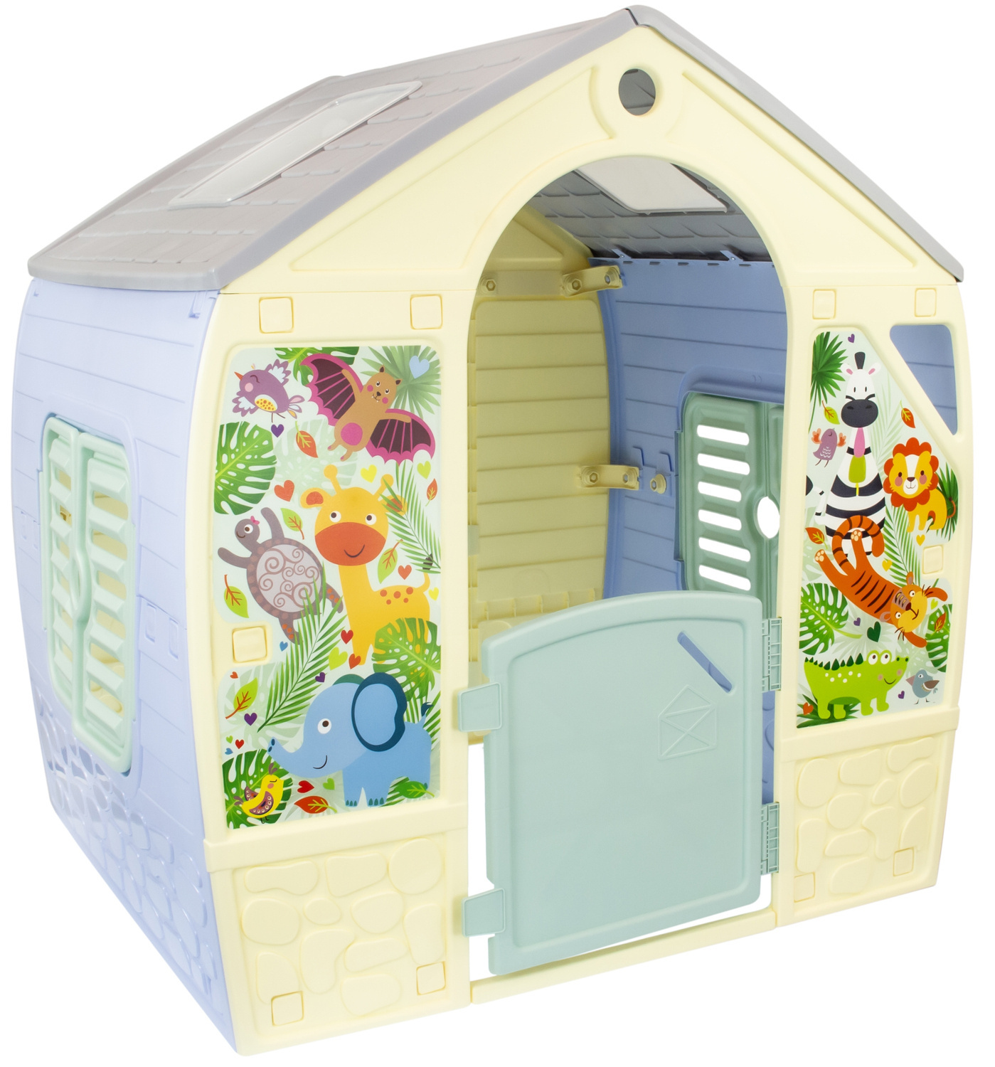 Domek ogrodowy stanie się ulubionym miejscem zabaw Twojej pociechy i jej przyjaciół. Oryginalnego charakteru nadaje mu modna, pastelowa kolorystyka i ściany ozdobione naklejkami zwierzątek prosto z safari, takie jak zebra, słoń, żyrafa, tygrys, aligator i inne. Domek ma otwierane okiennice i drzwi.
