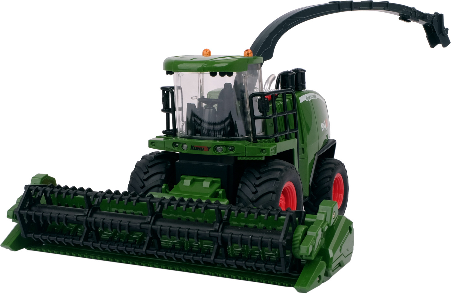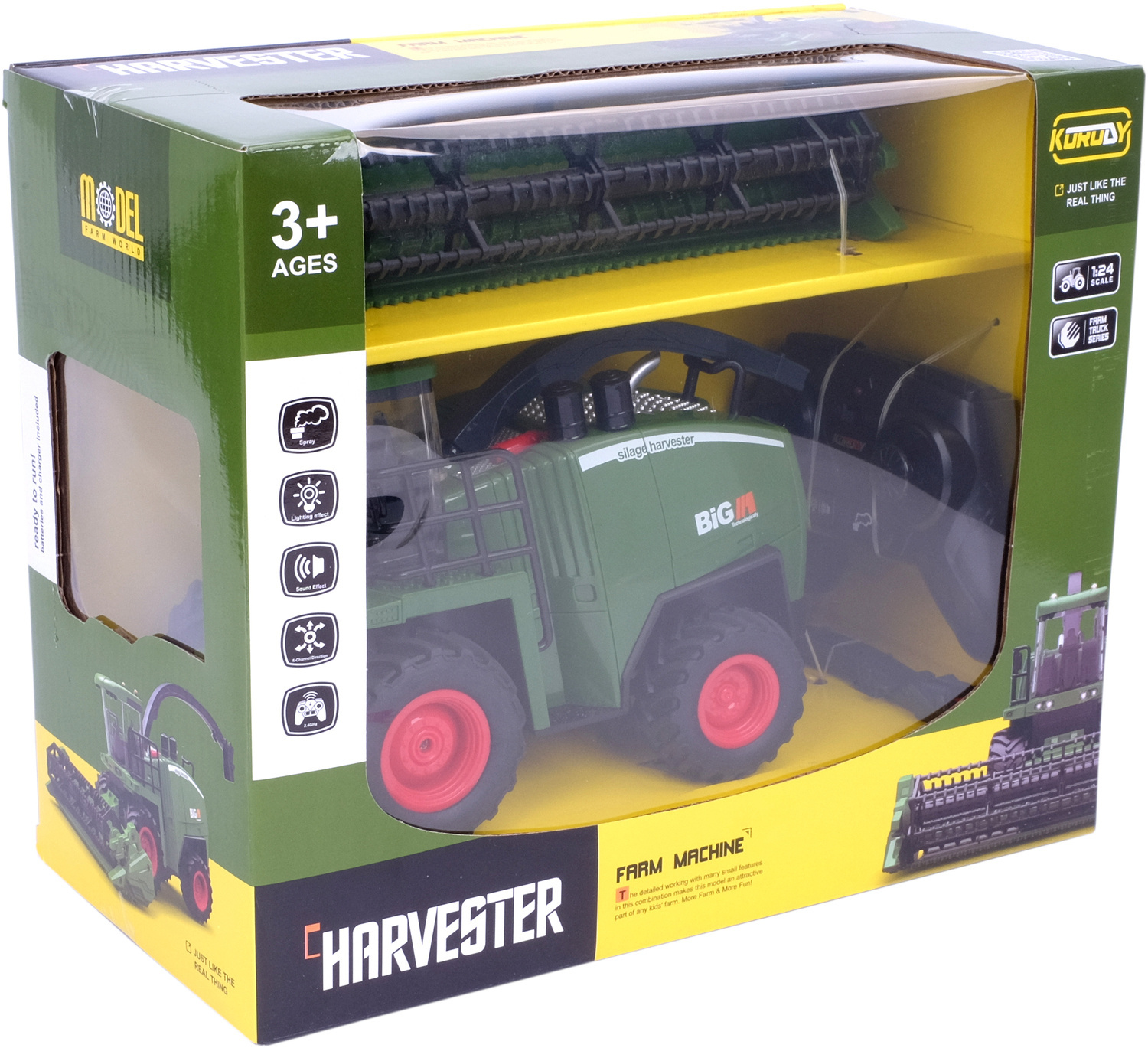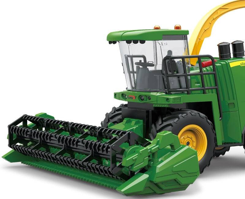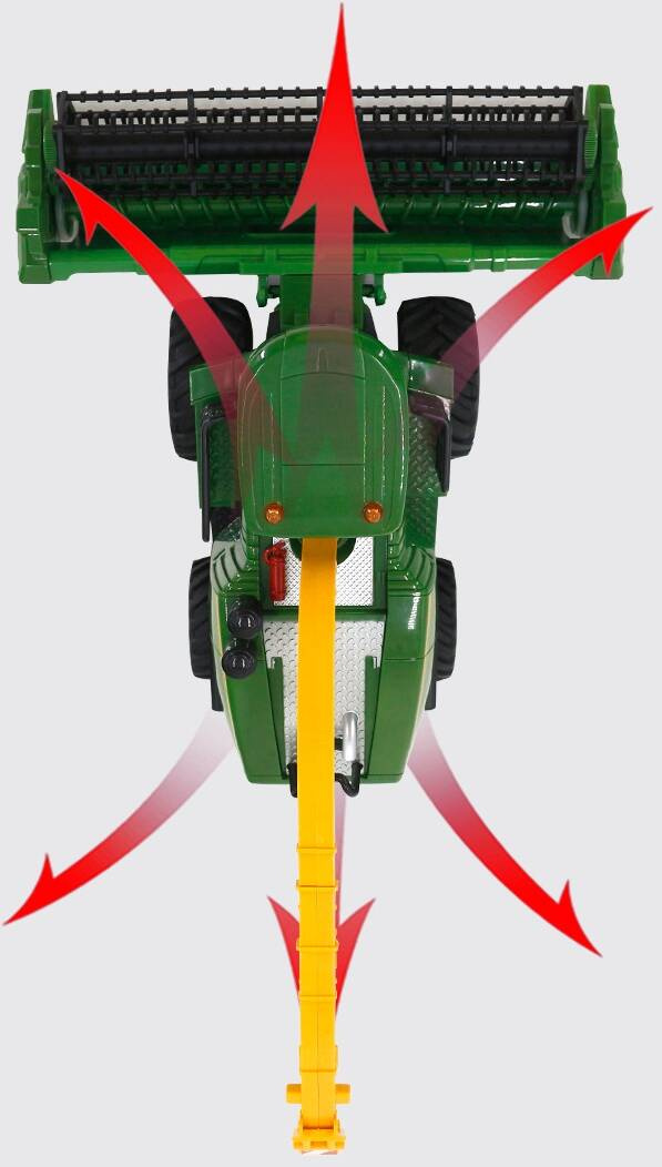 Kombajn ma tylny zaczep oraz możliwością dopinania i odpinania przyczepy. Pojazd posiada masywne, miękkie, gumowe z wysokim bieżnikiem koła co dodaje zabawce realizmu oraz ułatwia jazdę zarówno po podłodze w domu jak i na zewnątrz. Działające przednie światła oraz na dachu uruchamiane przyciskiem na pilocie zapewnia dodatkowe atrakcje podczas zabawy długimi wieczorami!