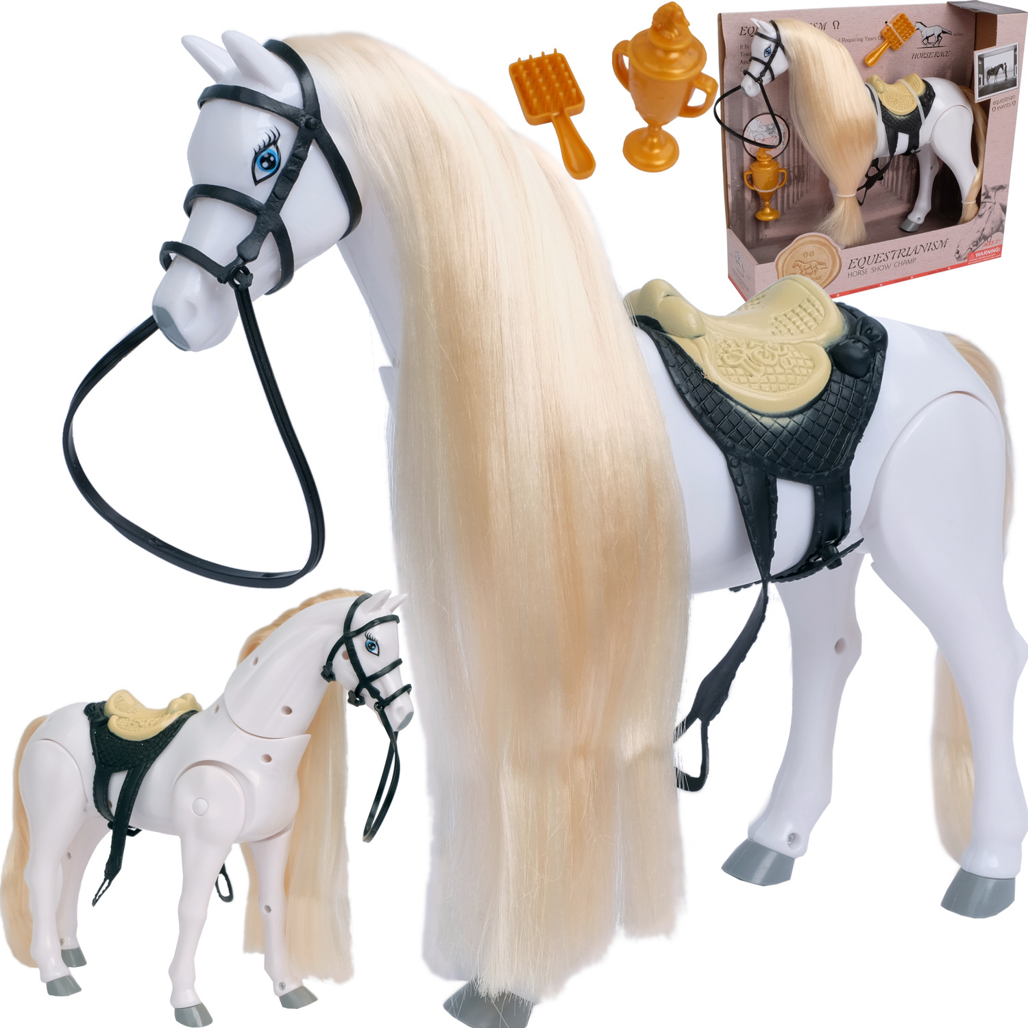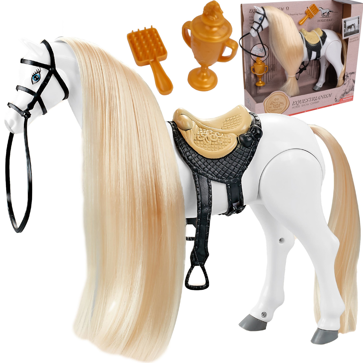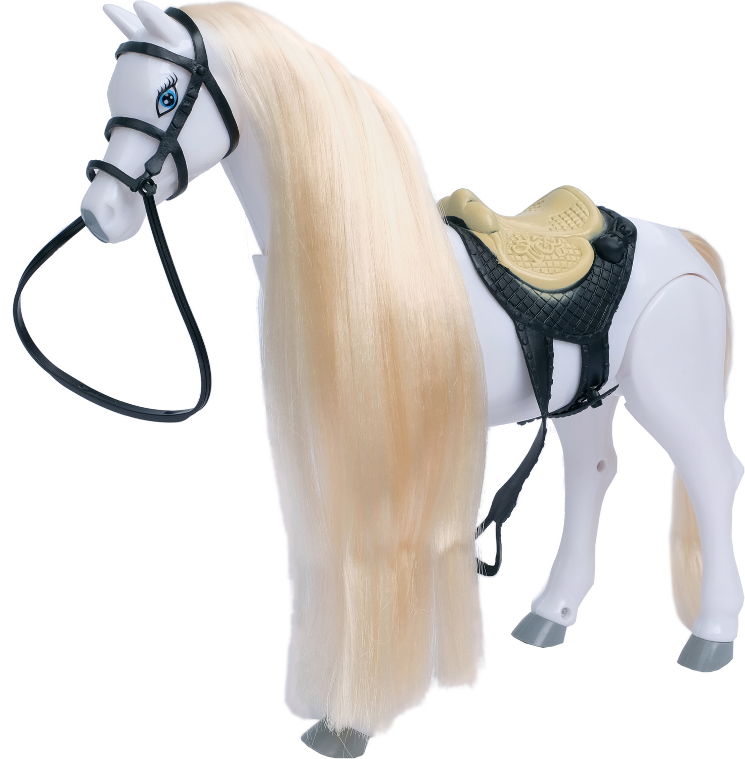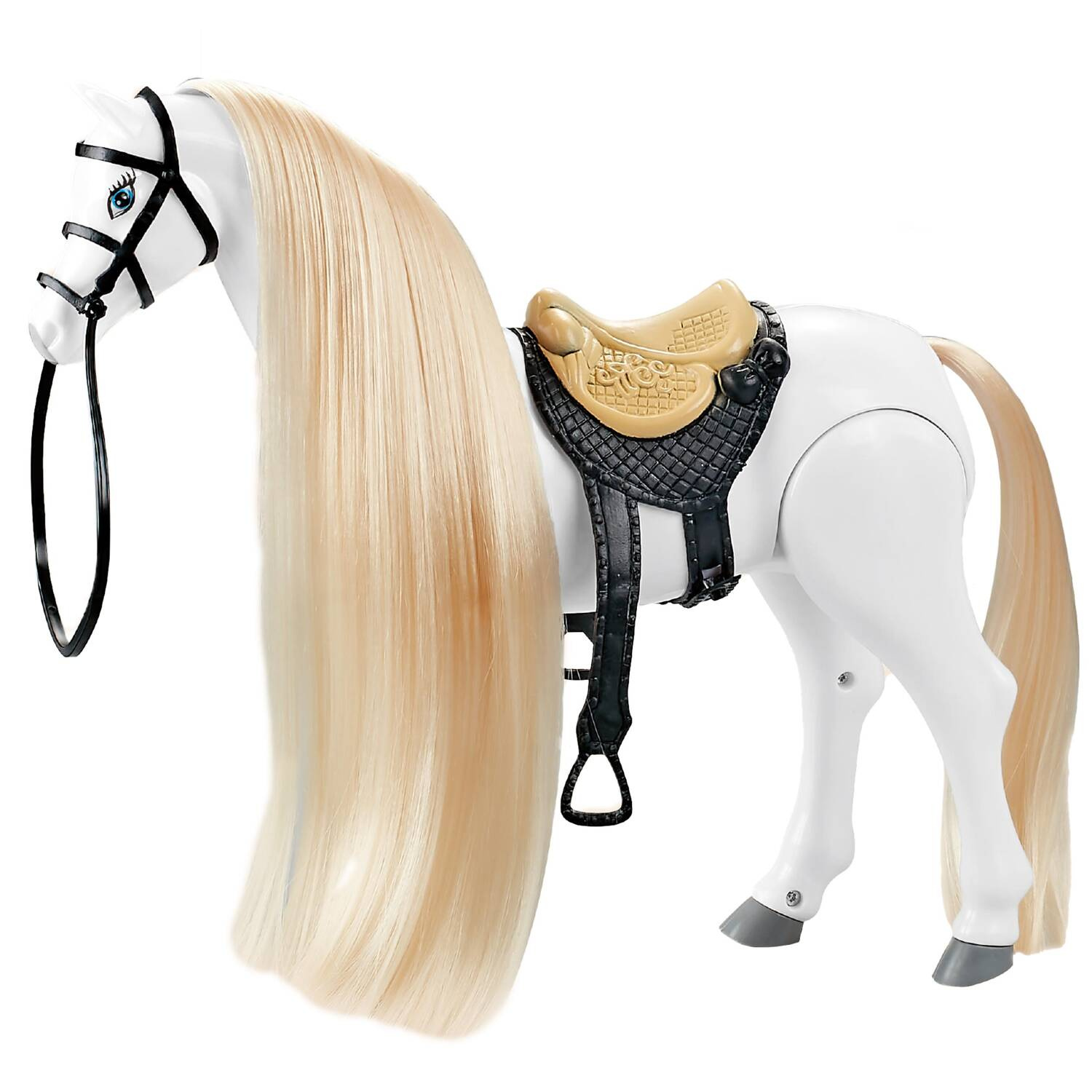 Przepiękny biały, połyskujący, długowłosy koń. Grzywa konika idealnie nadaje się do czesania i układania fryzur. Przesuń przełącznik na brzuchu, a koń zacznie wydawać odgłosy zupełnie jak prawdziwy i poruszać się do przodu.