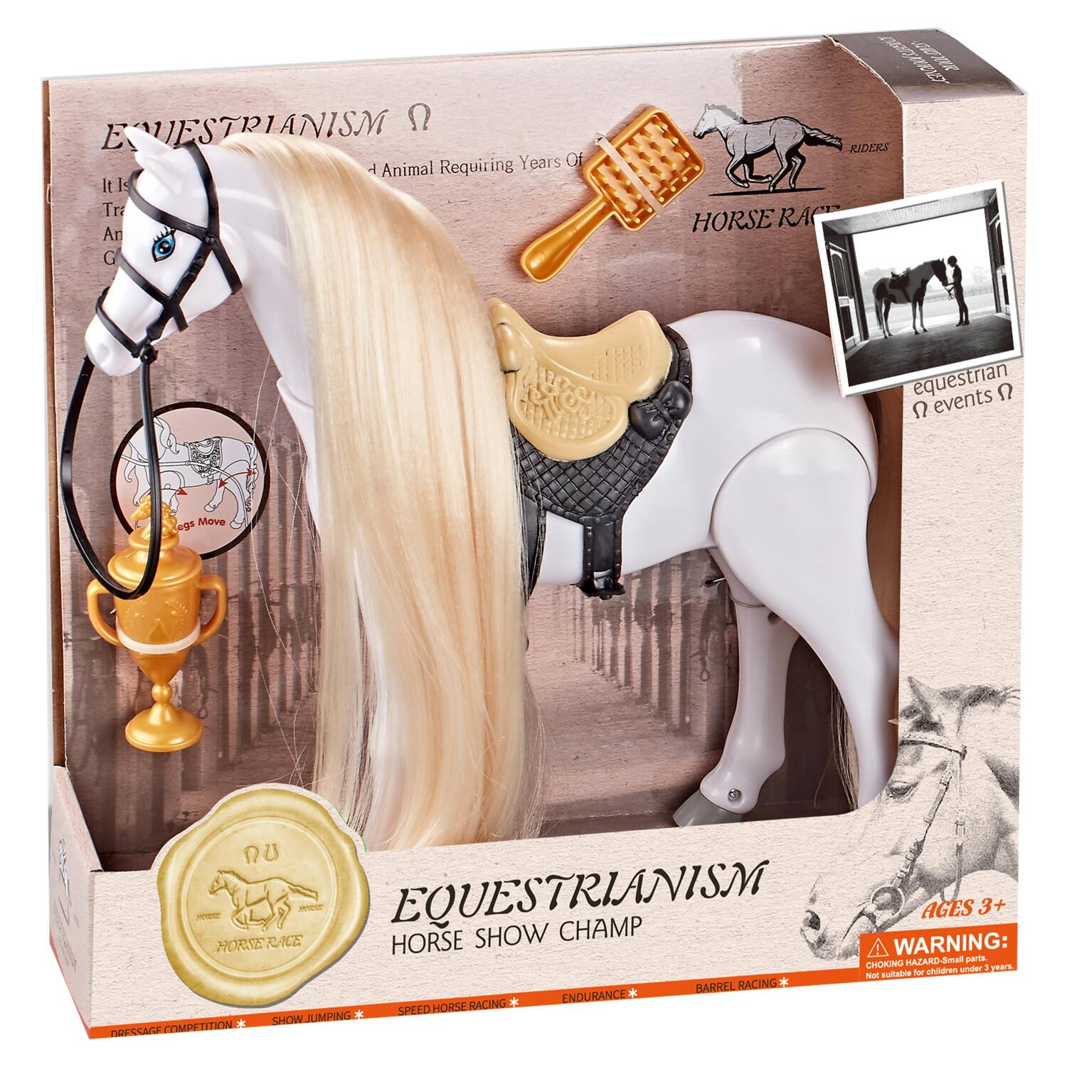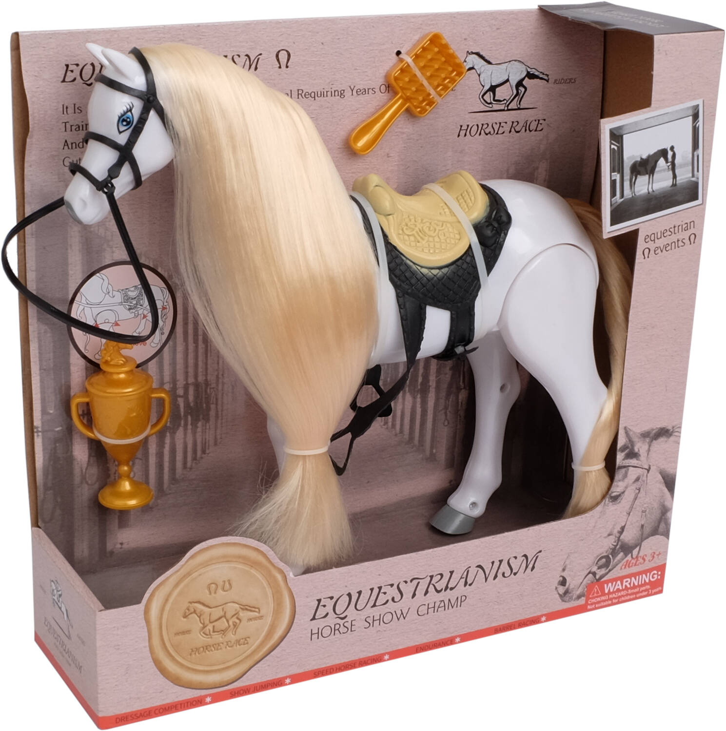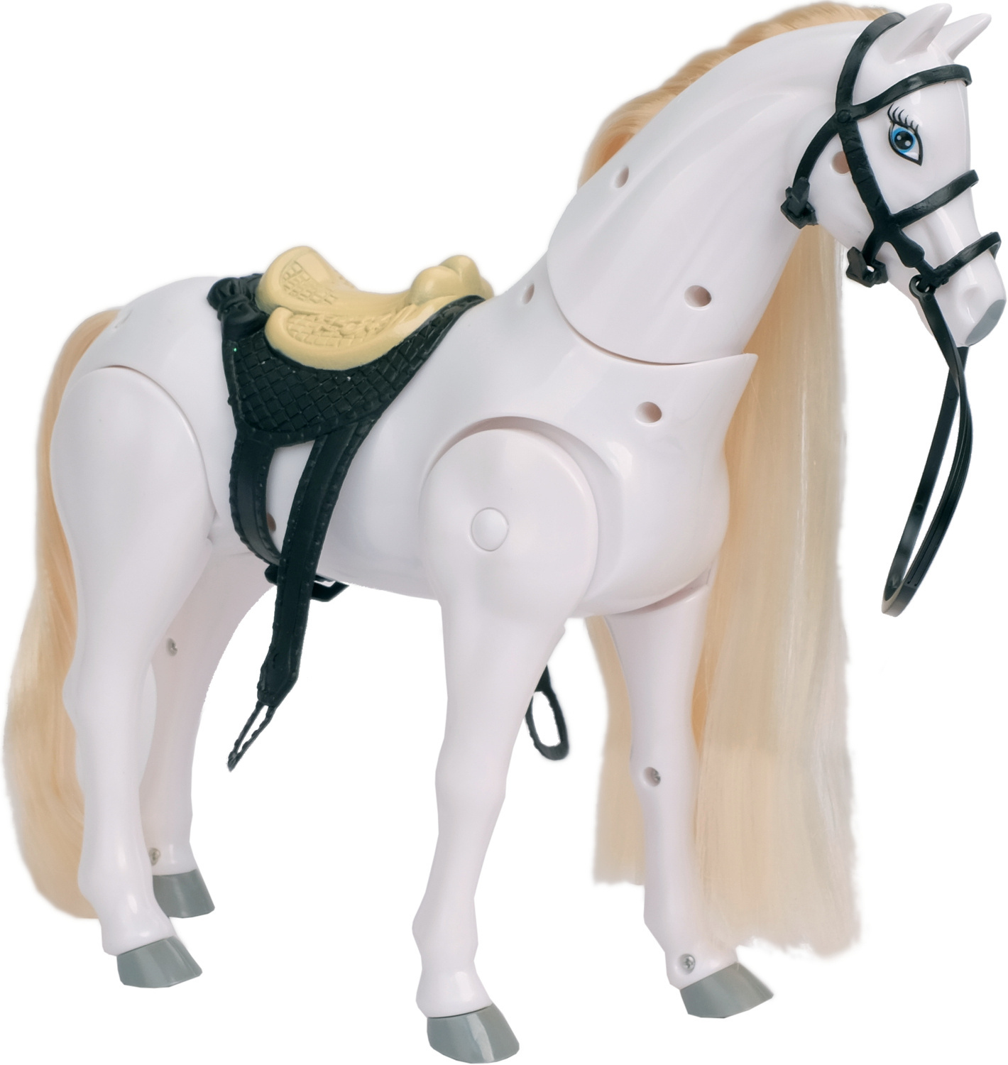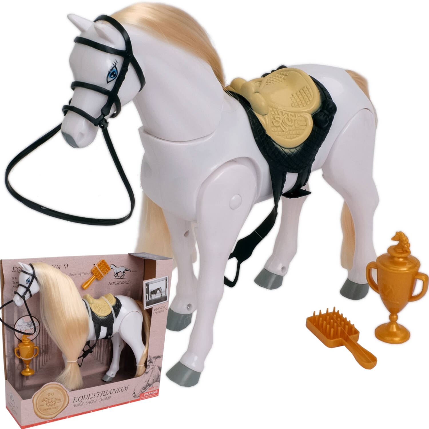 Przepiękny biały, połyskujący, długowłosy koń. Grzywa konika idealnie nadaje się do czesania i układania fryzur. Przesuń przełącznik na brzuchu, a koń zacznie wydawać odgłosy zupełnie jak prawdziwy i poruszać się do przodu.