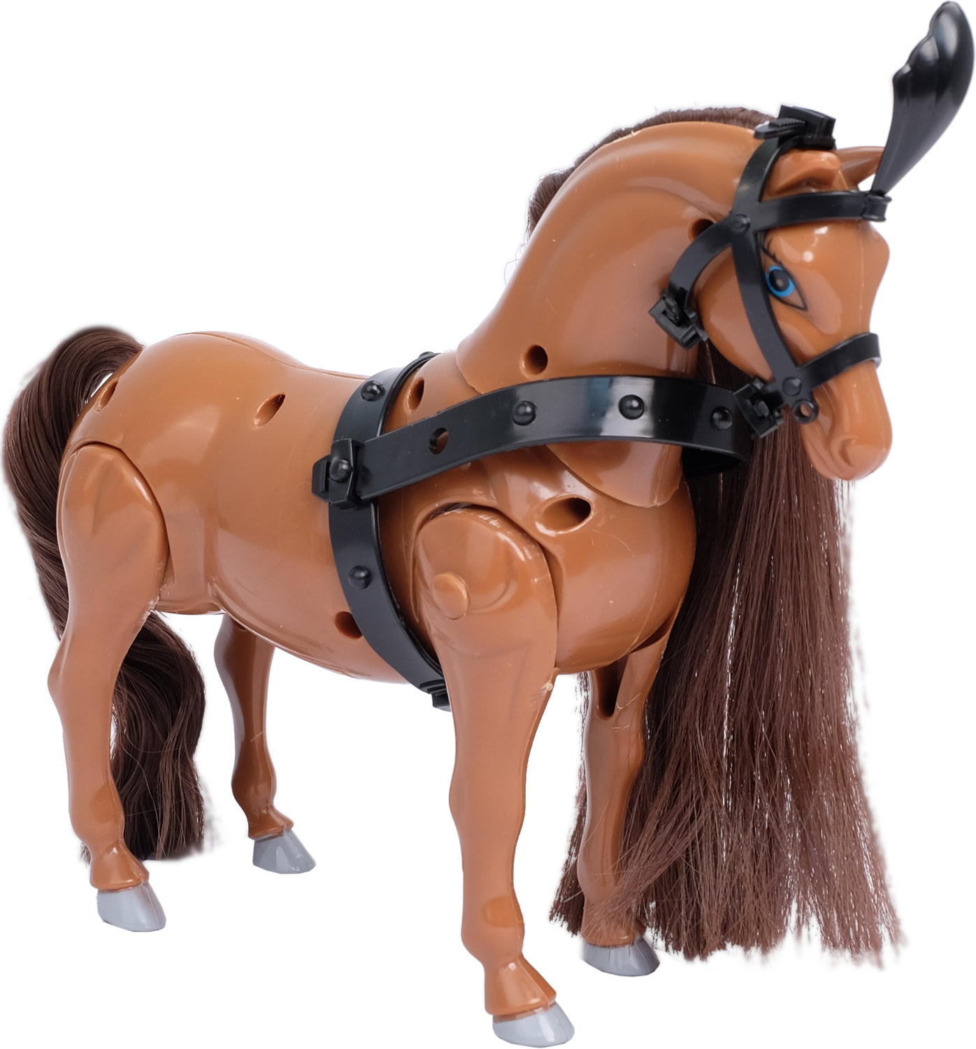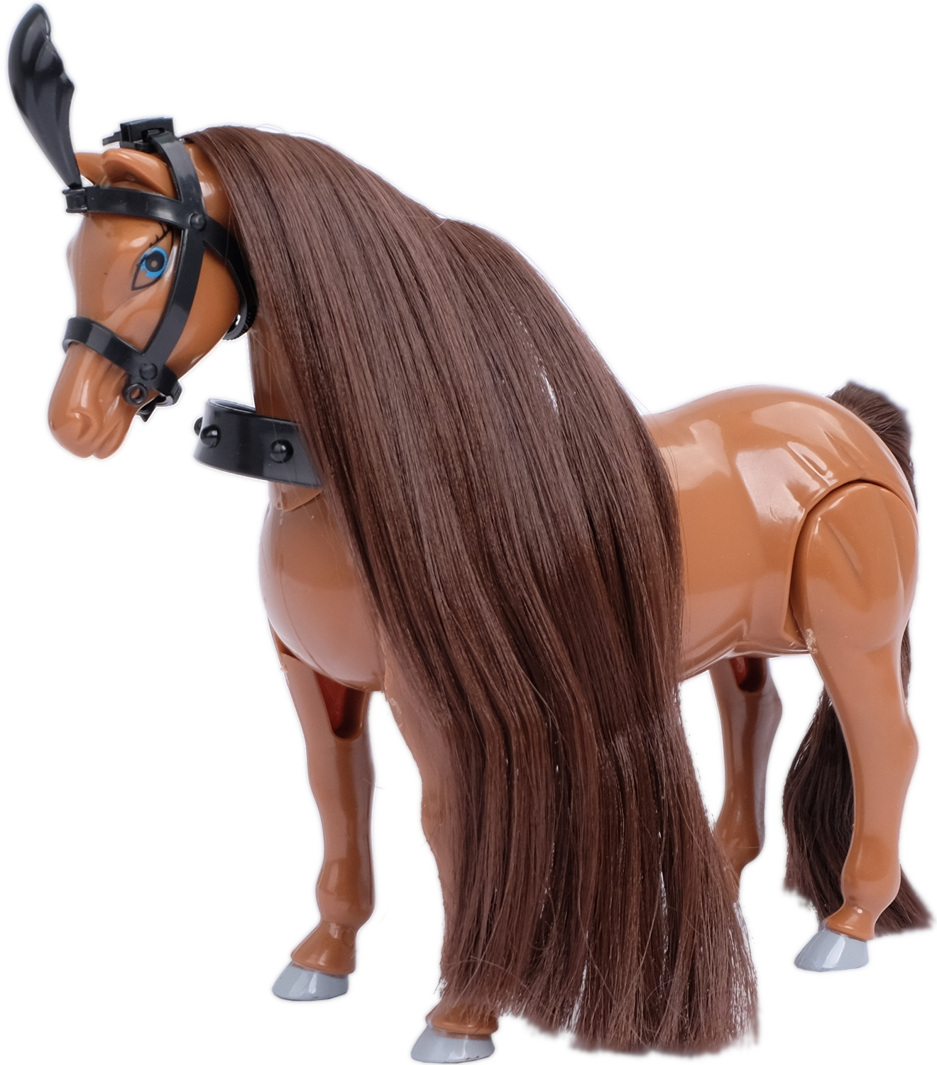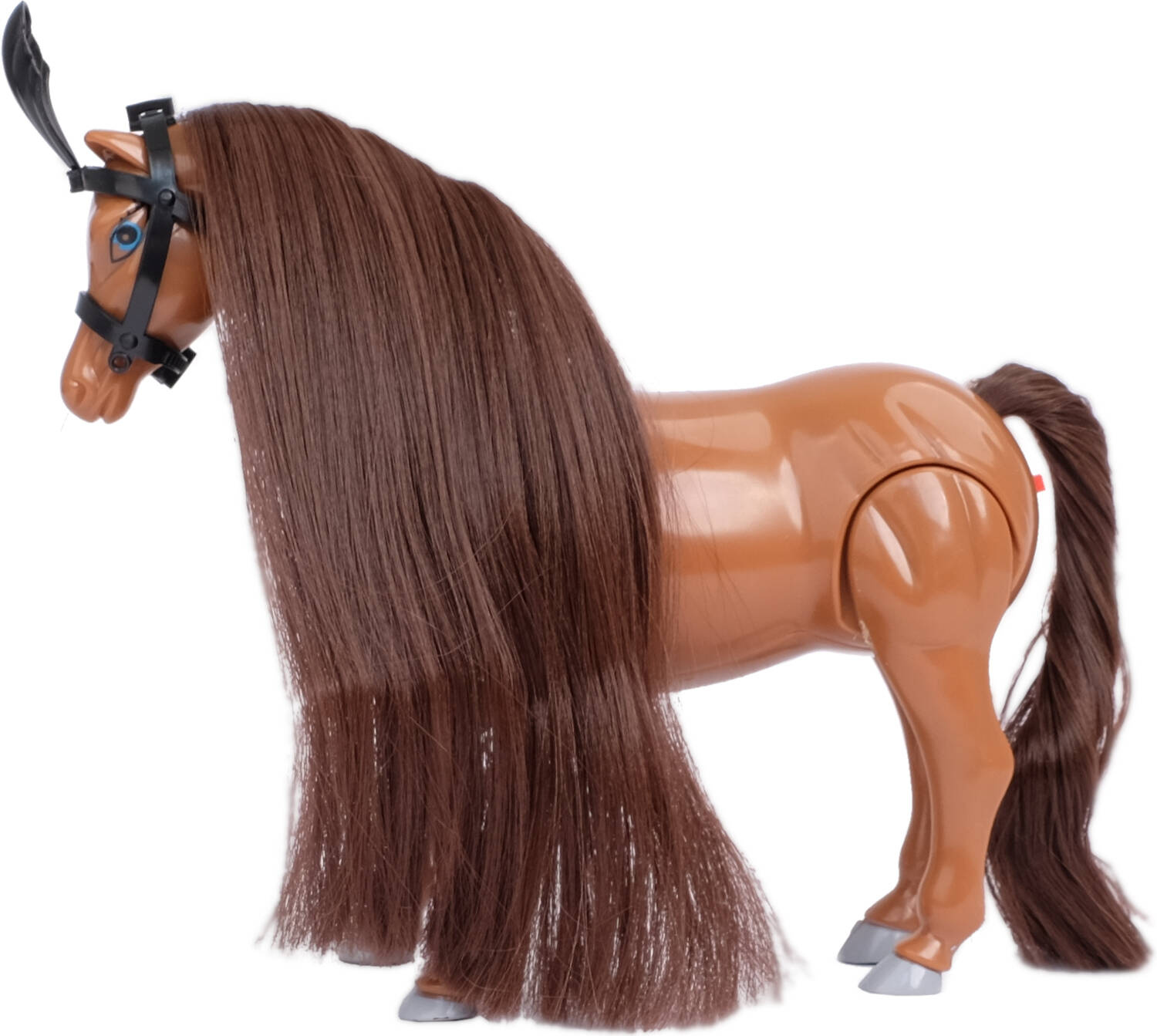 Przepiękny brązowy, połyskujący, długowłosy koń. Grzywa konika idealnie nadaje się do czesania i układania fryzur. Przesuń przełącznik na brzuchu, a koń zacznie wydawać odgłosy zupełnie jak prawdziwy i poruszać się do przodu.