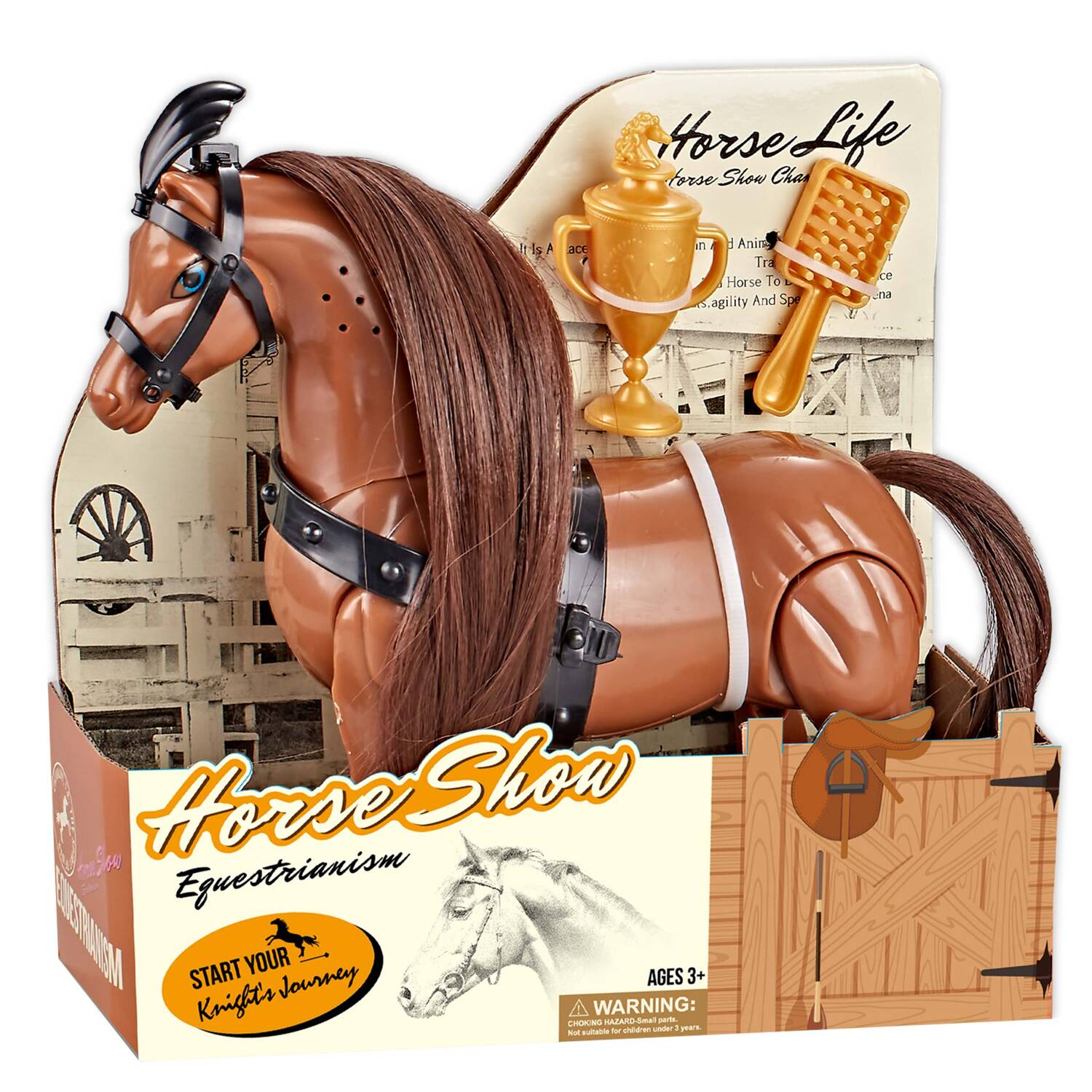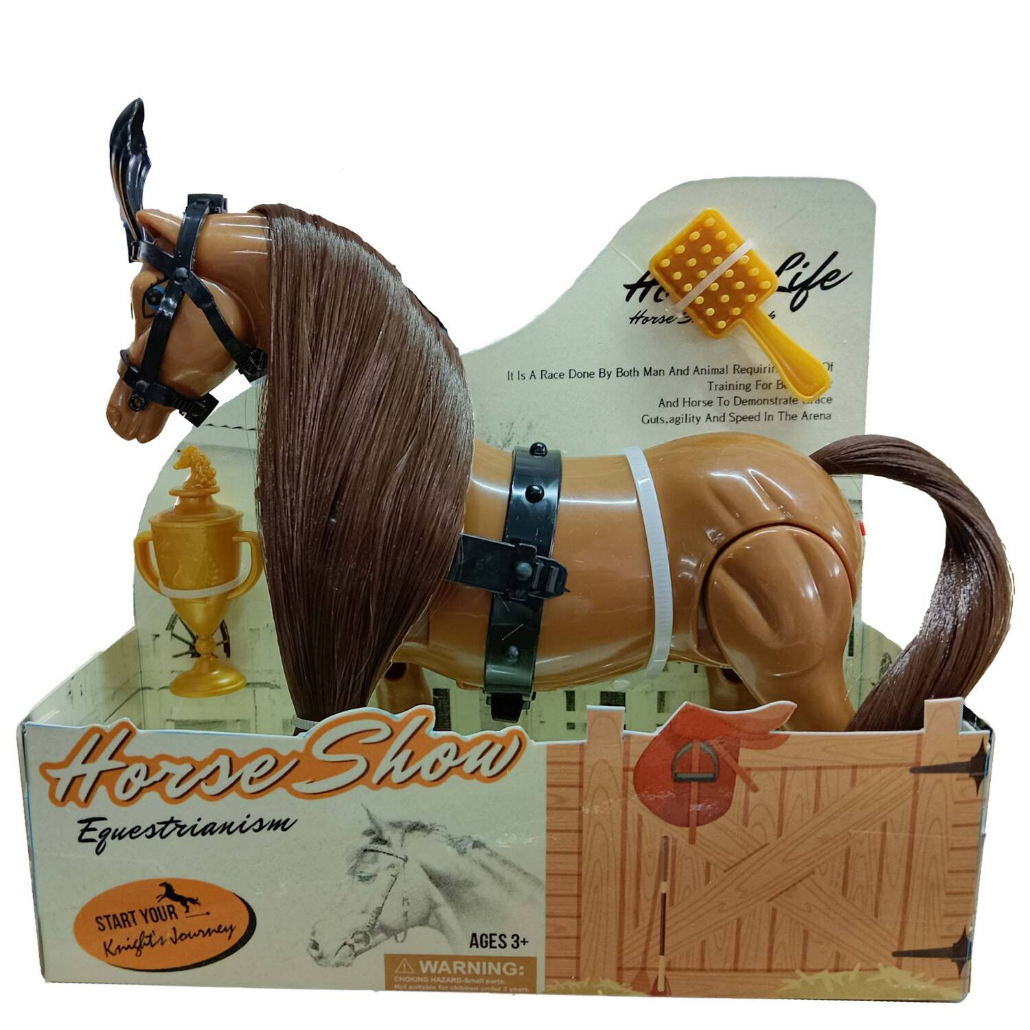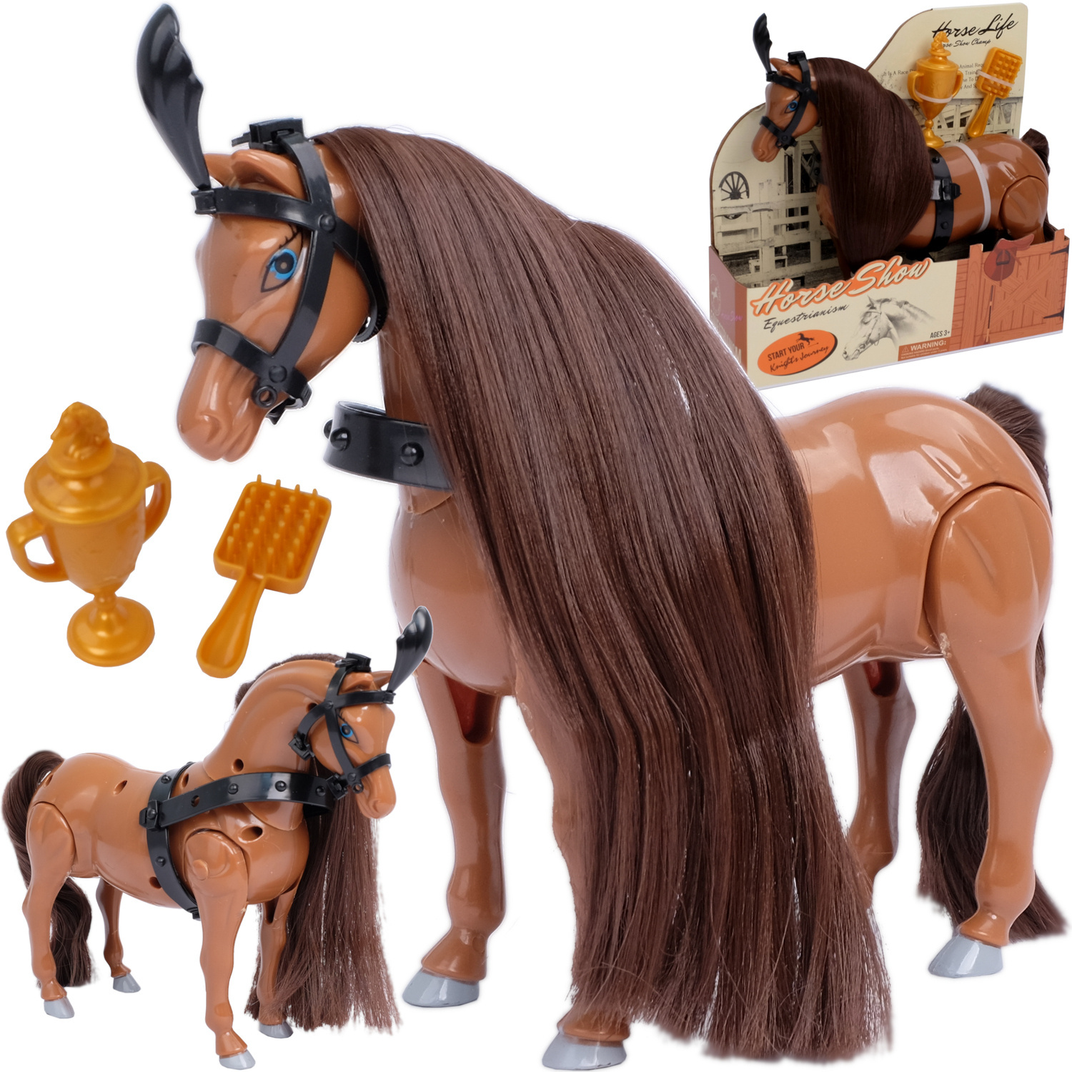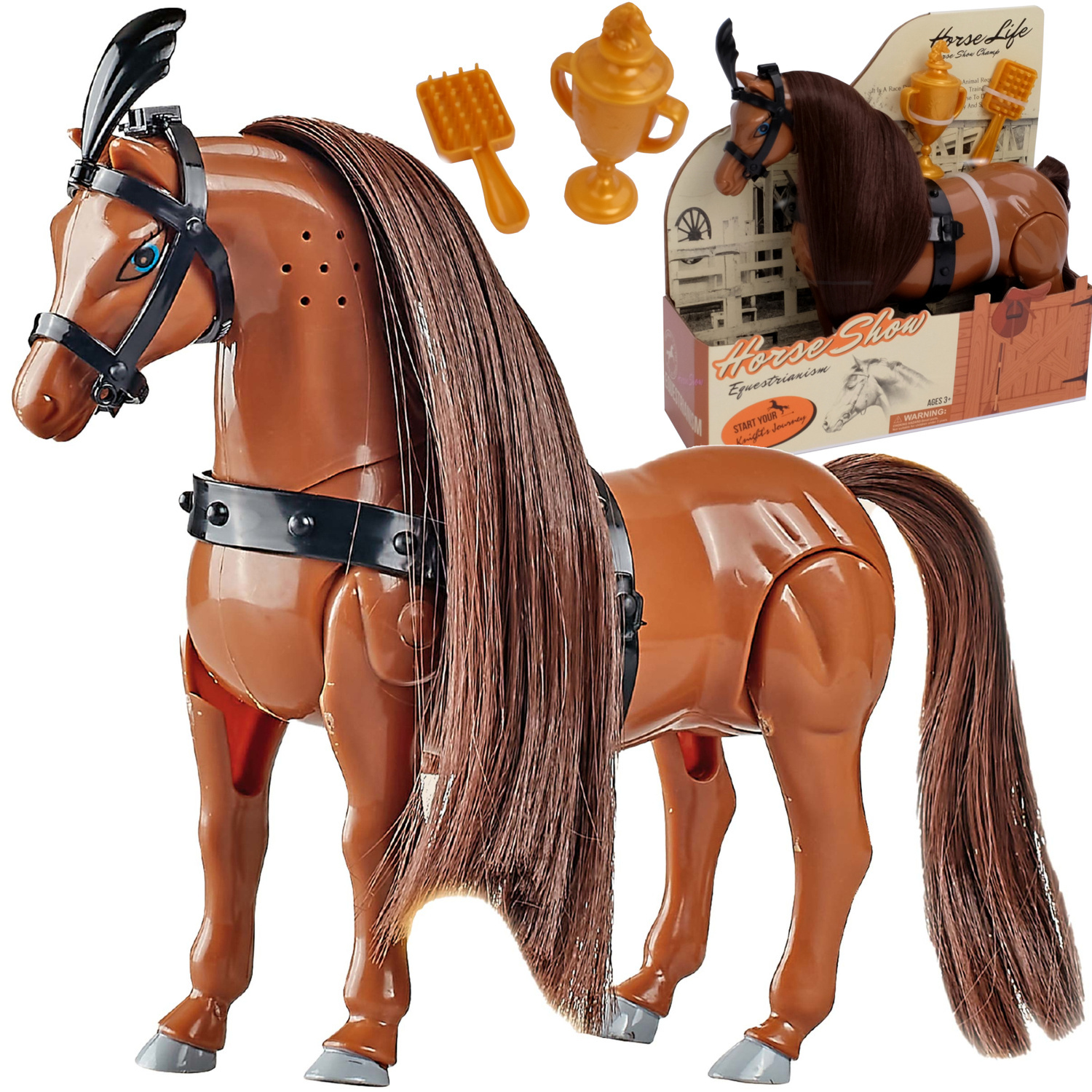 Przepiękny brązowy, połyskujący, długowłosy koń. Grzywa konika idealnie nadaje się do czesania i układania fryzur. Przesuń przełącznik na brzuchu, a koń zacznie wydawać odgłosy zupełnie jak prawdziwy i poruszać się do przodu.