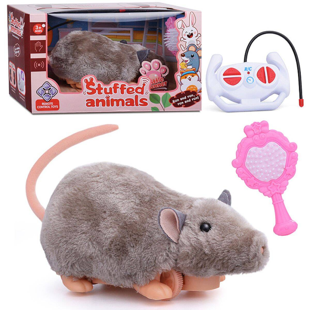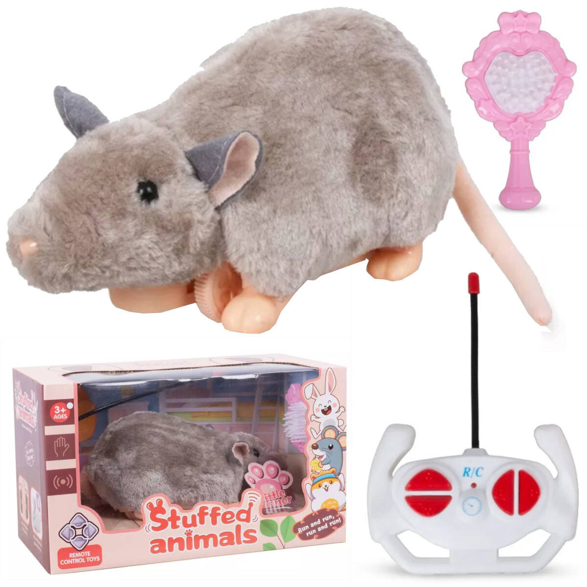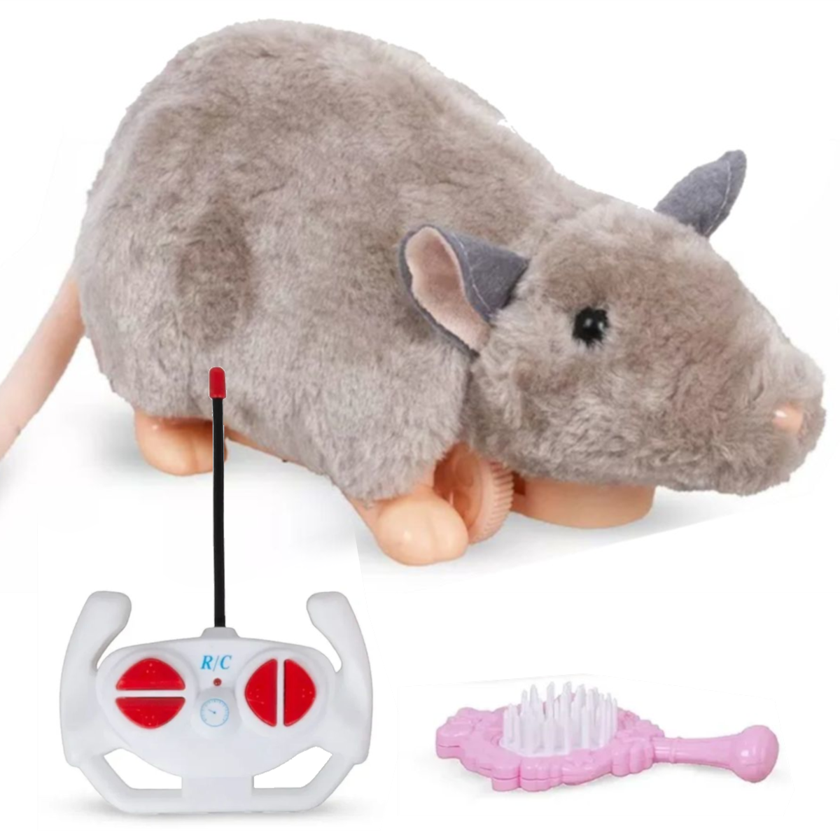 To zabawkowa mysz sterowana zdalnie, wygląda jak prawdziwa. Jest pokryta miękkim, szarym futerkiem, a jej ogon i nogi są cieliste, co dodaje jej realistycznego wyglądu. W zestawie znajduje się pilot zdalnego sterowania, przypominający pada do gier, z długą anteną i czterema czerwonymi przyciskami do kontrolowania ruchu myszy.