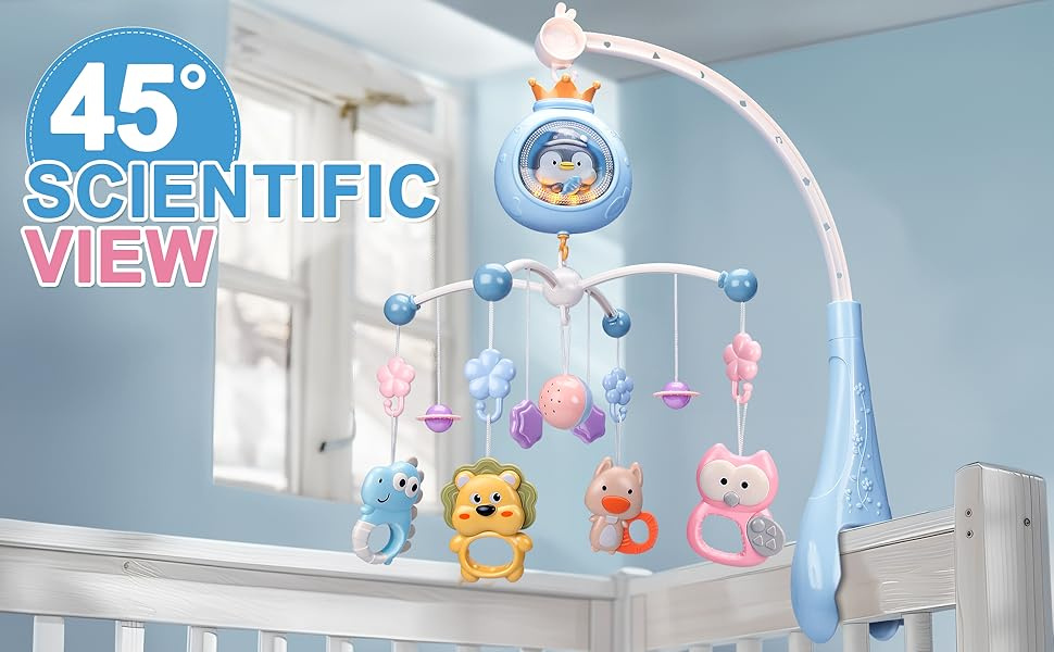 Przymocuj karuzelkę i popatrz, jak Twoje dziecko z fascynacją podąża wzrokiem za ruchami uroczych zawieszek a kojąca muzyka czaruje je do snu. Zawieszki radośnie zwisają z nieba wirując i zachęcając bobasa do wyciągania ku nim rączek oraz absorbując jego uwagę jednocześnie rozwijając zdolności koordynacji wzrokowej.