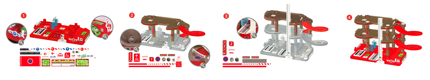 Wjedź windą na dach garażu i zaparkuj na swoim miejscu parkingowym - z powrotem autko może pomknąć w dół spiralnym zjazdem. Gdy będziesz miał problemy z autem na parkingu znajdziesz warsztat samochodowy. Tam otrzymasz profesjonalną pomoc, a miły mechanik szybko naprawi Twoje autko. Autko naprawione i gotowe do podróży? Teraz pozostaje tylko umyć je w myjni, by lśniło czystością. Jest też bar.