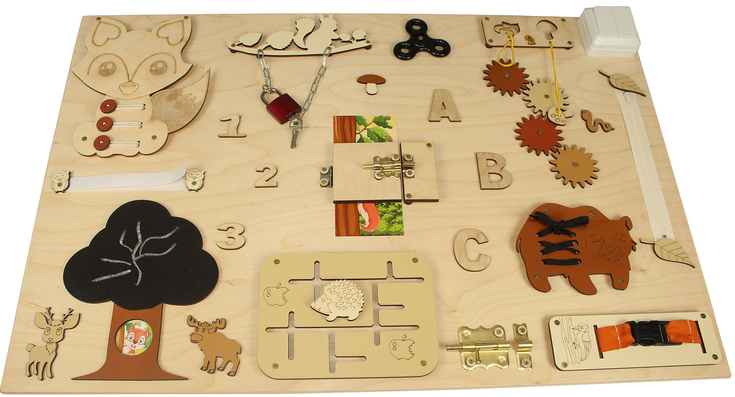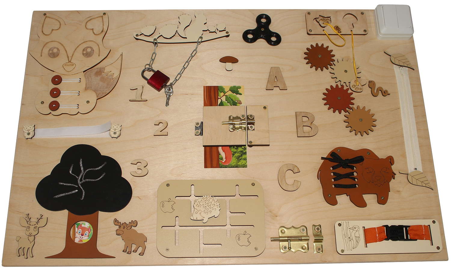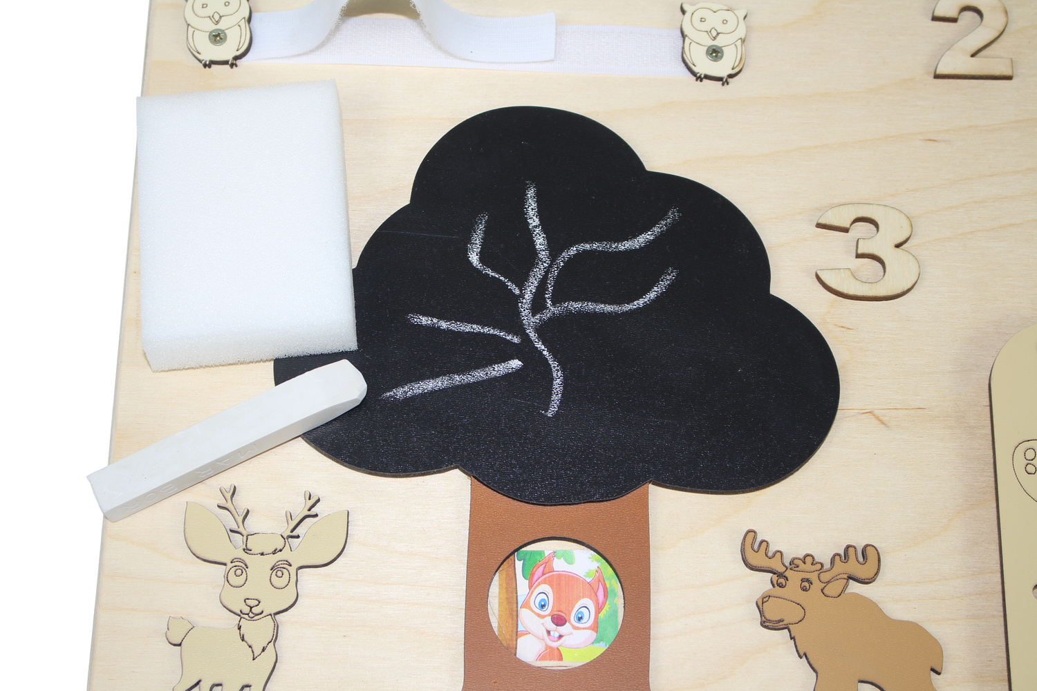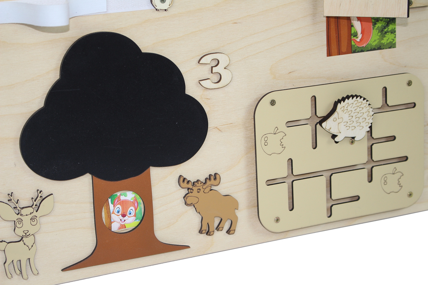 Cała tablica wykonana jest w motywie zwierzątek żyjących w lesie, Znajdziemy na niej m.in. łosia, jelonka, jeża, lisa czy niedźwiedzia. W tablicy znajduje się niespodzianka - jedno zwierzątko jest ukryte za drzwiczkami z zasuwką.