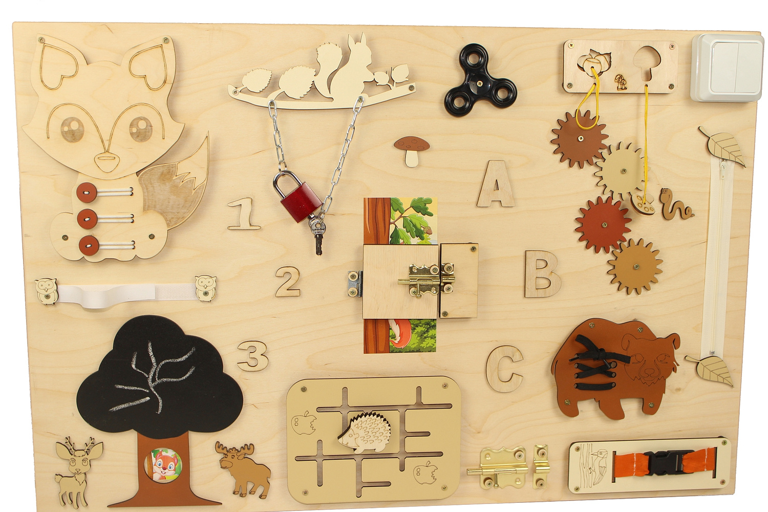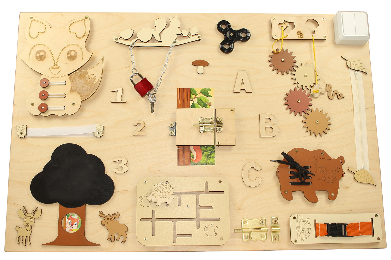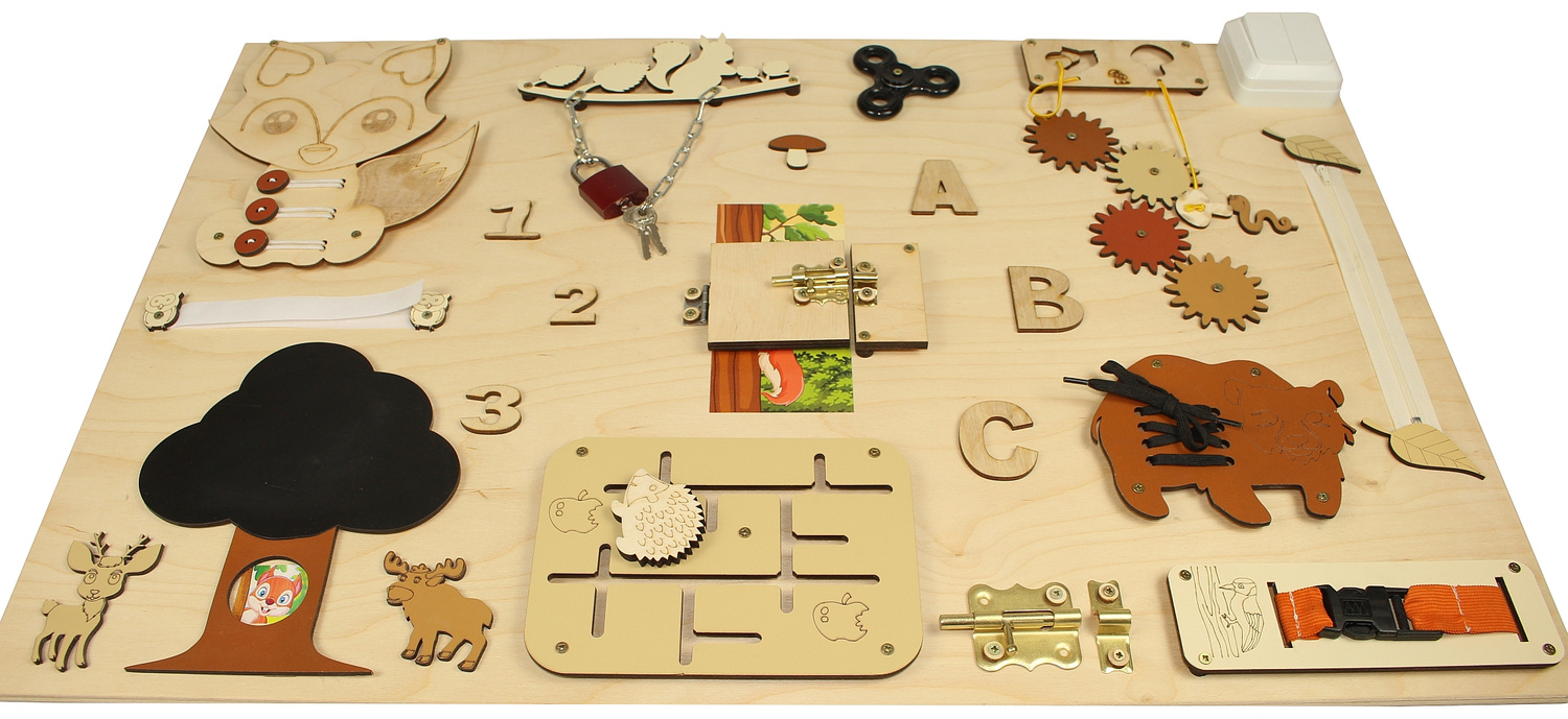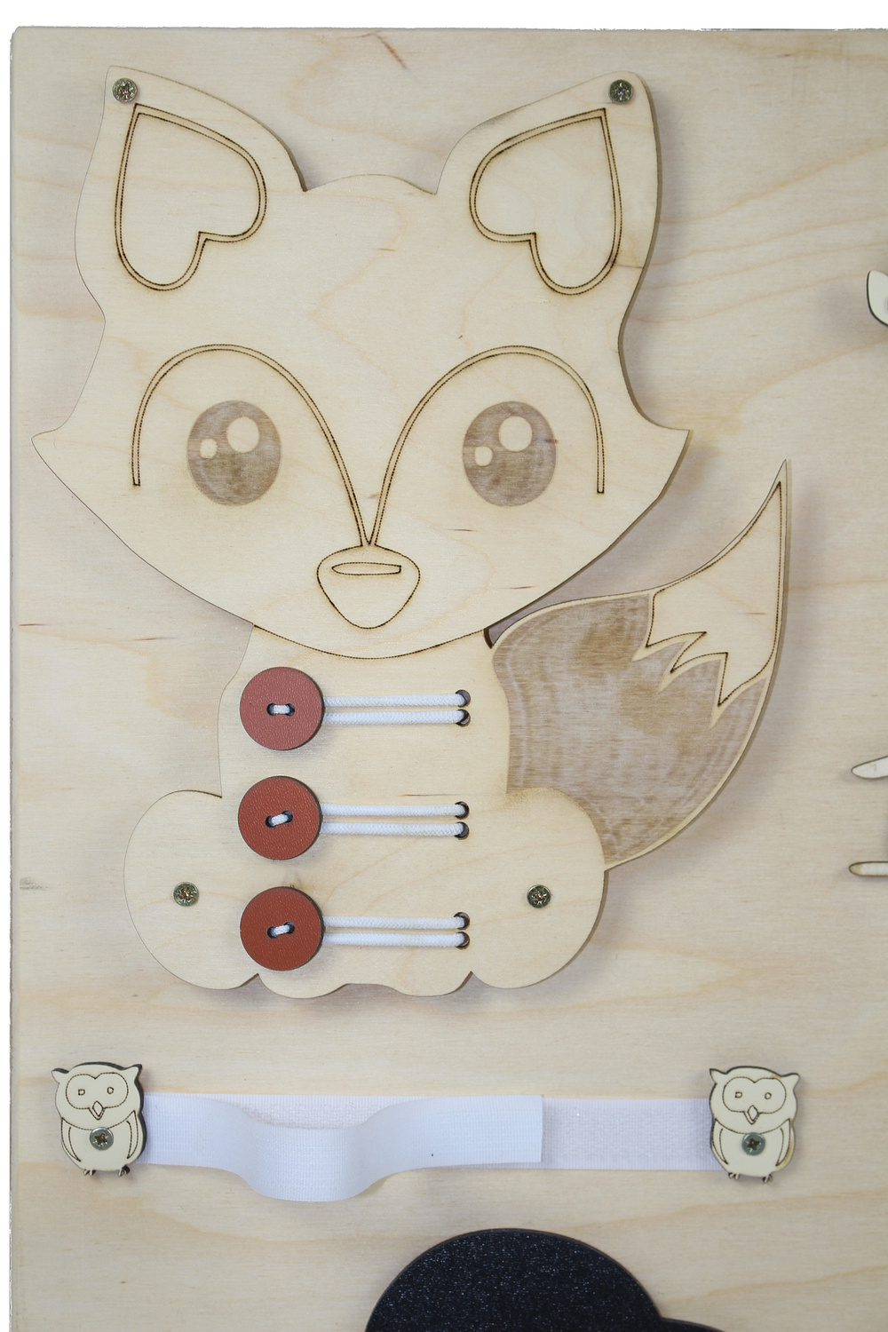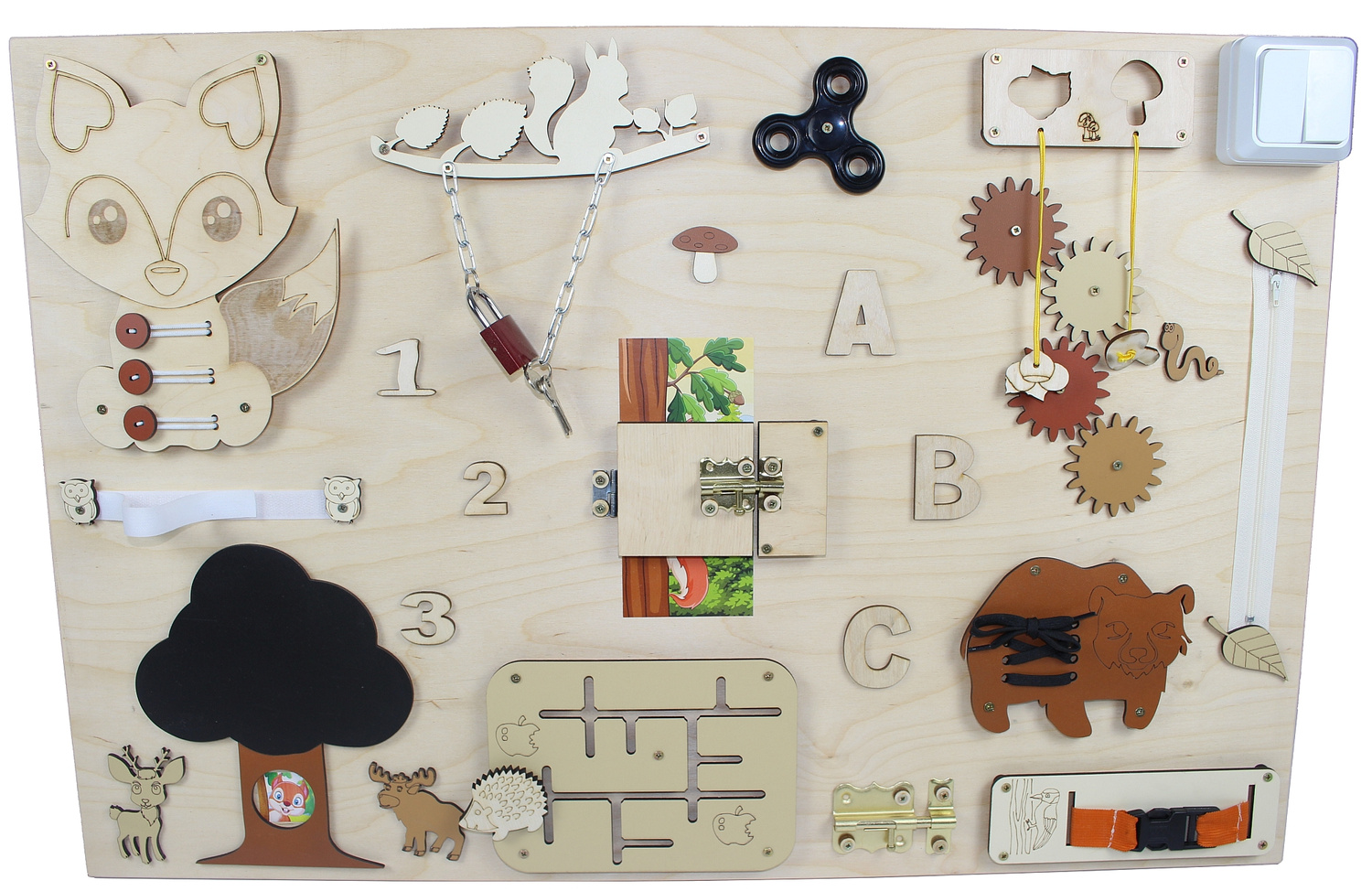 Cała tablica wykonana jest w motywie zwierzątek żyjących w lesie, Znajdziemy na niej m.in. łosia, jelonka, jeża, lisa czy niedźwiedzia. W tablicy znajduje się niespodzianka - jedno zwierzątko jest ukryte za drzwiczkami z zasuwką.