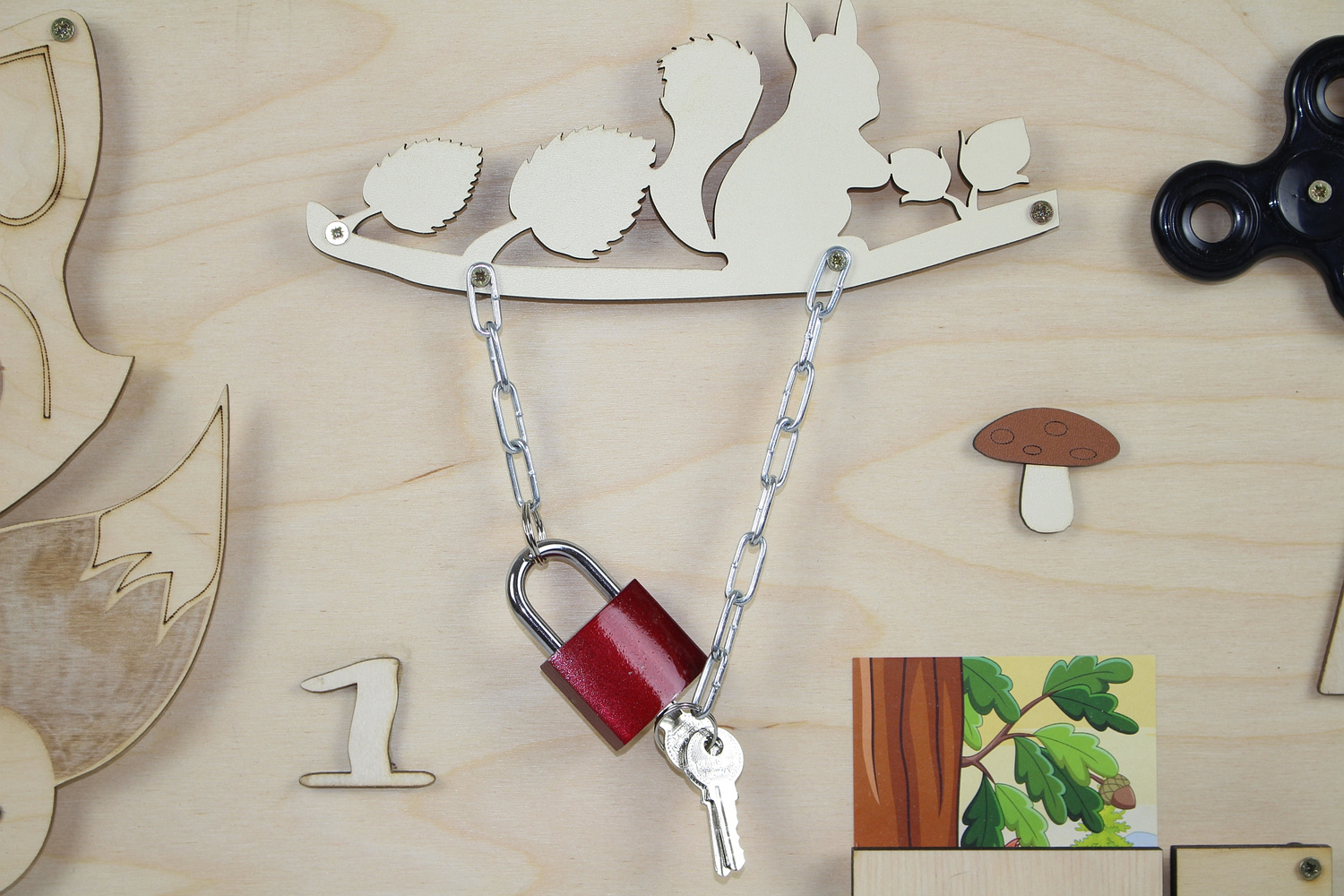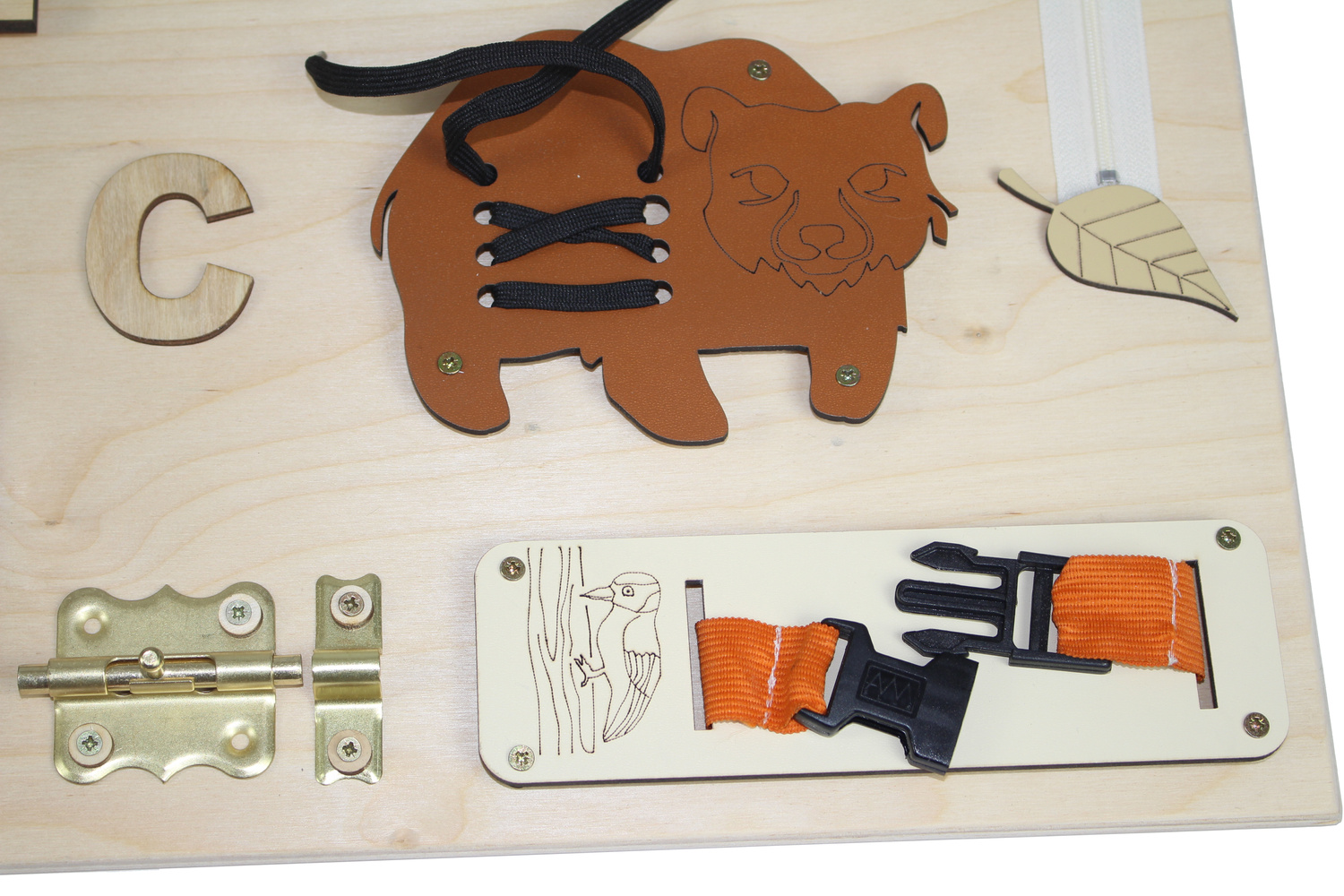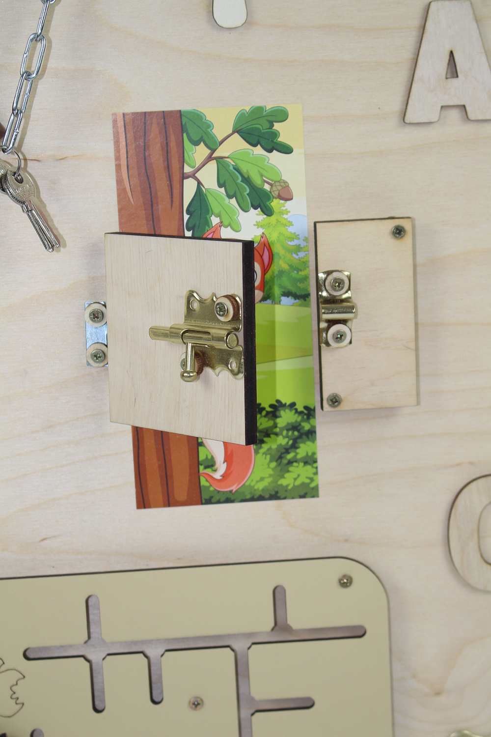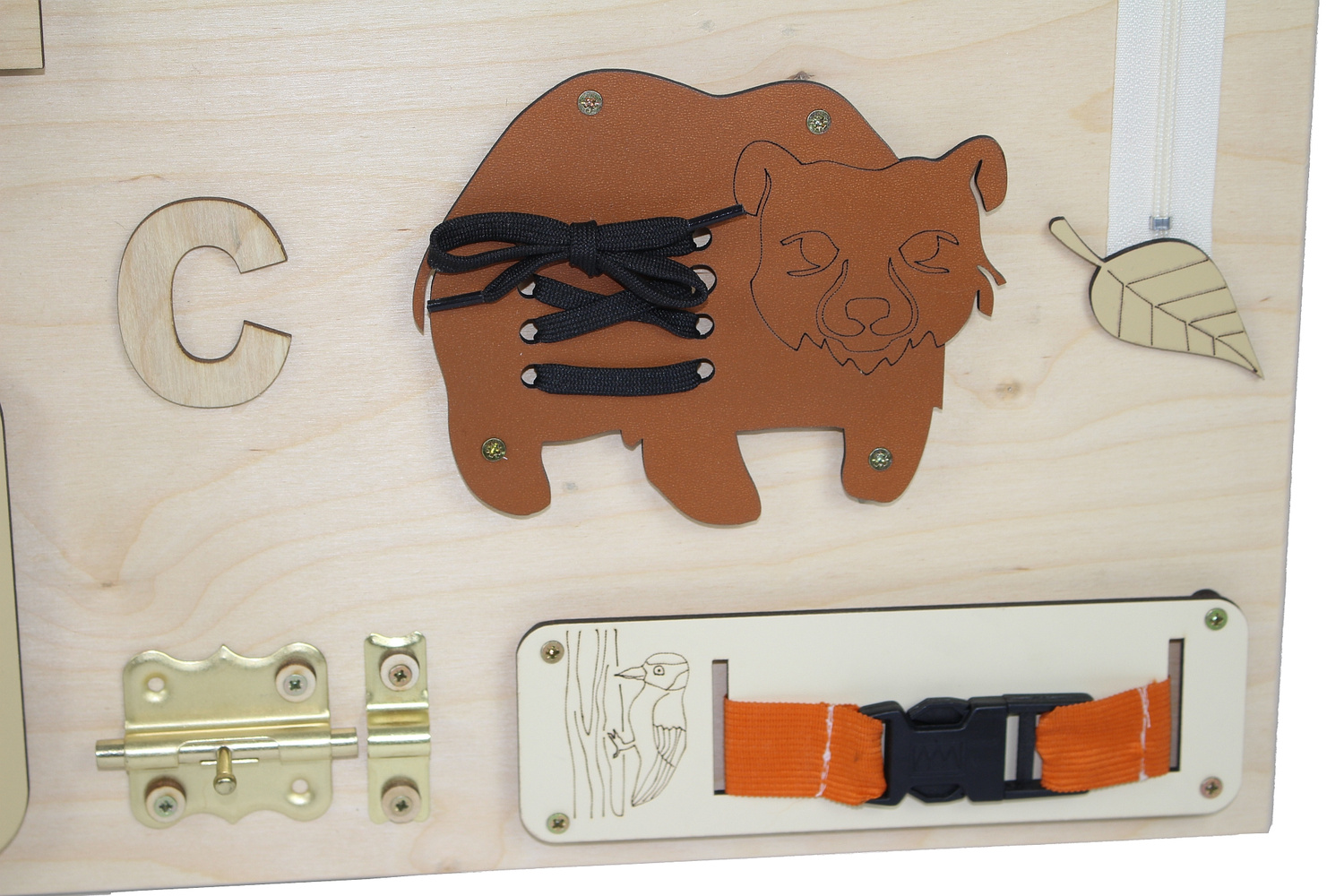 Cała tablica wykonana jest w motywie zwierzątek żyjących w lesie, Znajdziemy na niej m.in. łosia, jelonka, jeża, lisa czy niedźwiedzia. W tablicy znajduje się niespodzianka - jedno zwierzątko jest ukryte za drzwiczkami z zasuwką.