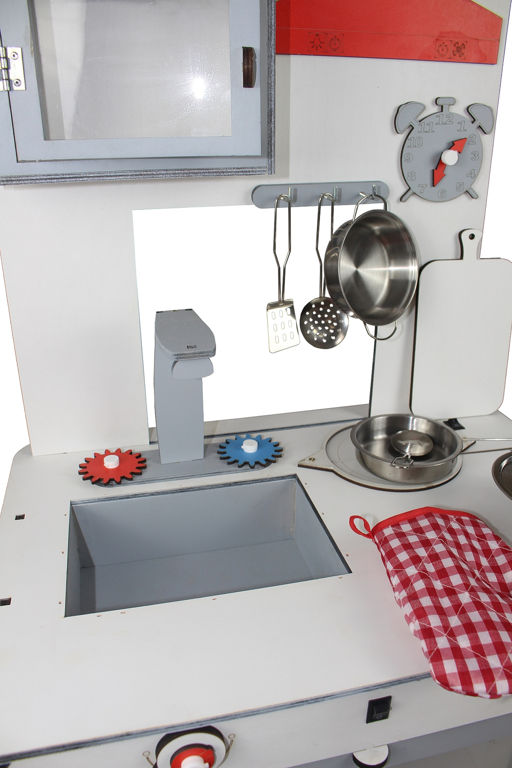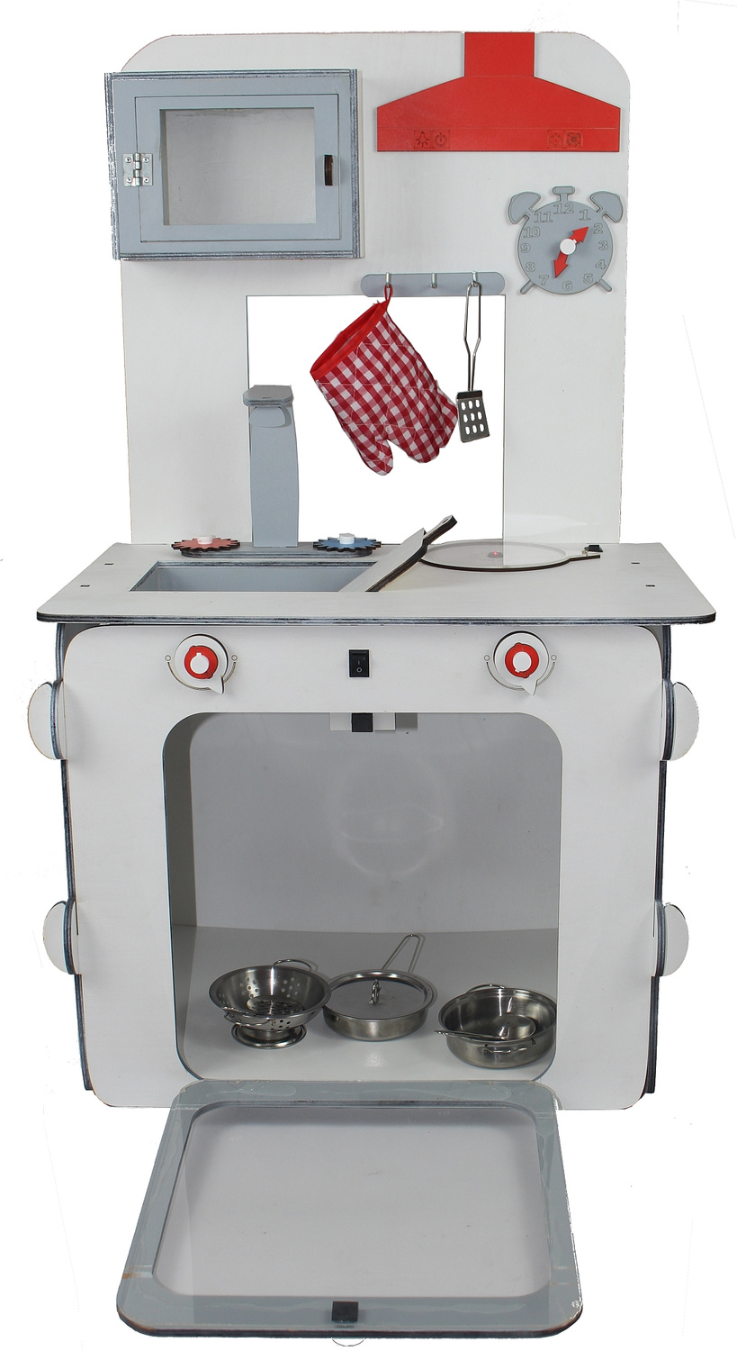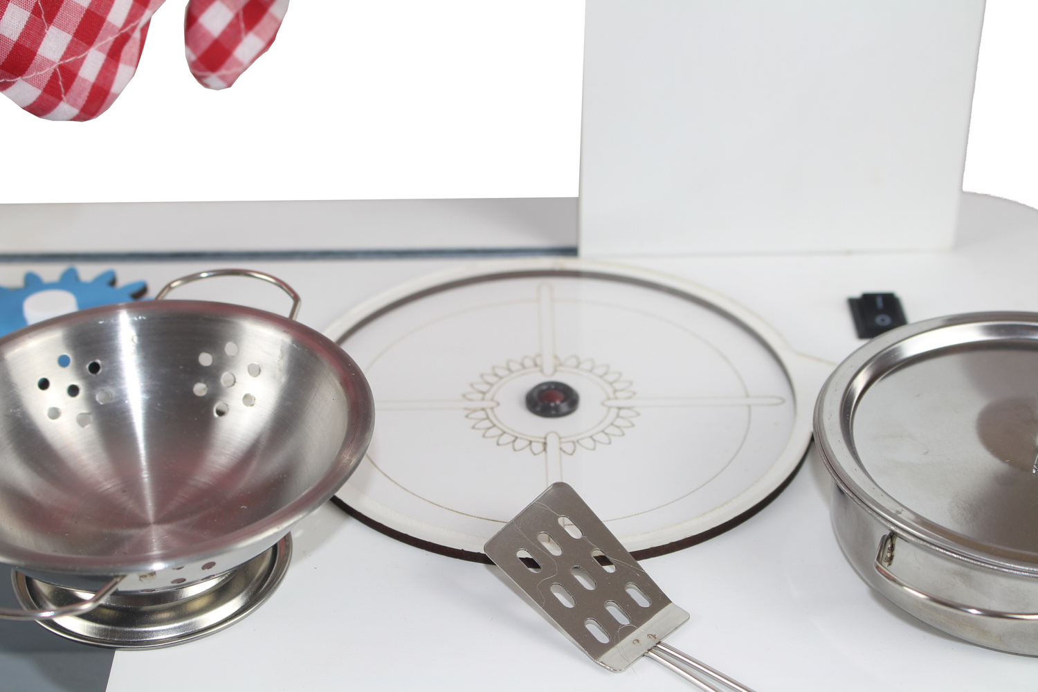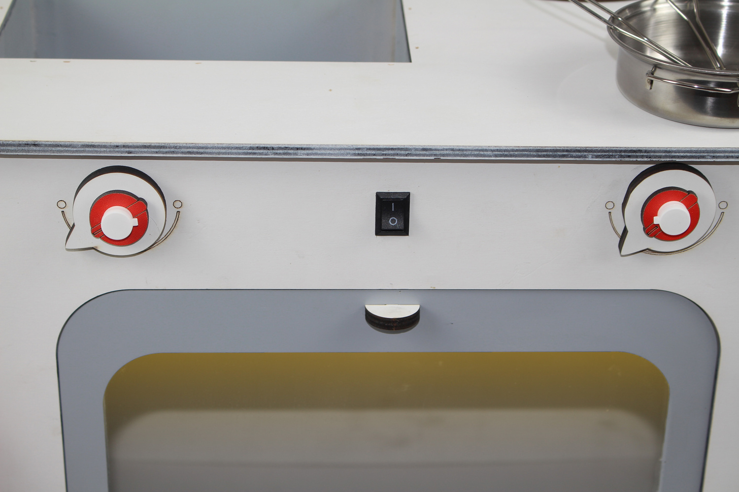 Ten świetna kuchnia wyposażona jest w zegar z ruchomymi wskazówkami, mikrofalę, okap, imitacja palnika z włącznikiem światełka, piekarnik ze światełkiem, kran z zębatkami ruchomymi imitującymi kurki oraz materiałową rękawicę kuchenną oraz naczynia wykonane ze stali nierdzewnej, które pomogą w gotowaniu wyjątkowych potraw.
