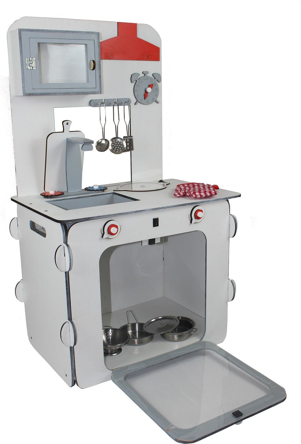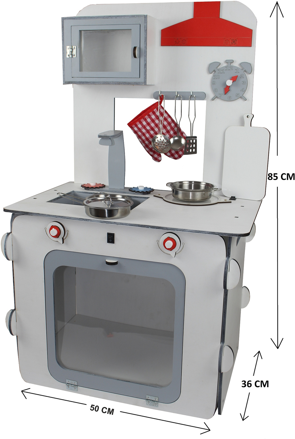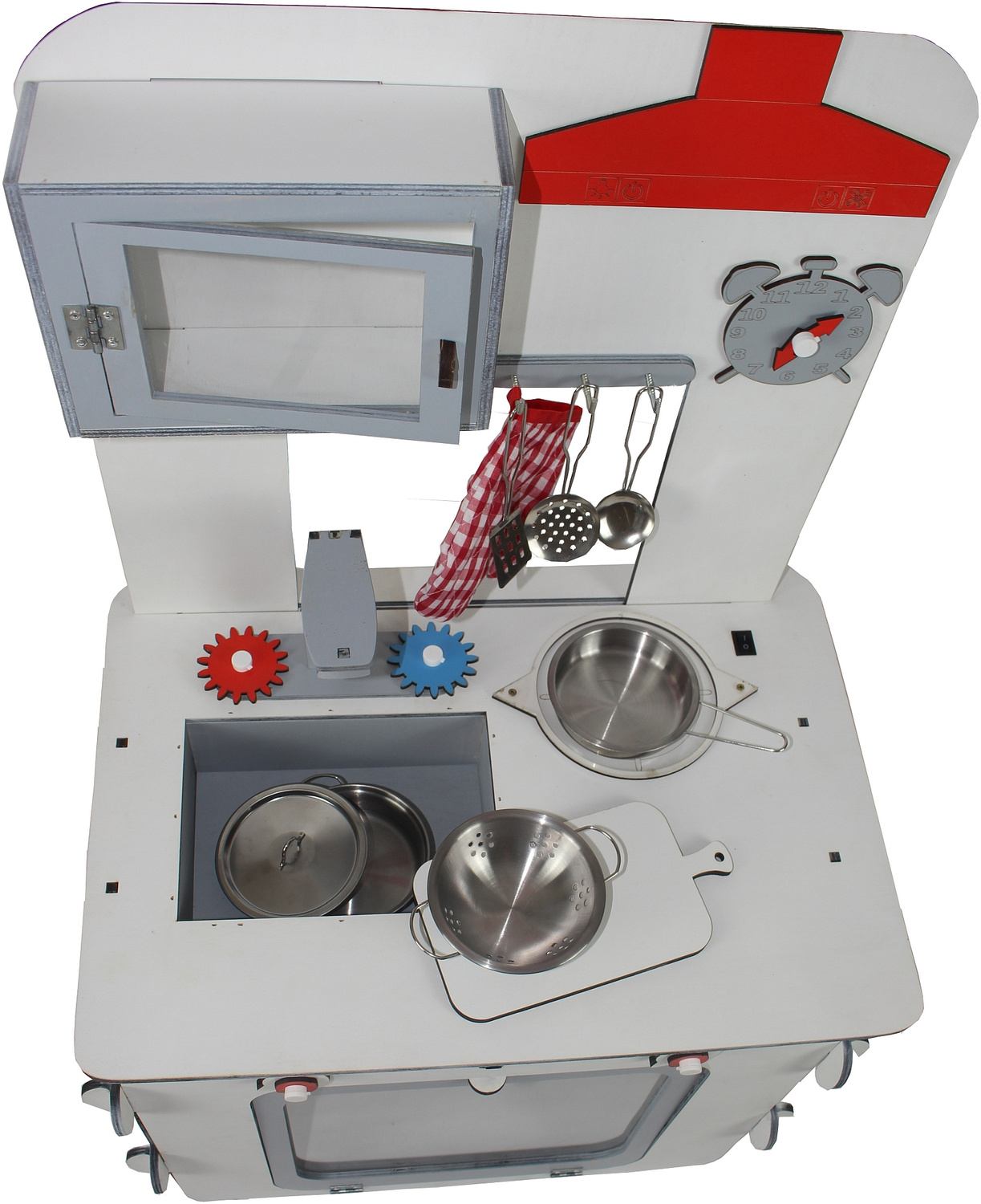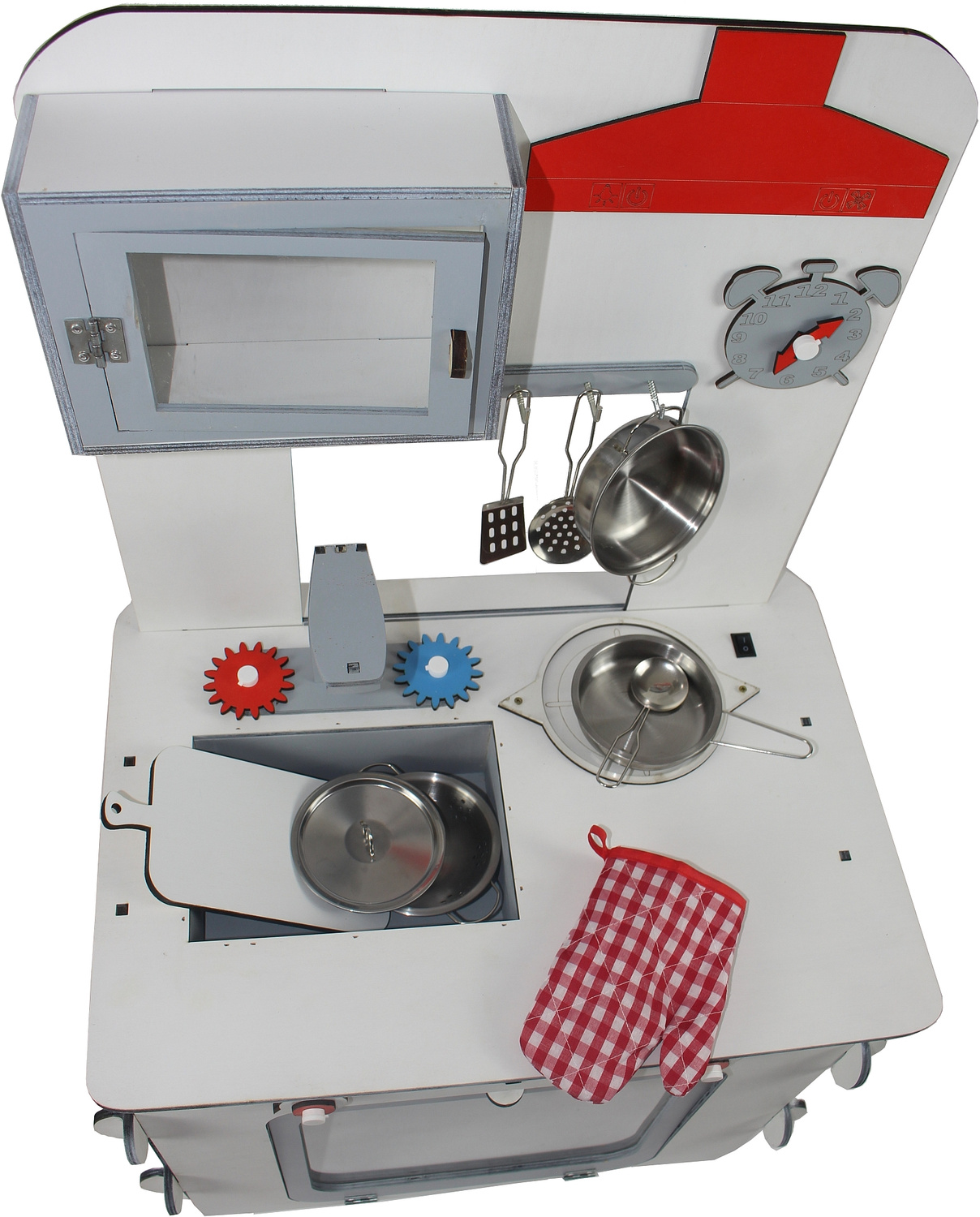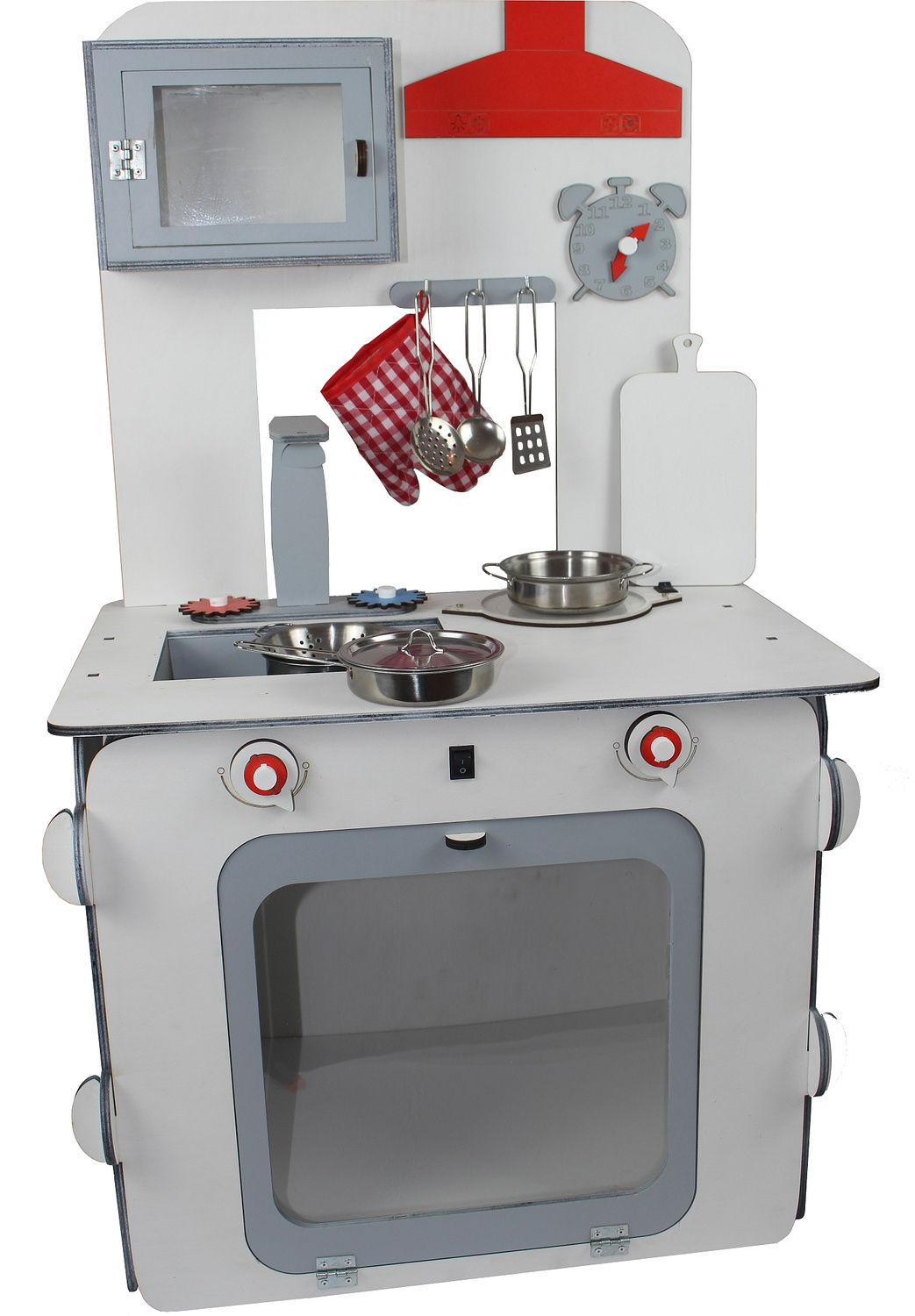 Ten świetna kuchnia wyposażona jest w zegar z ruchomymi wskazówkami, mikrofalę, okap, imitacja palnika z włącznikiem światełka, piekarnik ze światełkiem, kran z zębatkami ruchomymi imitującymi kurki oraz materiałową rękawicę kuchenną oraz naczynia wykonane ze stali nierdzewnej, które pomogą w gotowaniu wyjątkowych potraw.