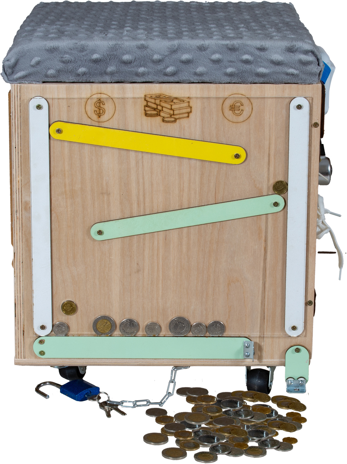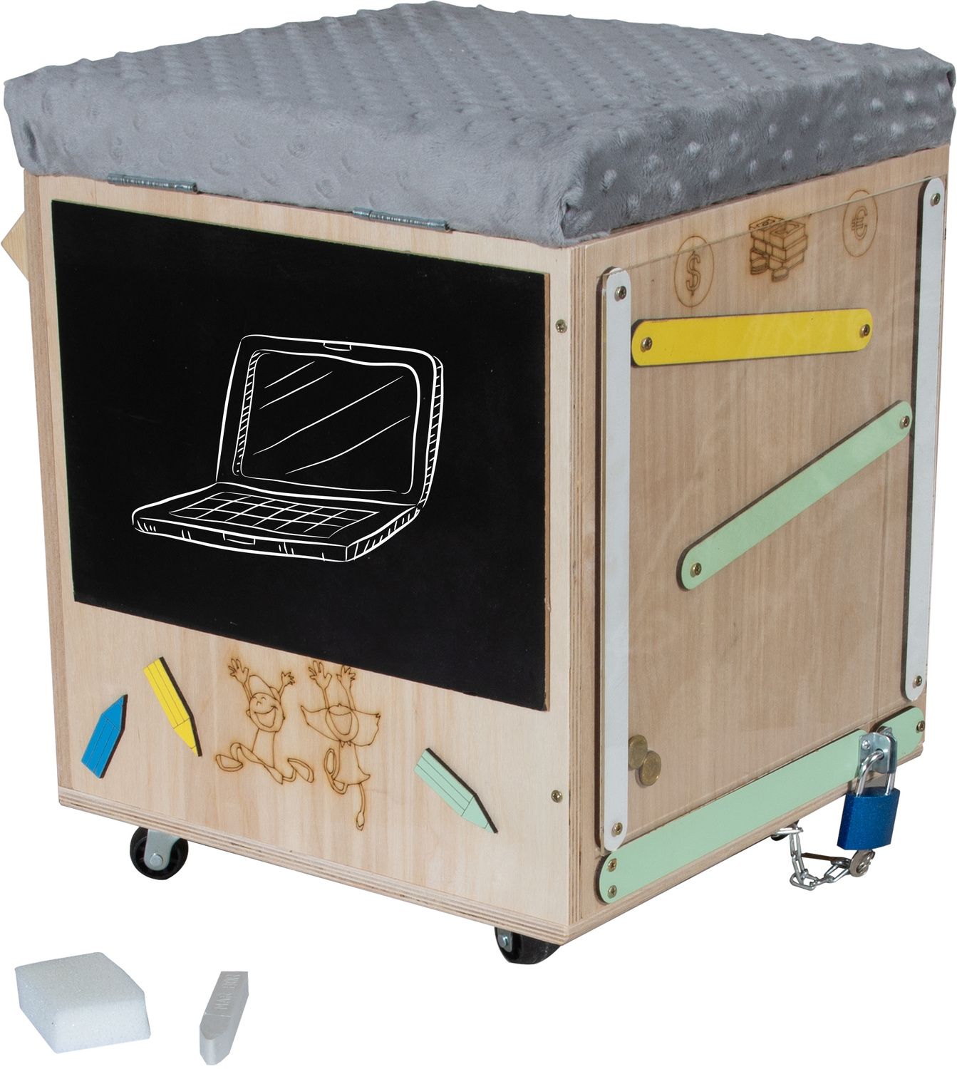 Skrzynia jest również idealnym miejscem na ćwiczenie pierwszych literek, cyferek oraz zabawy. Odpowiednio wyselekcjonowane elementy ruchome i grające sprawią, że Twoje dziecko rozwinie swoją kreatywność oraz zdolności manualne. Dodatkowo pobudzi to w nim pomysłowość i zachęci do eksplorowania otaczającego go świata.