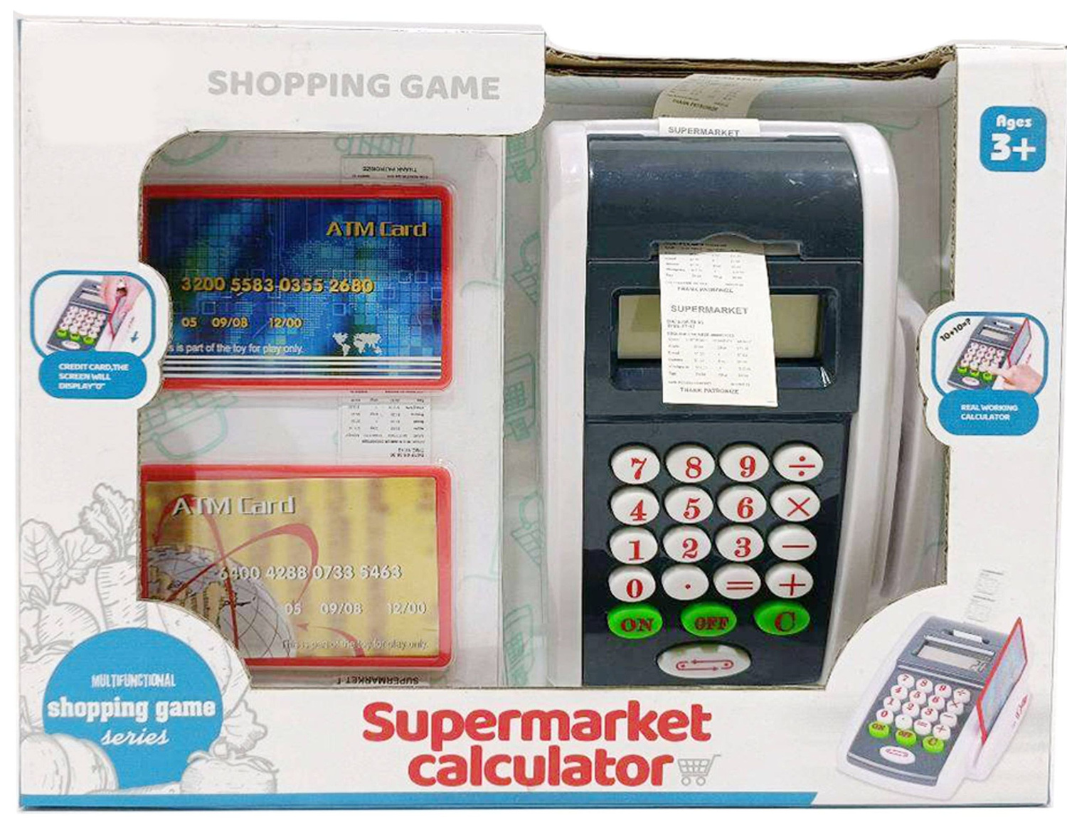 Kalkulator, wyposażony w funkcje (dodawanie, odejmowanie, mnożenie, dzielenie) pozwala małemu kasjerowi na naukę podstawowych działań matematycznych. Wynik ukazuje się na wyświetlaczu.