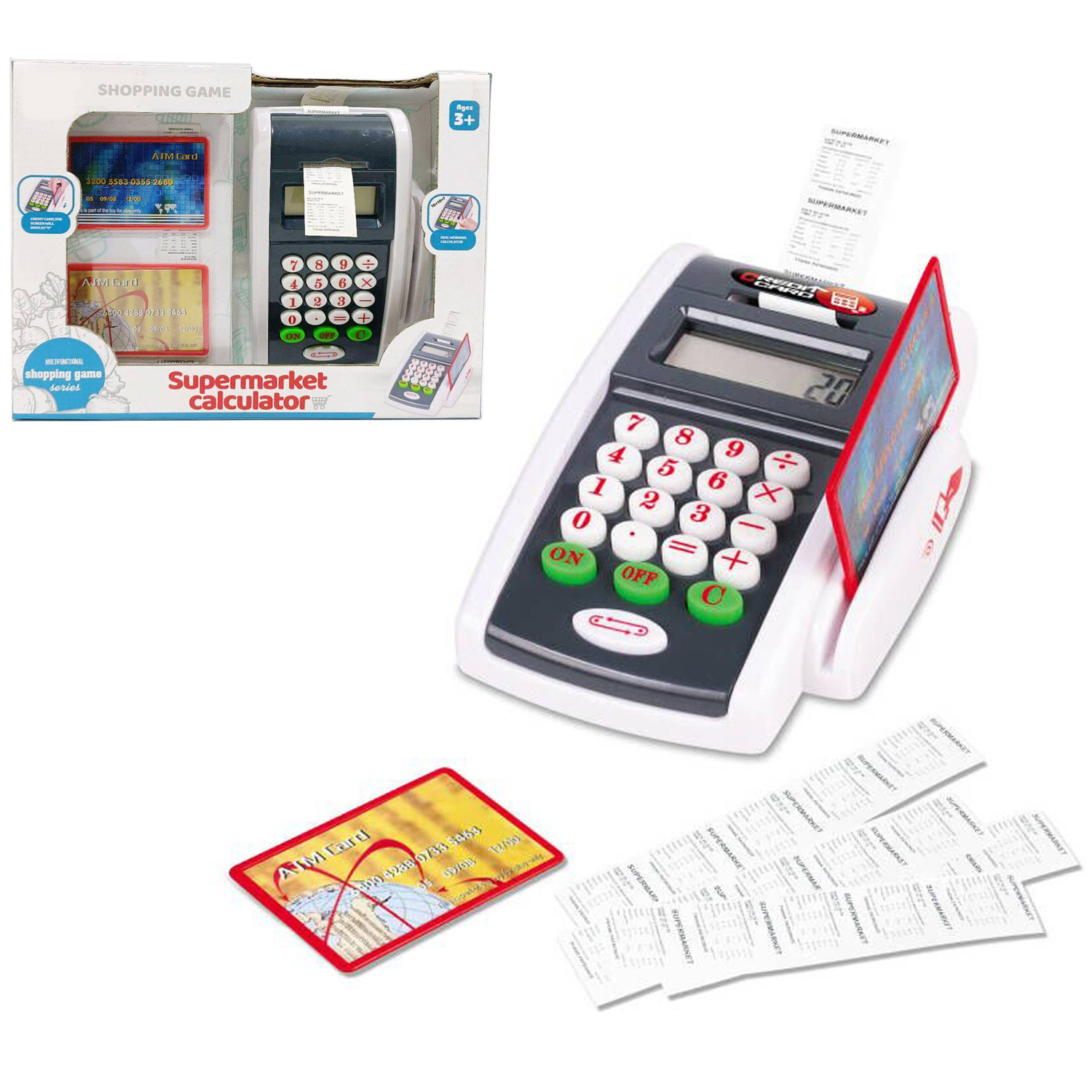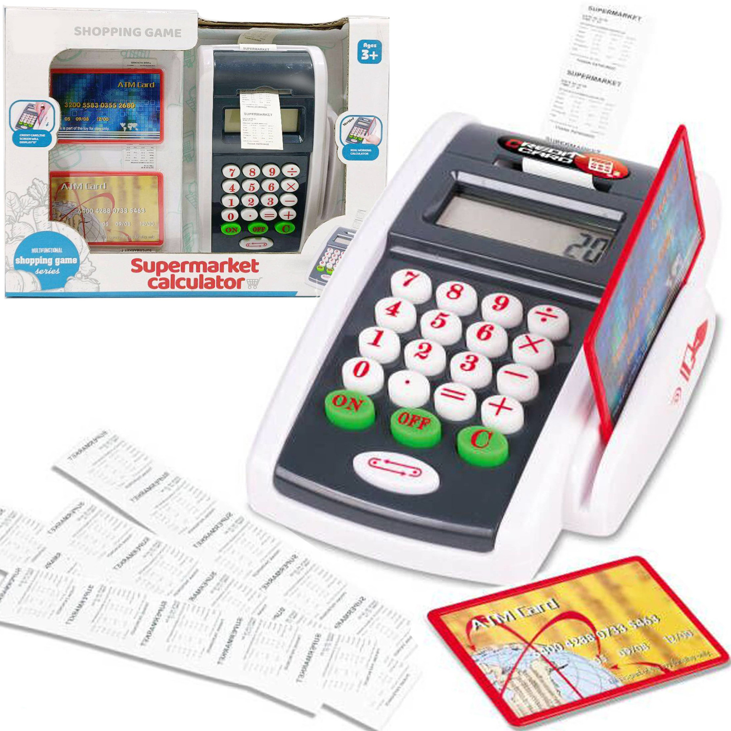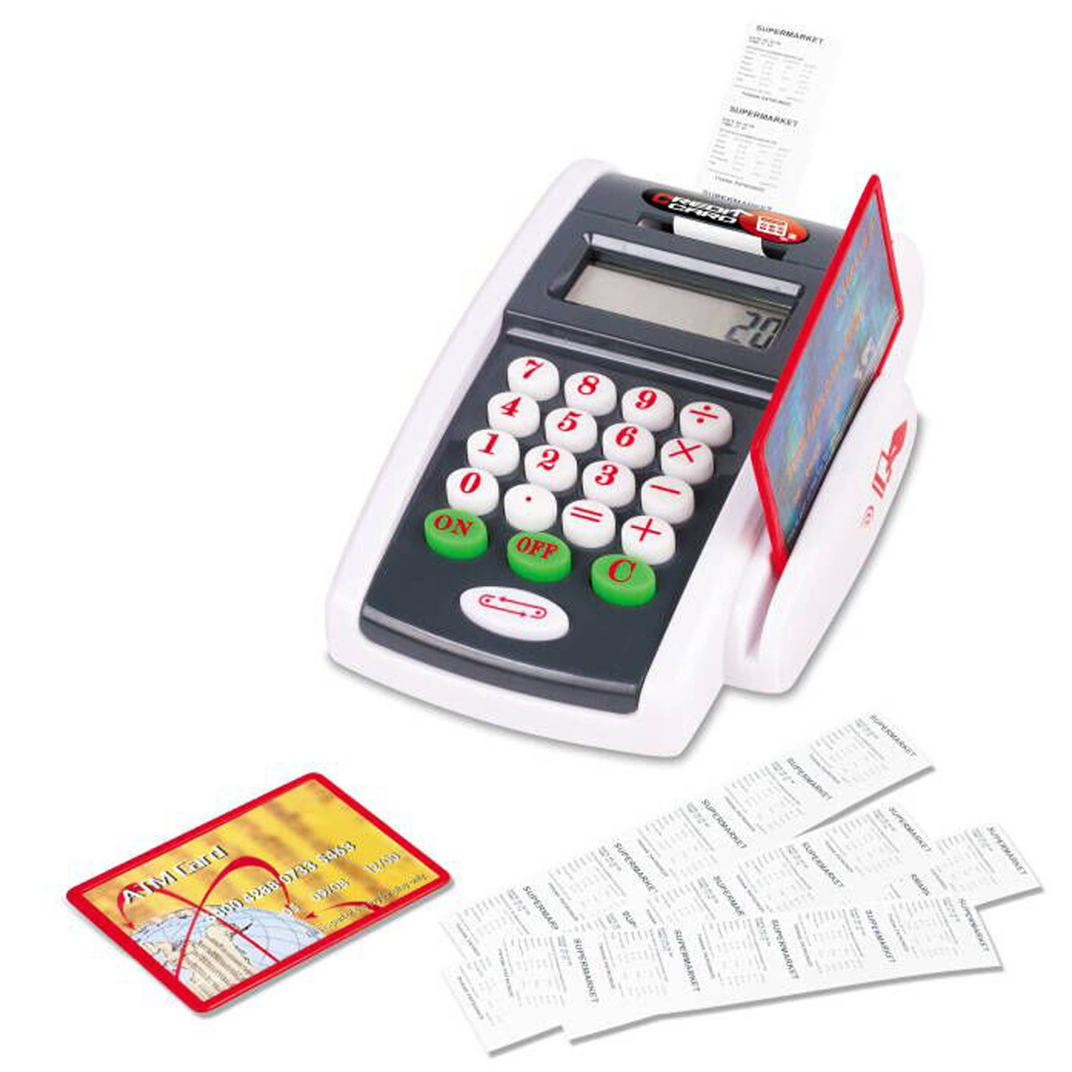 Terminal płatniczy idealny do zabawy w sklep i odgrywanie ról może pomóc dzieciom w ćwiczeniu umiejętności dodawania i odejmowania. Zabawka posiada prawdziwy kalkulator oraz wyświetlacz. W zestawie jest też 2 karty kredytowe i paragony. Twoja pociecha poczuje się jak w realnym supermarkecie.