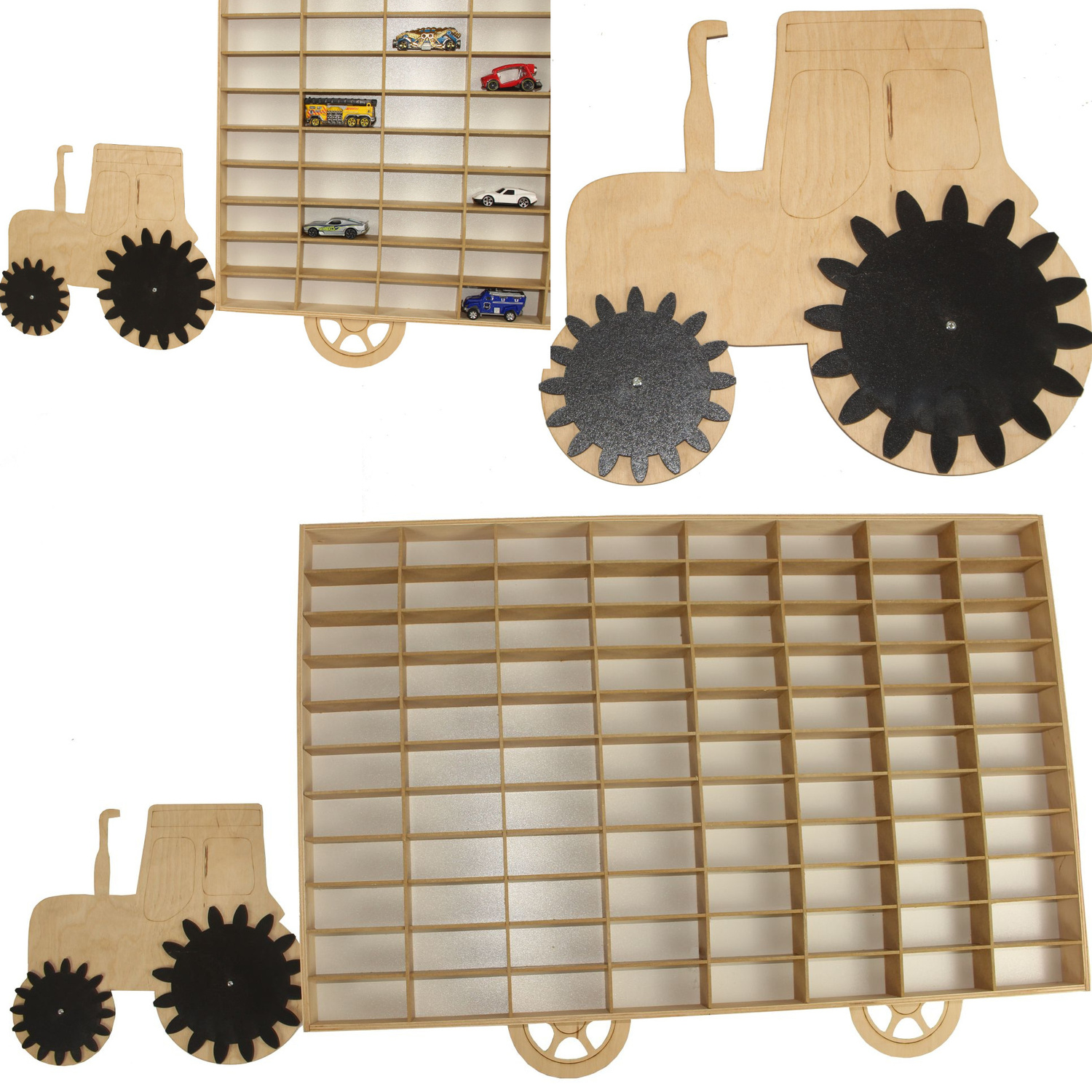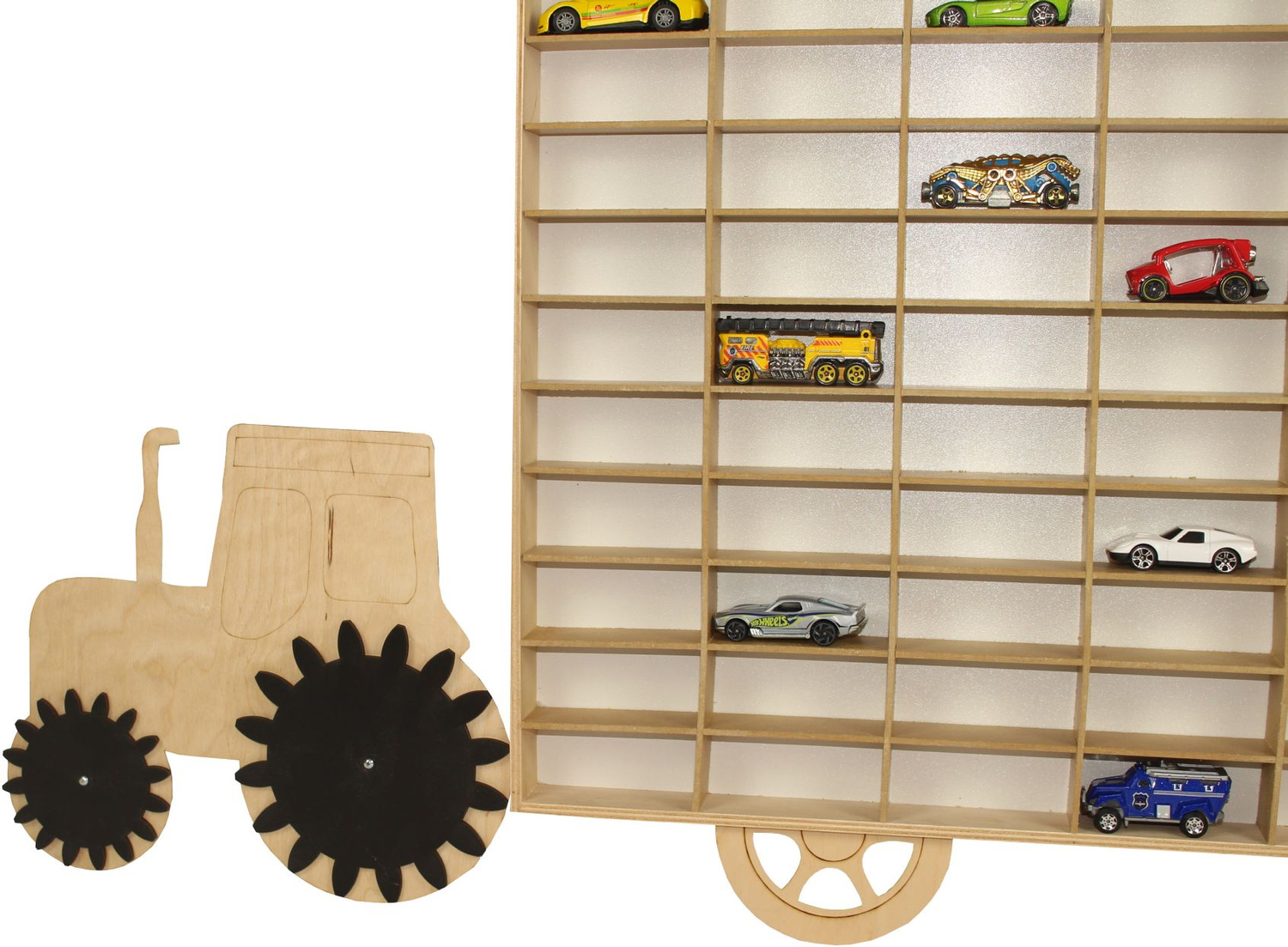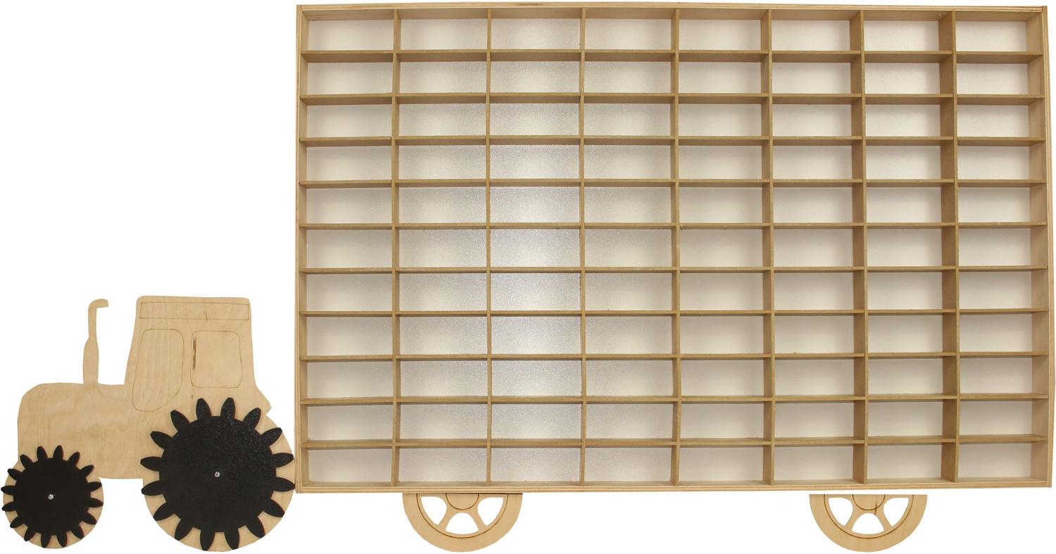 Drewniany ekspozytor z traktorem to wspaniały dodatek do dziecięcego pokoiku dla każdego kolekcjonera autek, resoraków czy figurek. Ekspozytor wyposażony jest w 88 półeczek o wymiarach 9 x 4 x 3,5cm. Jest lekki oraz można go powiesić na ścianie..