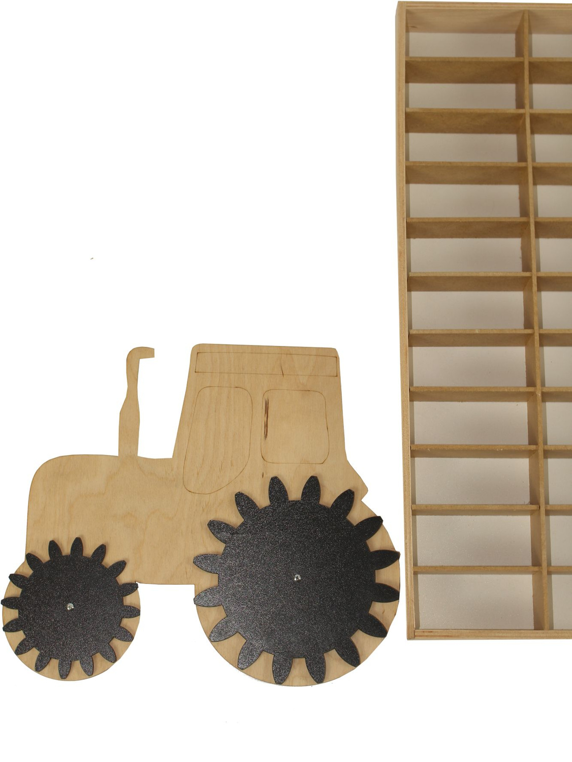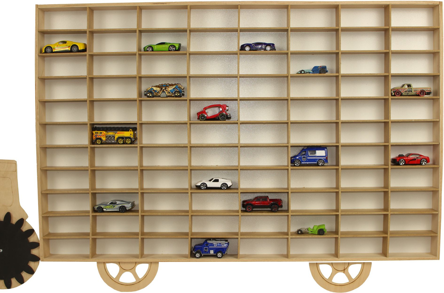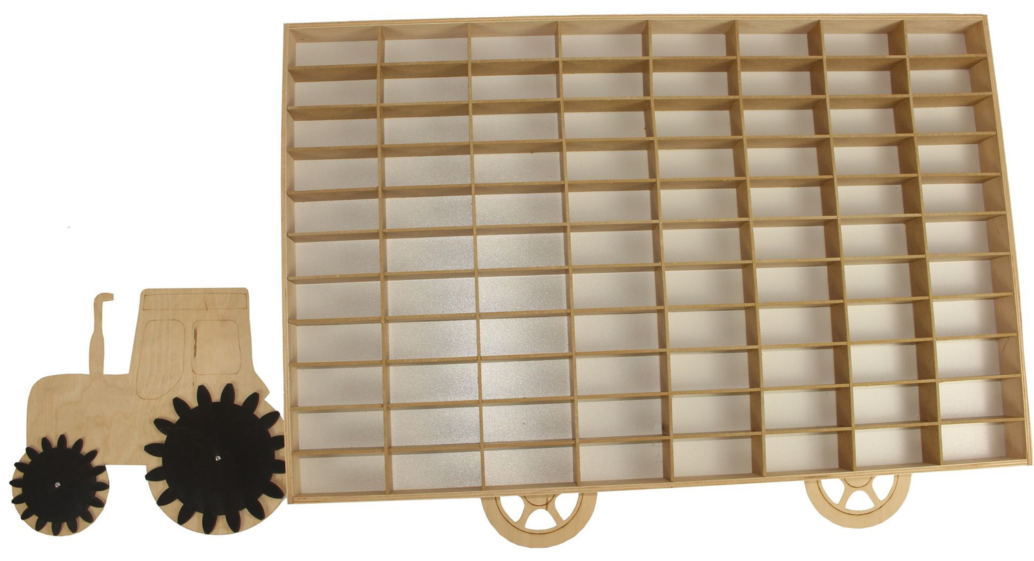 Drewniany ekspozytor z traktorem to wspaniały dodatek do dziecięcego pokoiku dla każdego kolekcjonera autek, resoraków czy figurek. Ekspozytor wyposażony jest w 88 półeczek o wymiarach 9 x 4 x 3,5cm. Jest lekki oraz można go powiesić na ścianie..