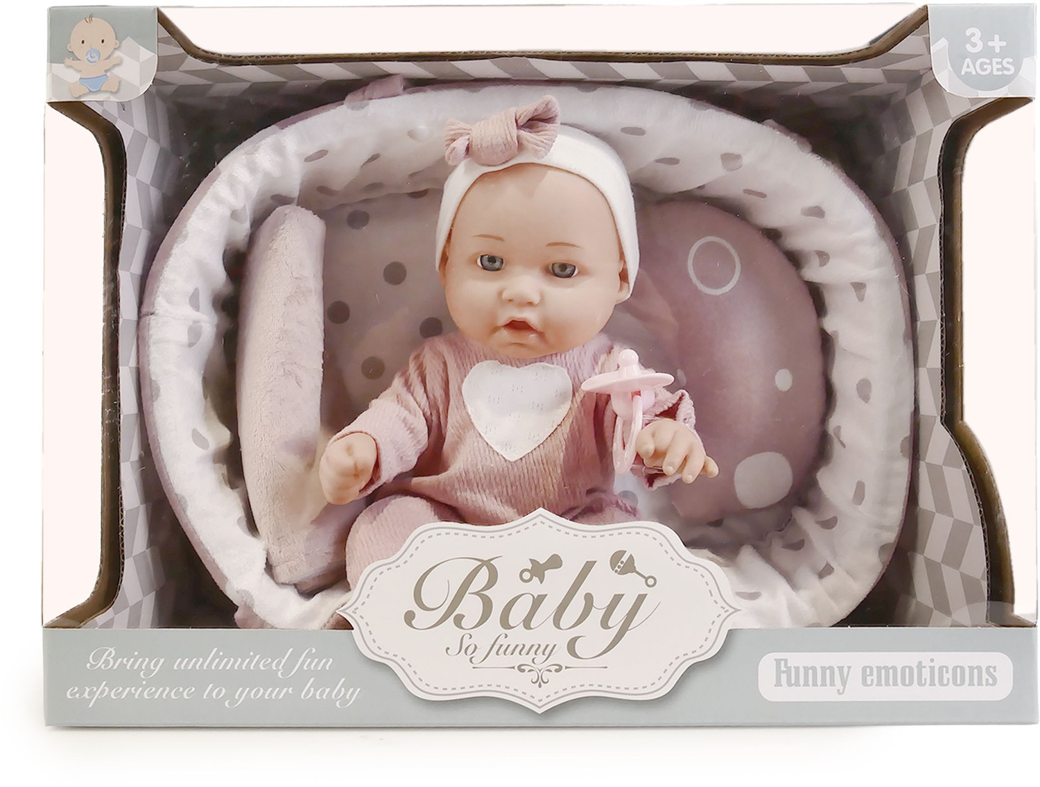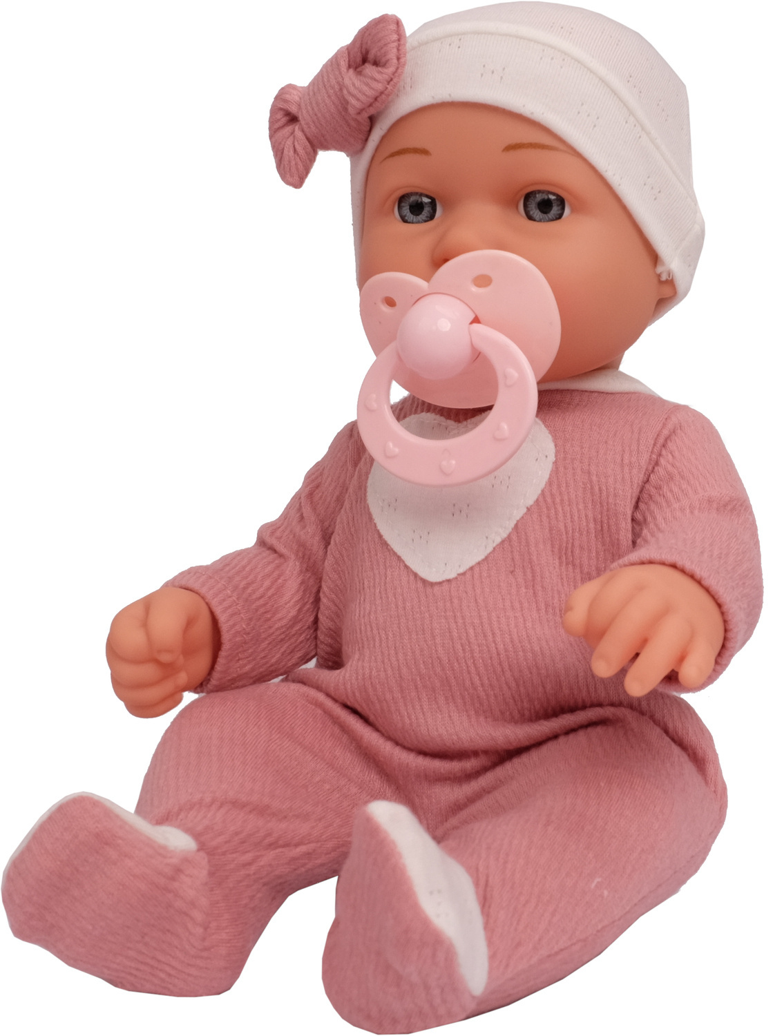 Bobas nosi starannie uszyte różowe ubranko. Ma wesołą, słodką minkę i małe szklane, szare oczka, co przypomina to klasyczne lalki - bobasy. Wygląda jak prawdziwe dziecko ubrane w mięciutkie ciuszki.