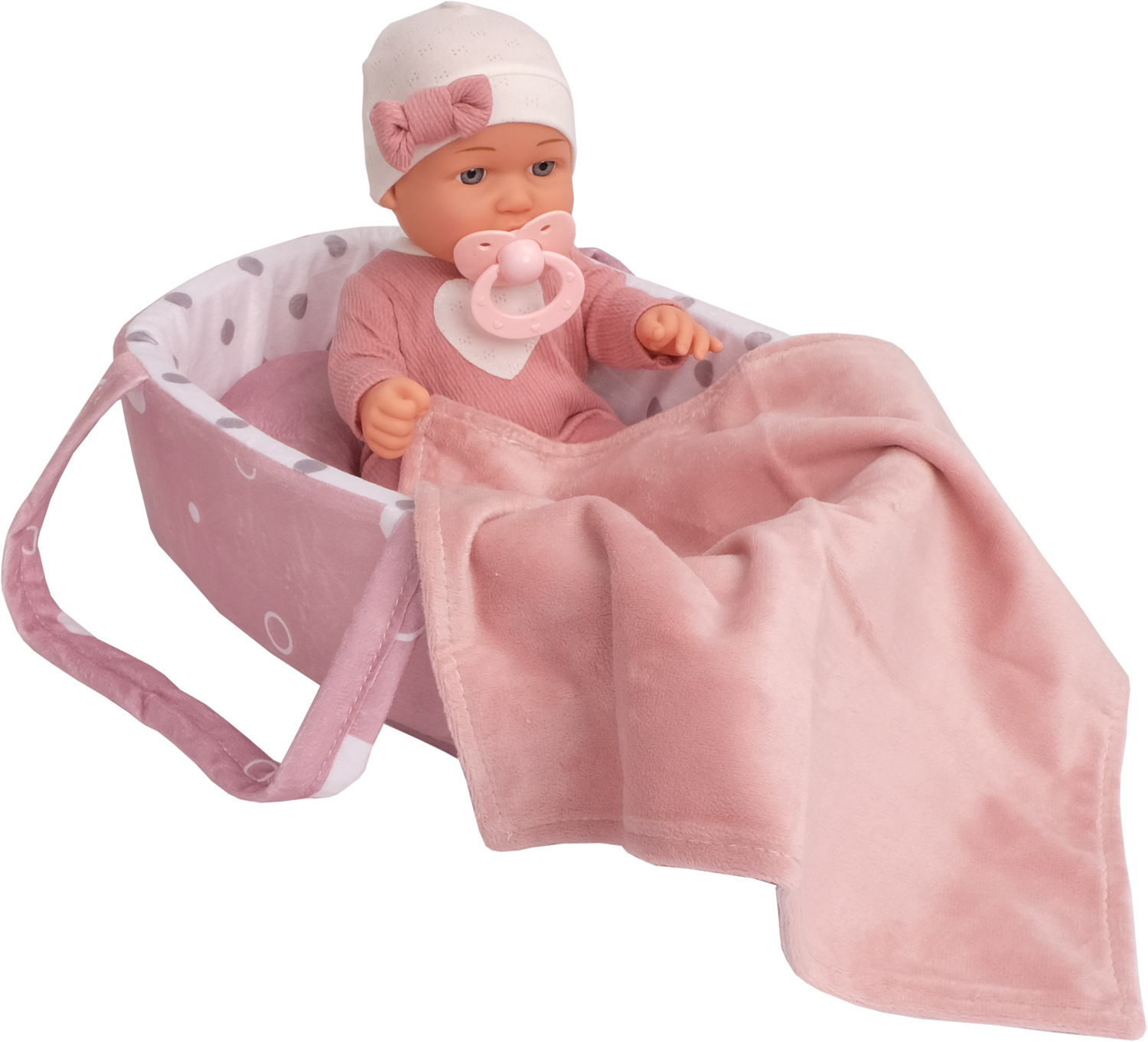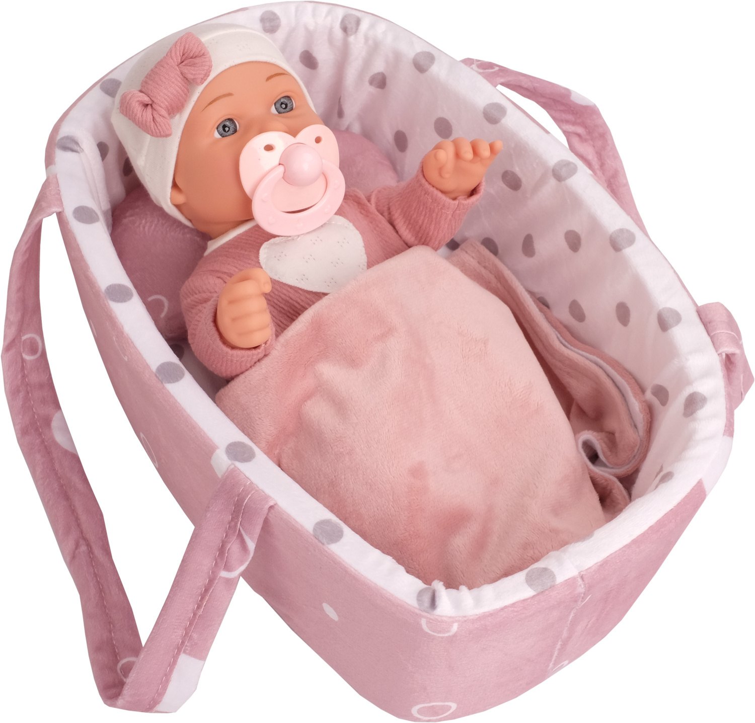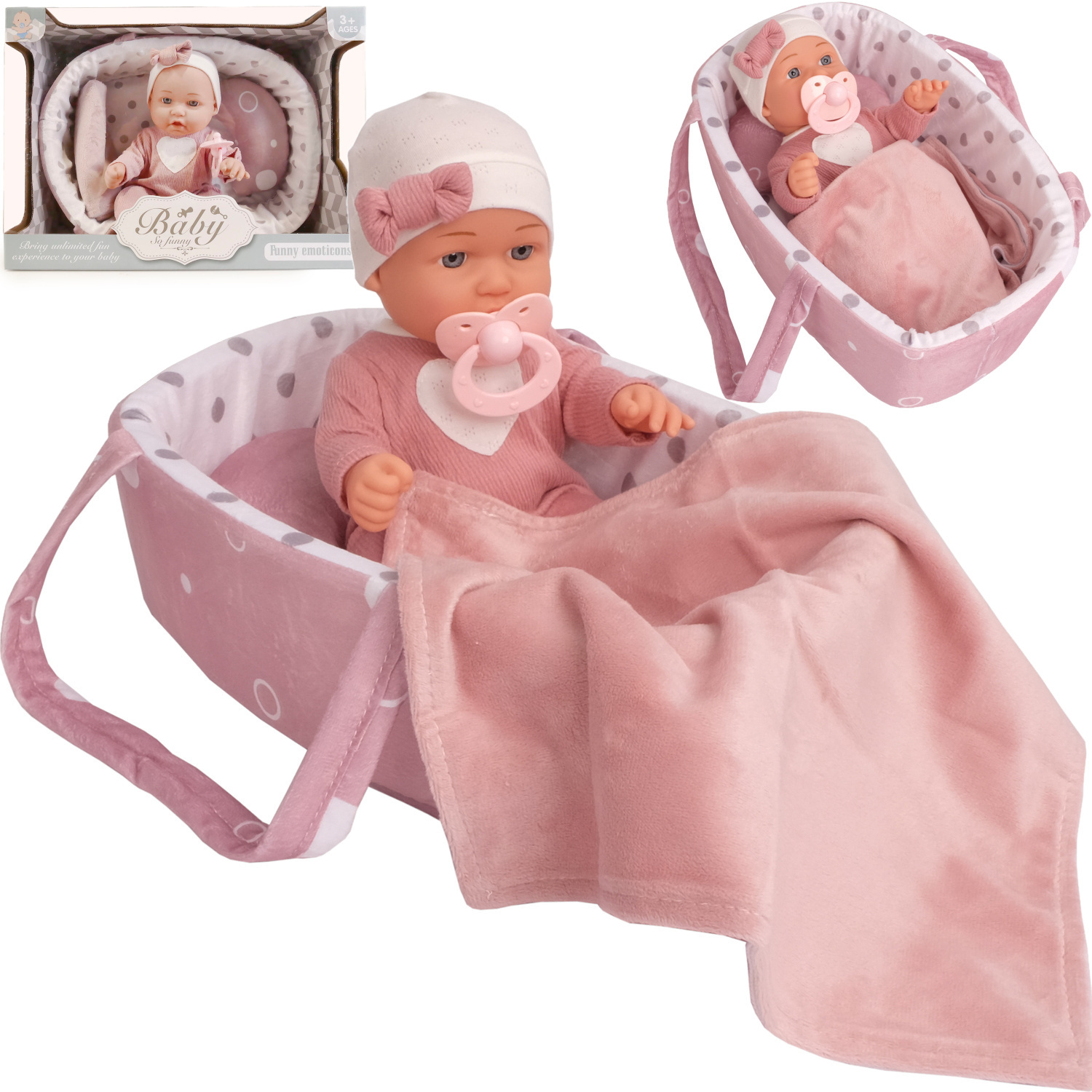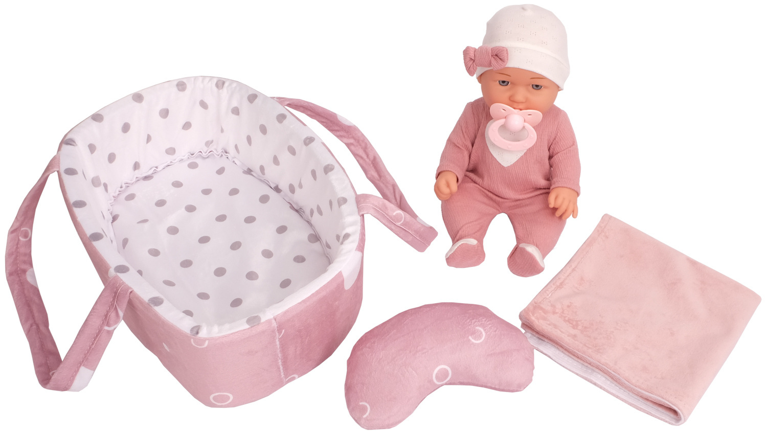 • Super akcesoria w zestawie: smoczek, nosidełko, kołderka i poduszka