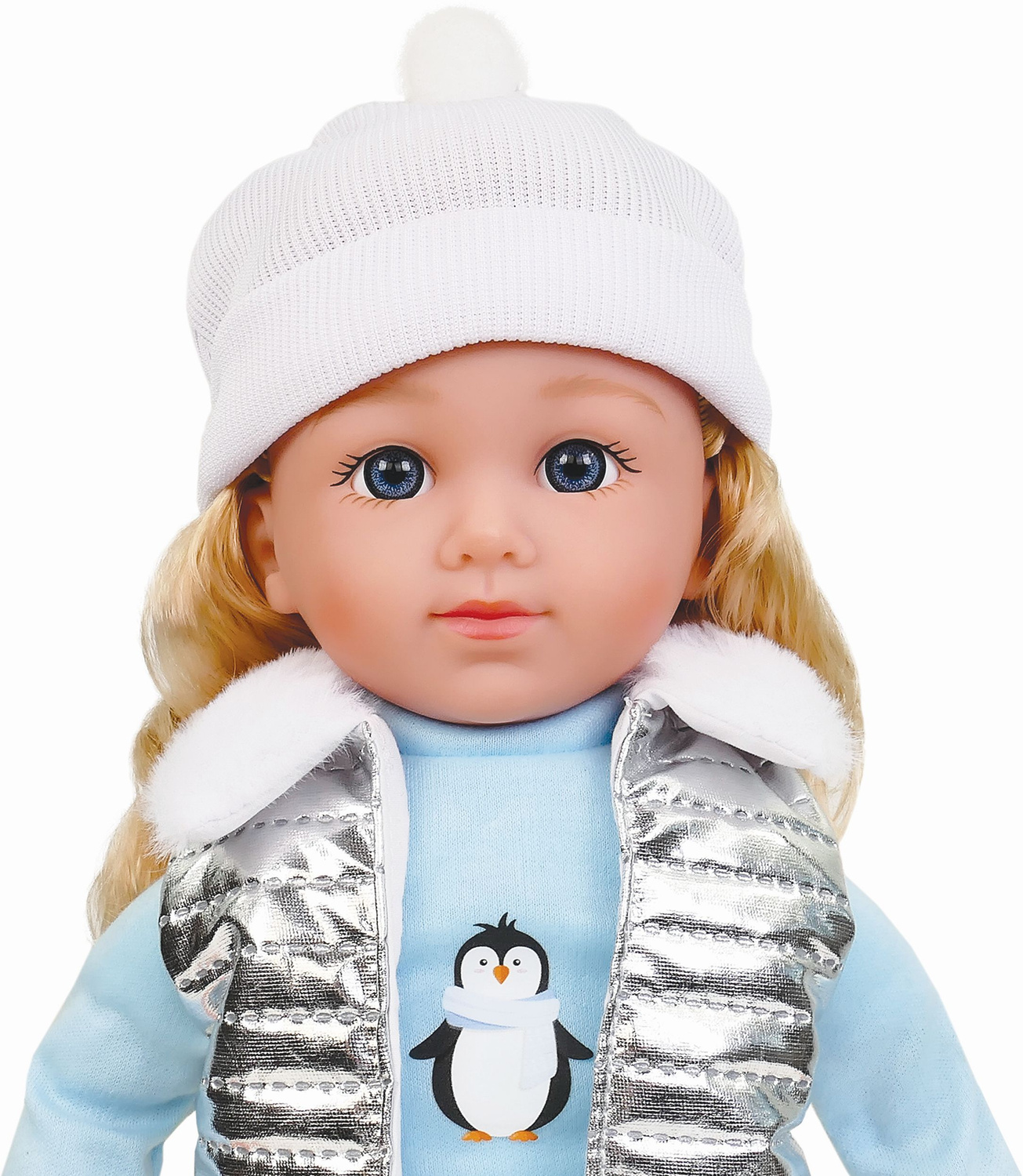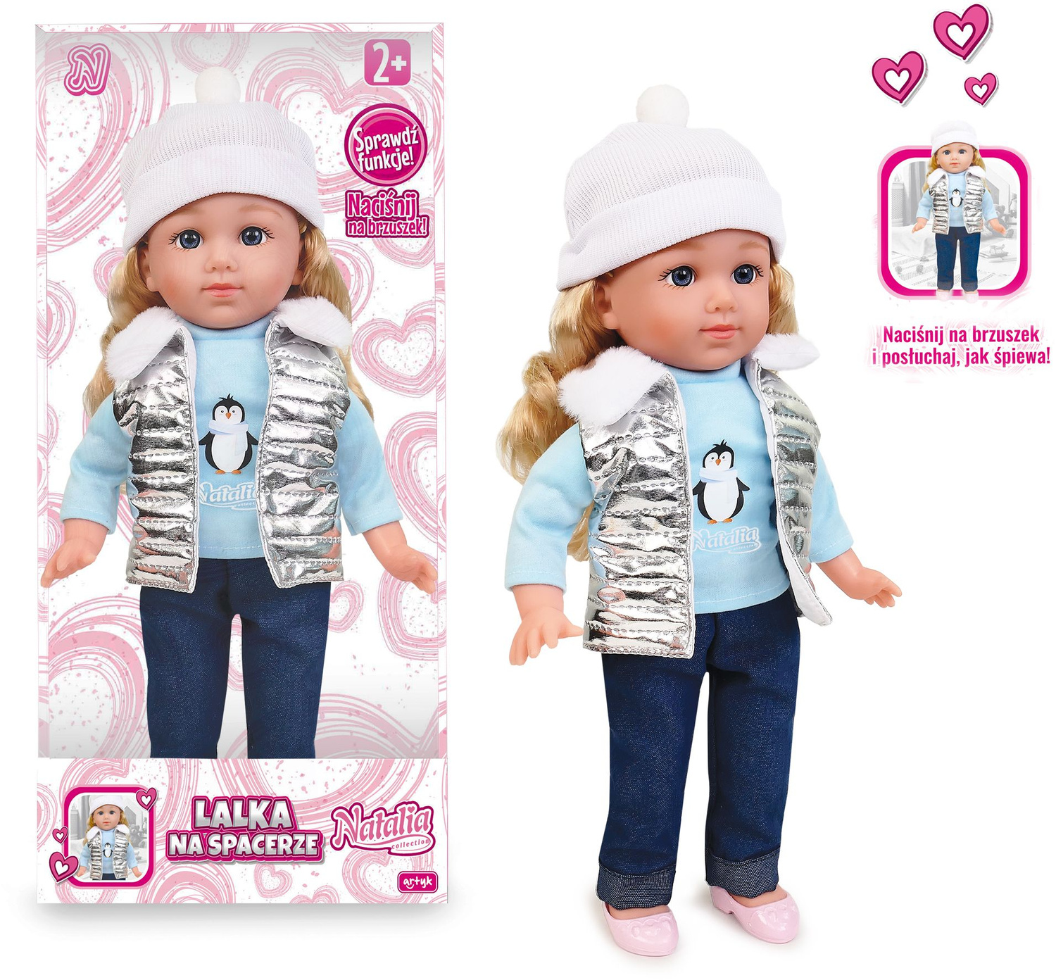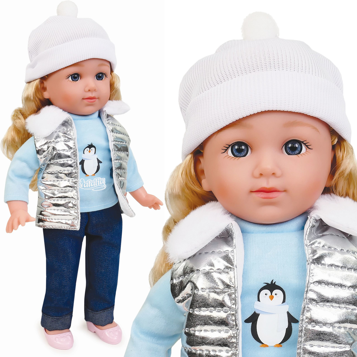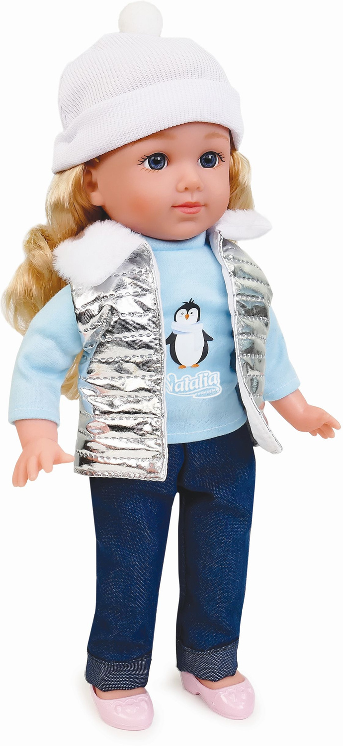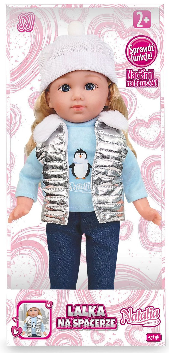 Natalia ma piękne, długie włoski oraz jest ubrana w ciepłą czapeczkę, bluzkę z pingwinkiem i puchową kamizelkę. Ta mała gadułka zaprasza do wspólnej zabawy. Uwielbia śpiew, zabawę i wspólne spacery. Wszędzie jest jej pełno, a do tego rozwesela swoim radosnym głosikiem. Zawsze jest bardzo grzeczna. Prześliczna, mówiąca po polsku laleczka wywoła uśmiech na buzi każdej dziewczynki.