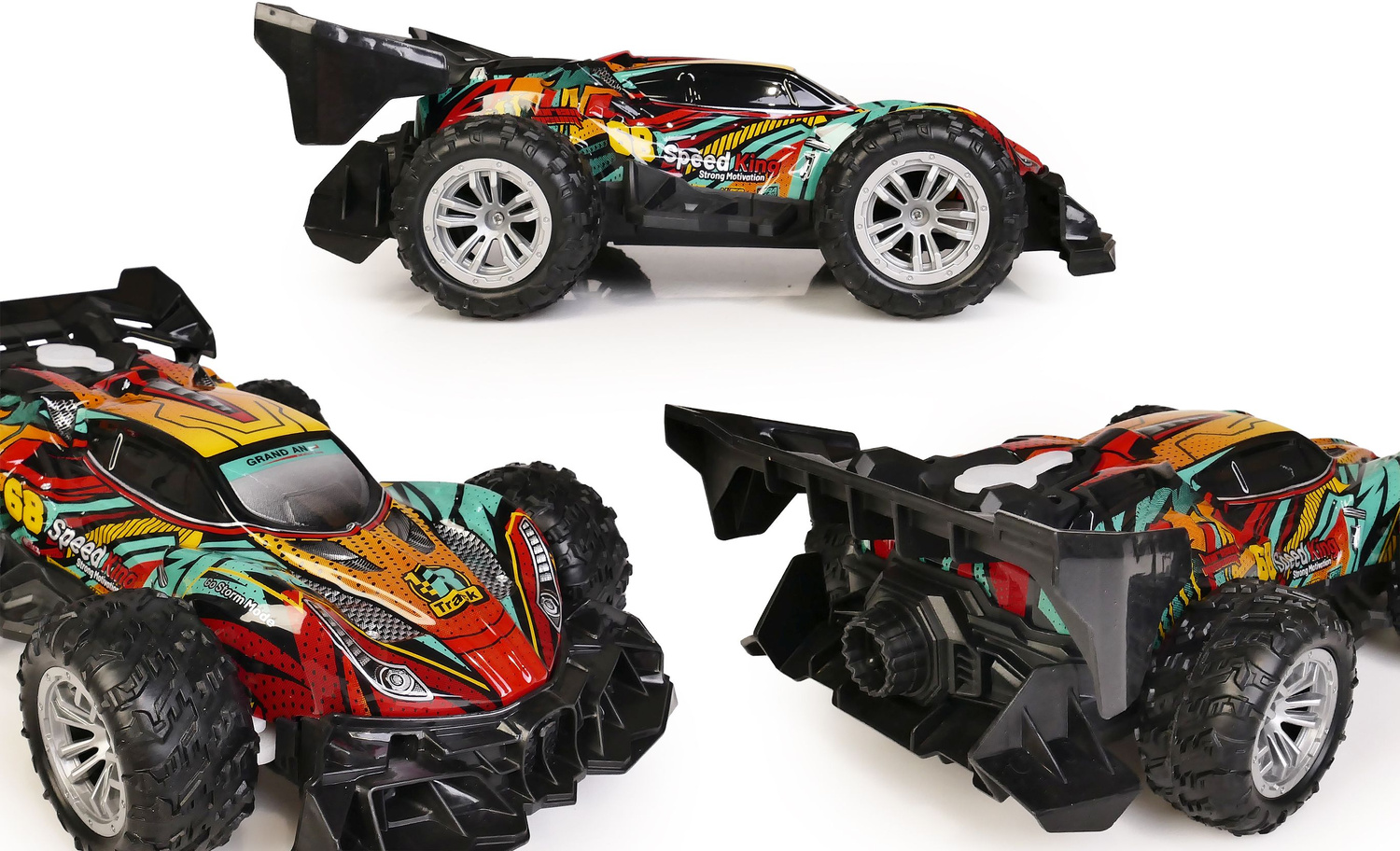 Duże, szerokie, gumowe koła zapewniają doskonałą trakcję dzięki nim auto z łatwością pokonuje różnorodne przeszkody. Niezależnie od tego, czy jest to asfalt, trawiaste podwórko, piaszczyste bezdroża czy dziecięcy pokój, to auto jest gotowe na wyzwania. Pojazd sprawi, że chłopiec poczuje się jak kierowca prawdziwej terenówki off-road.