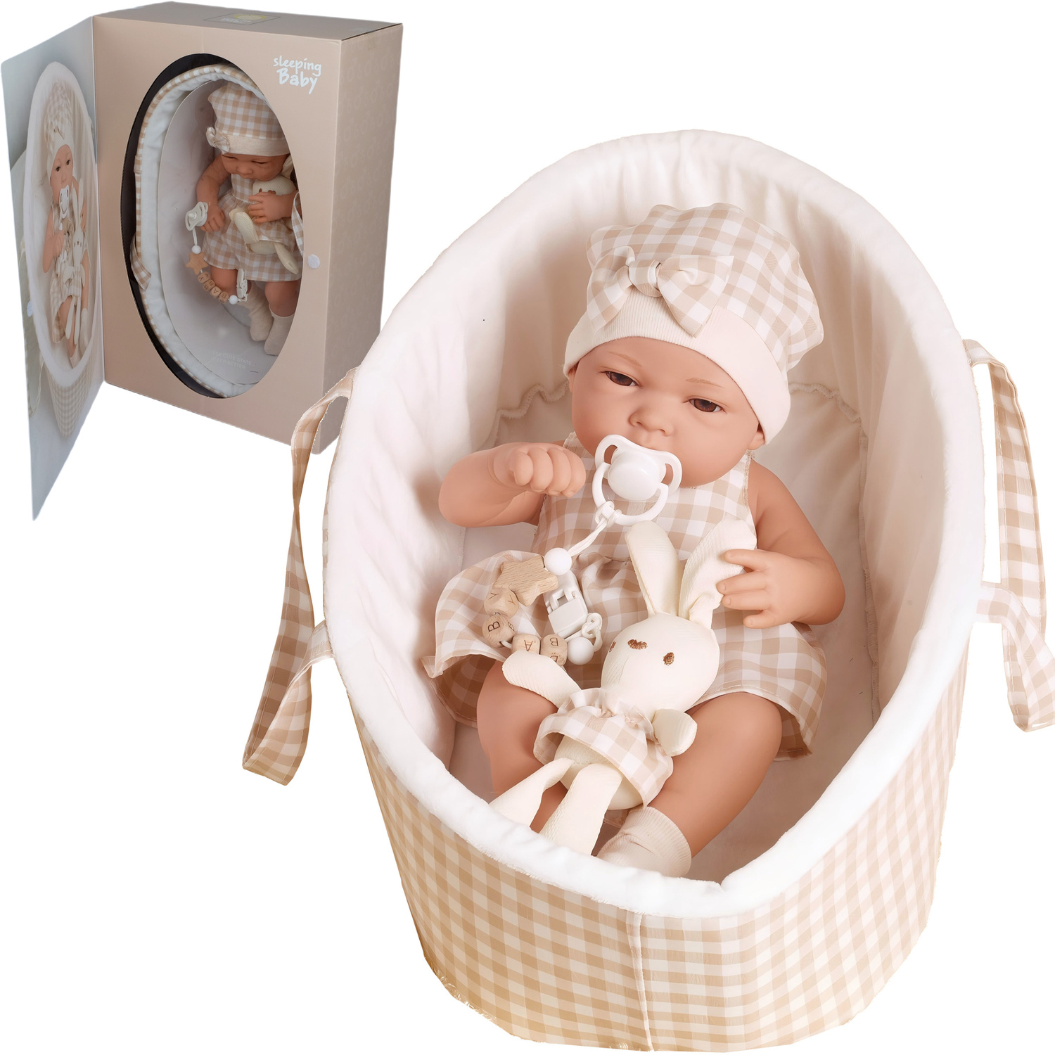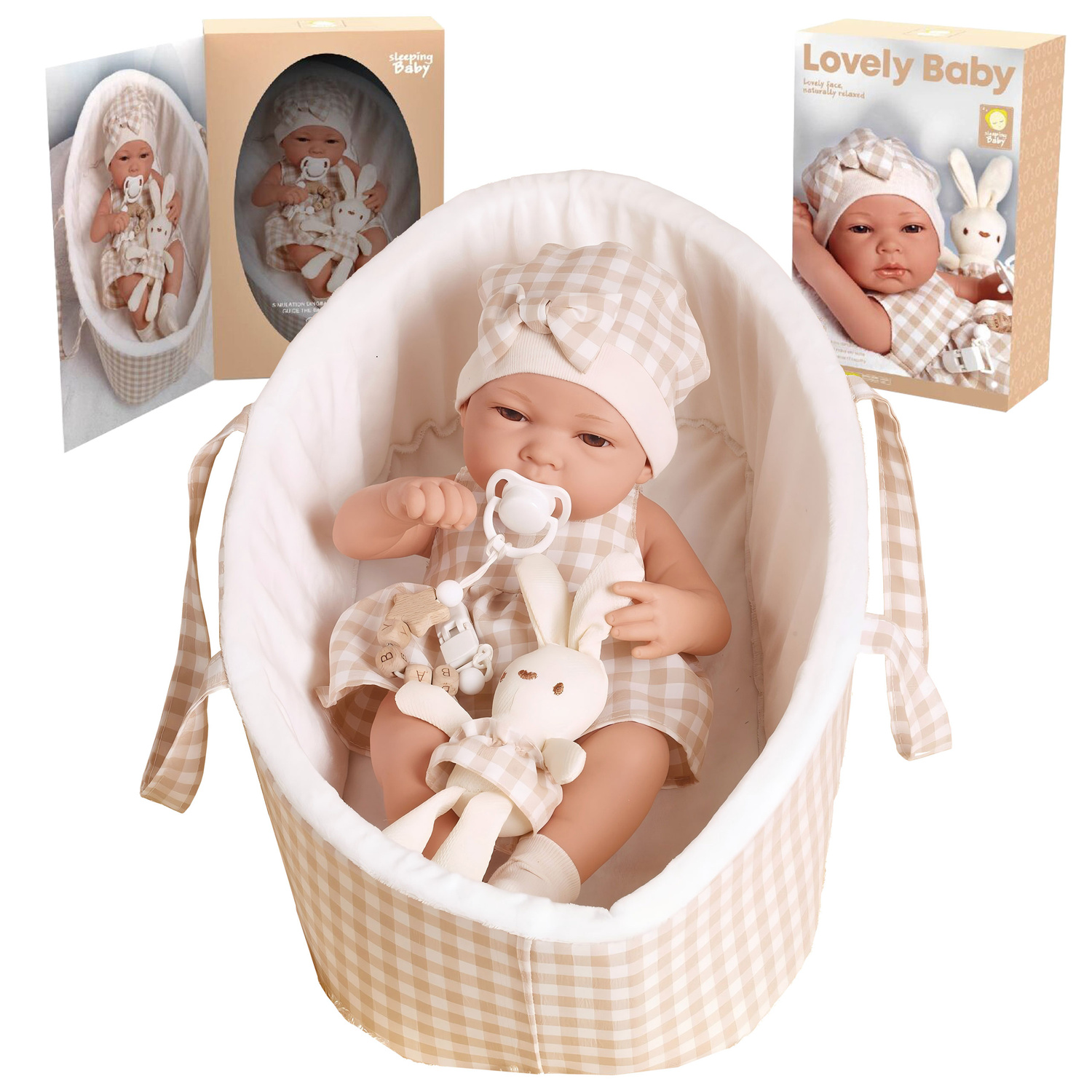 Bobas nosi starannie uszyte biało-beżowe ubranko w kratę. Ma wesołą, słodką minkę i małe brązowe oczka, co przypomina to klasyczne lalki - bobasy. Wygląda jak prawdziwe dziecko ubrane w mięciutkie ciuszki.