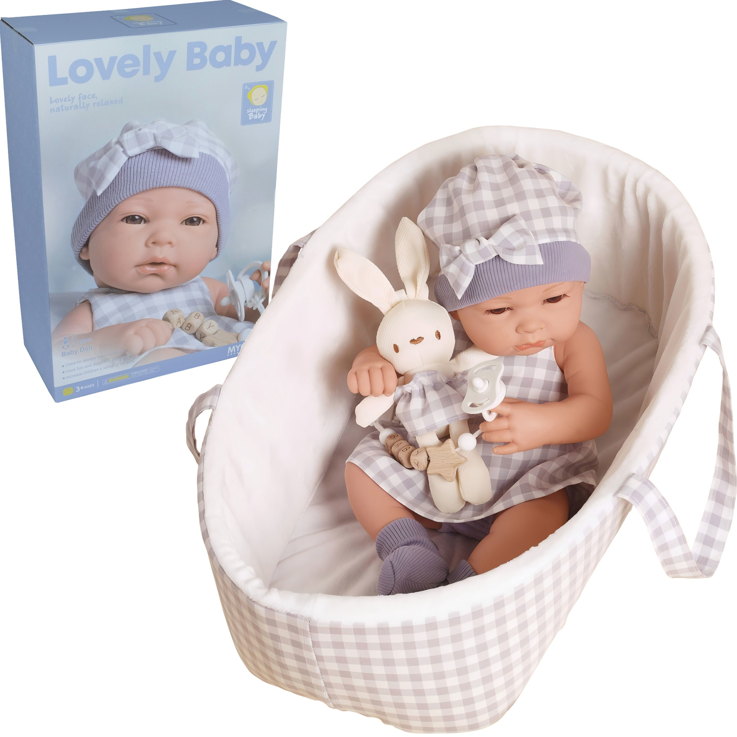 Bobas nosi starannie uszyte biało-niebieskie ubranko w kratę. Ma wesołą, słodką minkę i małe brązowe oczka, co przypomina to klasyczne lalki - bobasy. Wygląda jak prawdziwe dziecko ubrane w mięciutkie ciuszki.