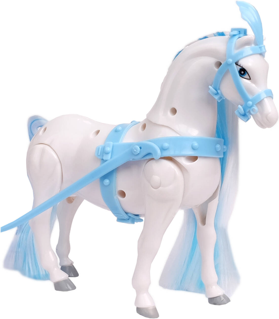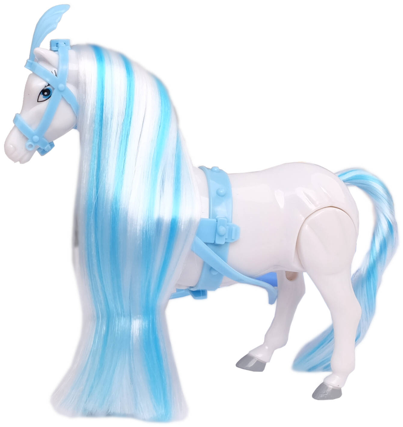 Przepiękny biały, połyskujący, długowłosy koń z niebieską uprzężą. Przesuń przycisk, a koń zacznie wydawać odgłosy zupełnie jak prawdziwy i poruszać się.