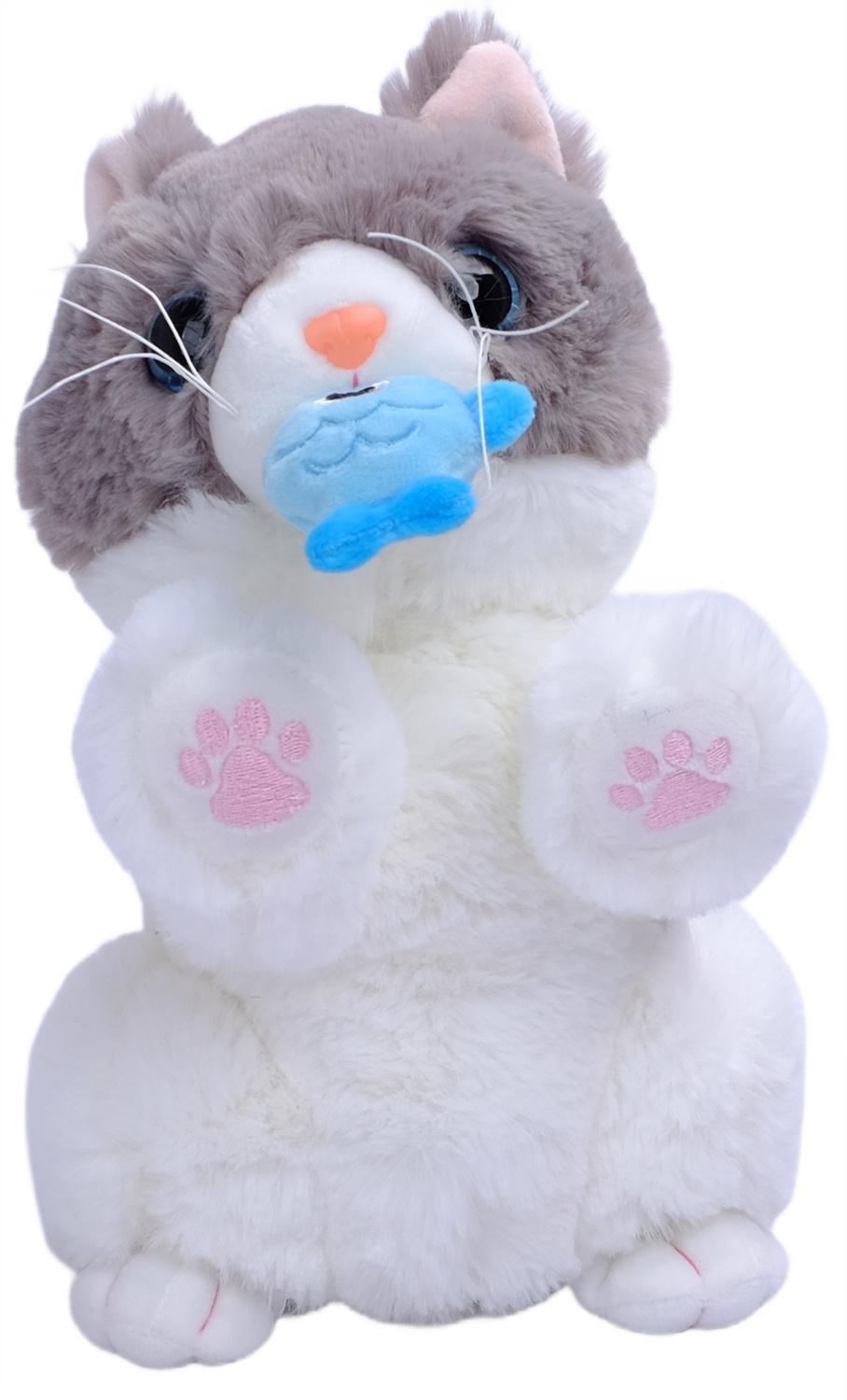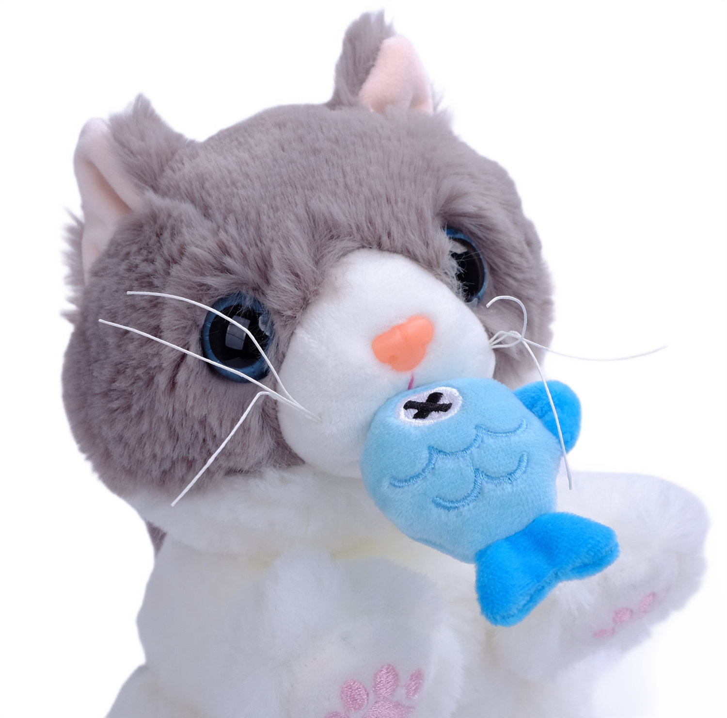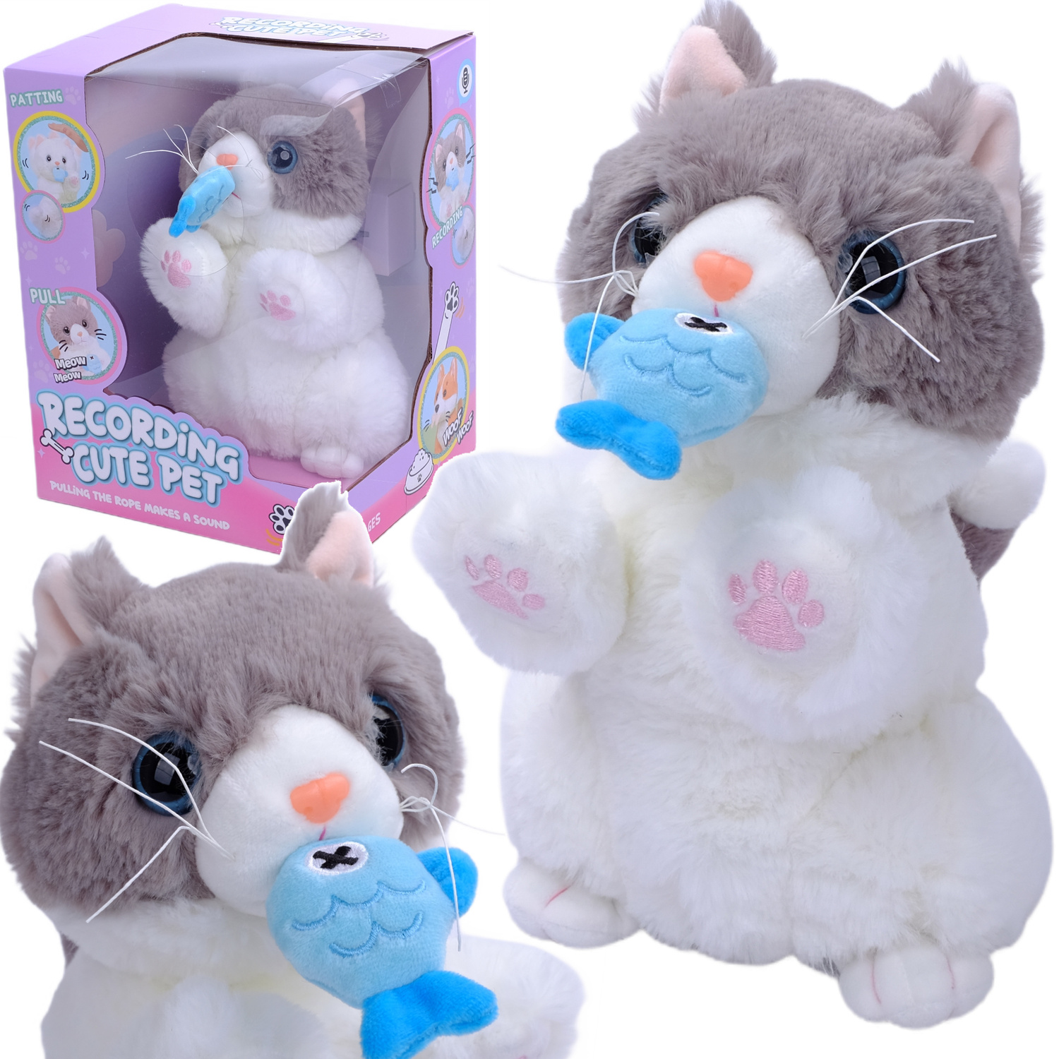 Pociągnij do siebie rybkę na sznurku, a kotek zacznie ją przyciągać i "zjadać" wydając przy tym zabawne odgłosy. Słodki zwierzaczek, nowy przyjaciel Twojego dziecka ma milutkie futerko, niebieska oczka i nosek ze śmieszną minką.
