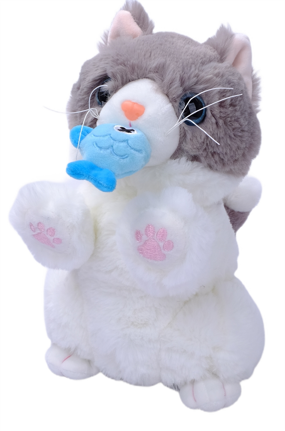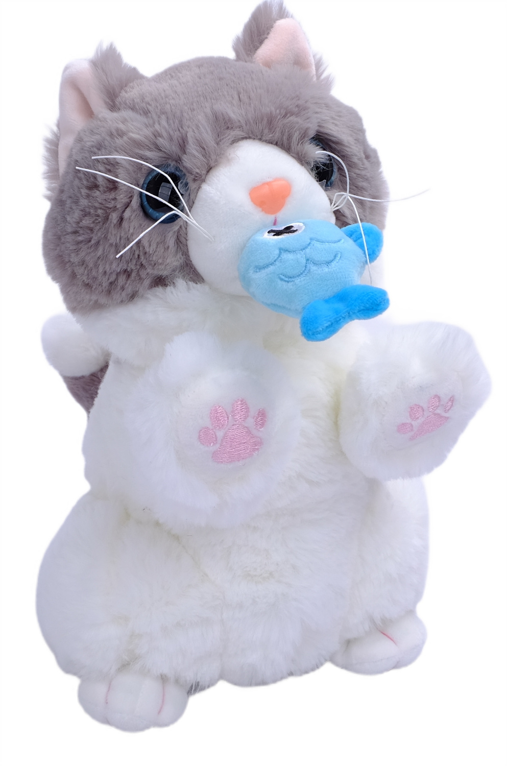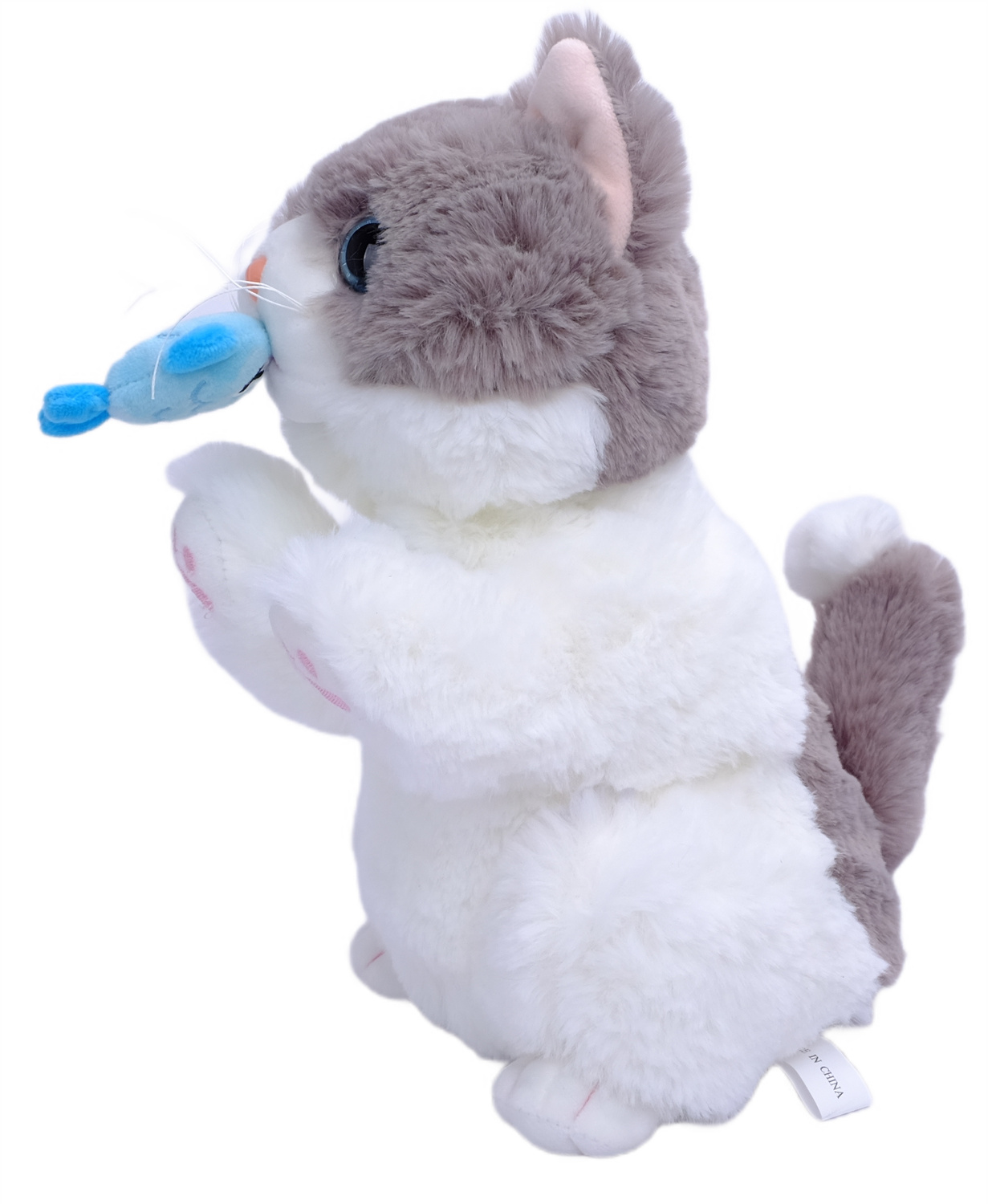 Pociągnij do siebie rybkę na sznurku, a kotek zacznie ją przyciągać i "zjadać" wydając przy tym zabawne odgłosy. Słodki zwierzaczek, nowy przyjaciel Twojego dziecka ma milutkie futerko, niebieska oczka i nosek ze śmieszną minką.