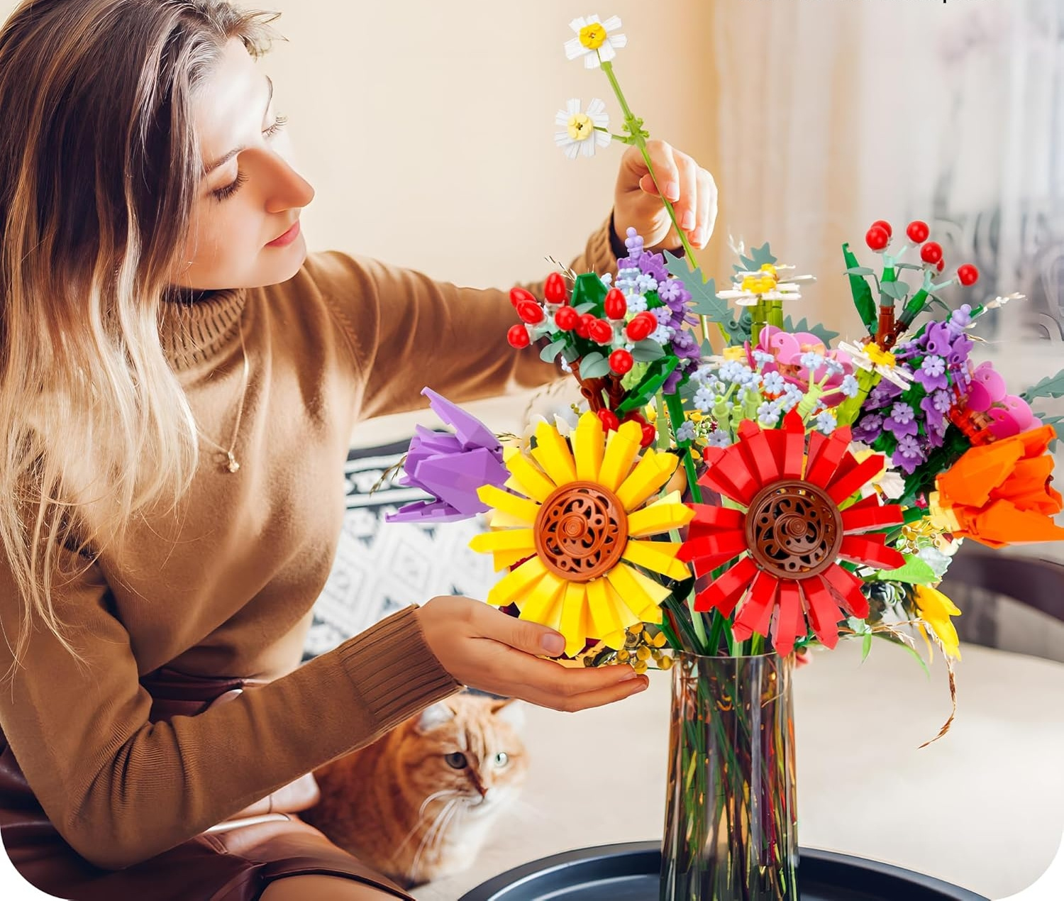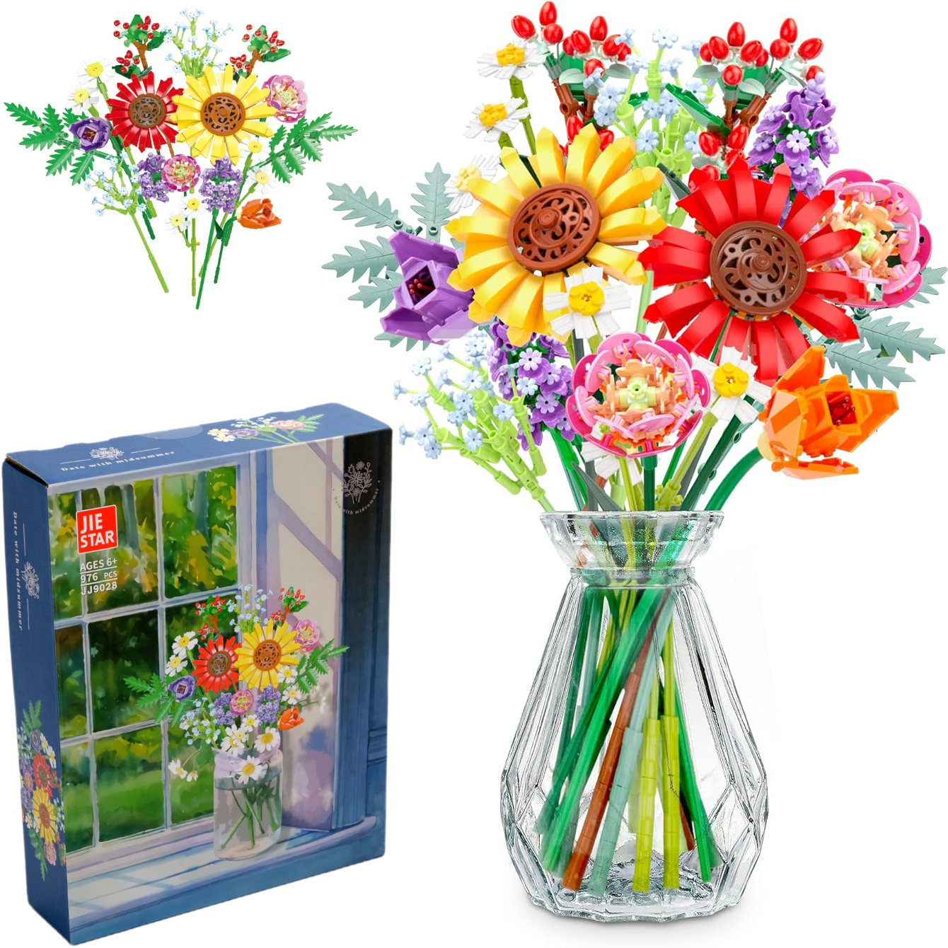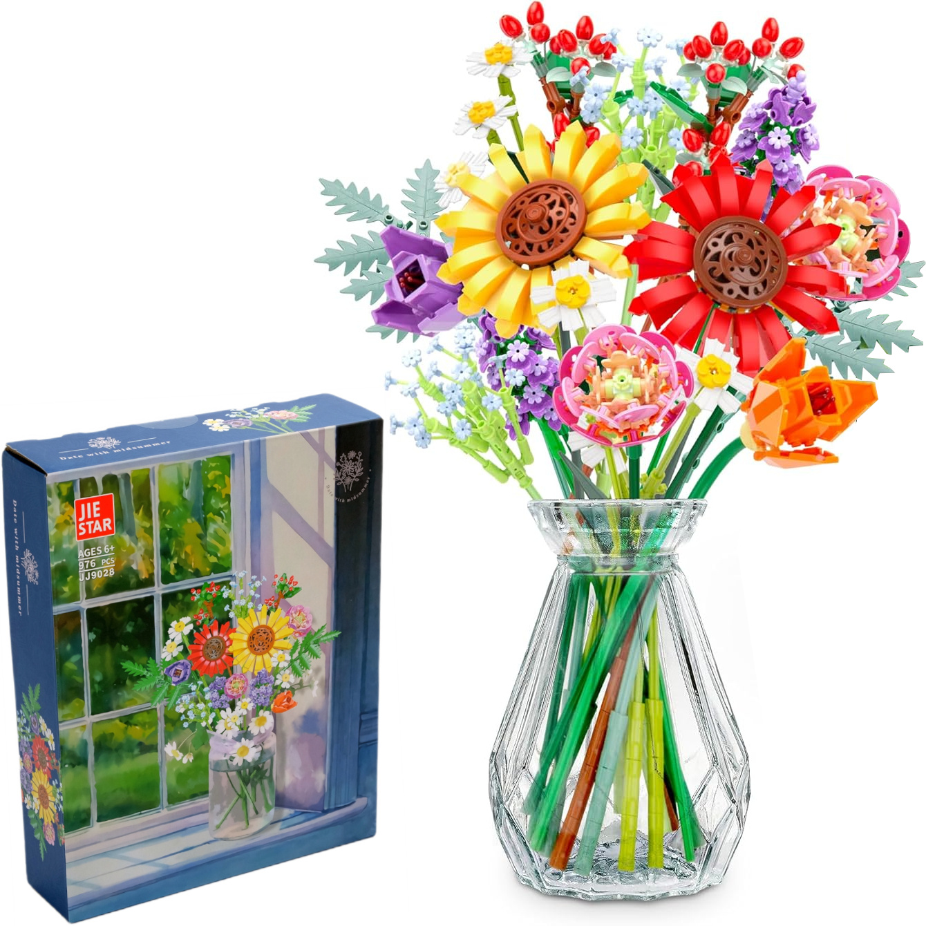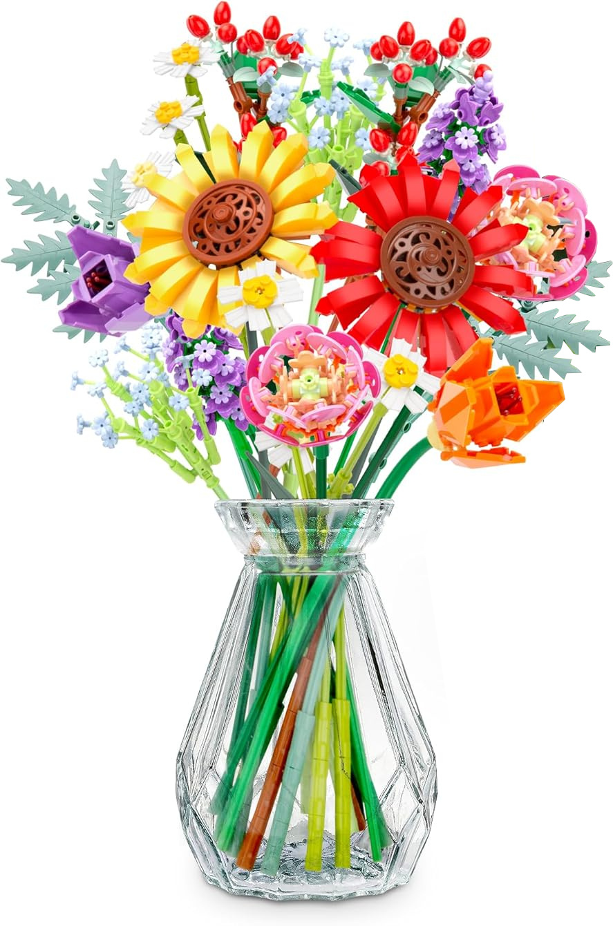 Ten wyjątkowy bukiet kwiatów z klocków to kreatywny i nowoczesny sposób na udekorowanie wnętrza. Składa się z 976 elementów, które pozwalają na zbudowanie kolorowych kwiatów o realistycznym wyglądzie. Całość można włożyć do wazonu i postawić na stole lub półce, tworząc niepowtarzalny element dekoracyjny. Idealny dla miłośników klocków, kwiatów oraz nowoczesnych rozwiązań w aranżacji wnętrz.