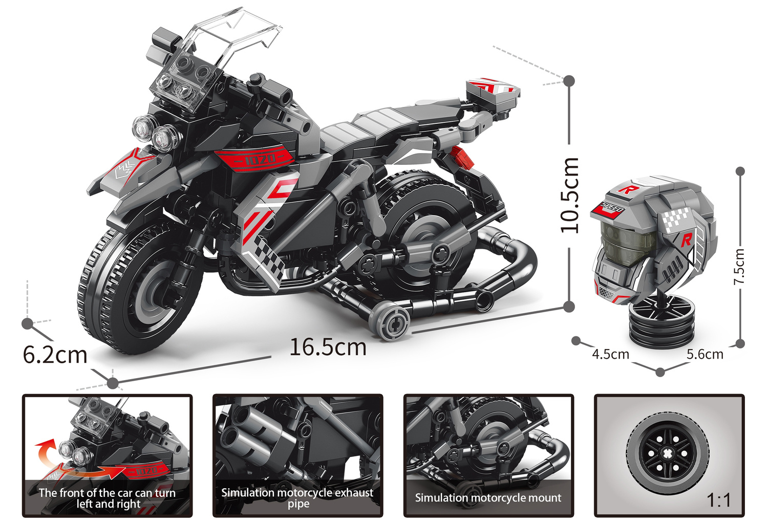 Wyjątkowy zestaw kloców konstrukcyjnych dzięki którym zbudujesz swój własny motocykl turystyczny. Zestaw składa się z 402 elementów, które pozwalają na zbudowanie wiernie odwzorowanego modelu. Dodatkową atrakcją są ruchome elementy takie jak kierownica z przednim kołem oraz stojak na kask w kształcie felgi. Całość można postawić na stole lub półce, tworząc niepowtarzalny element dekoracyjny. Idealny dla miłośników motoryzacji i jednośladów.