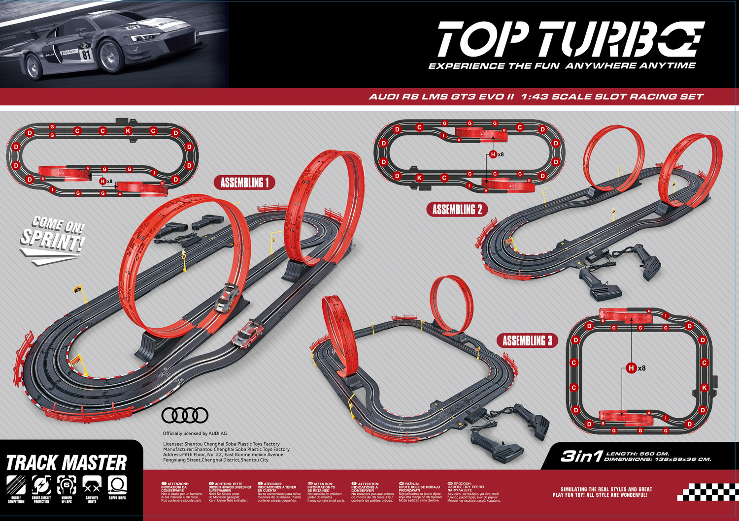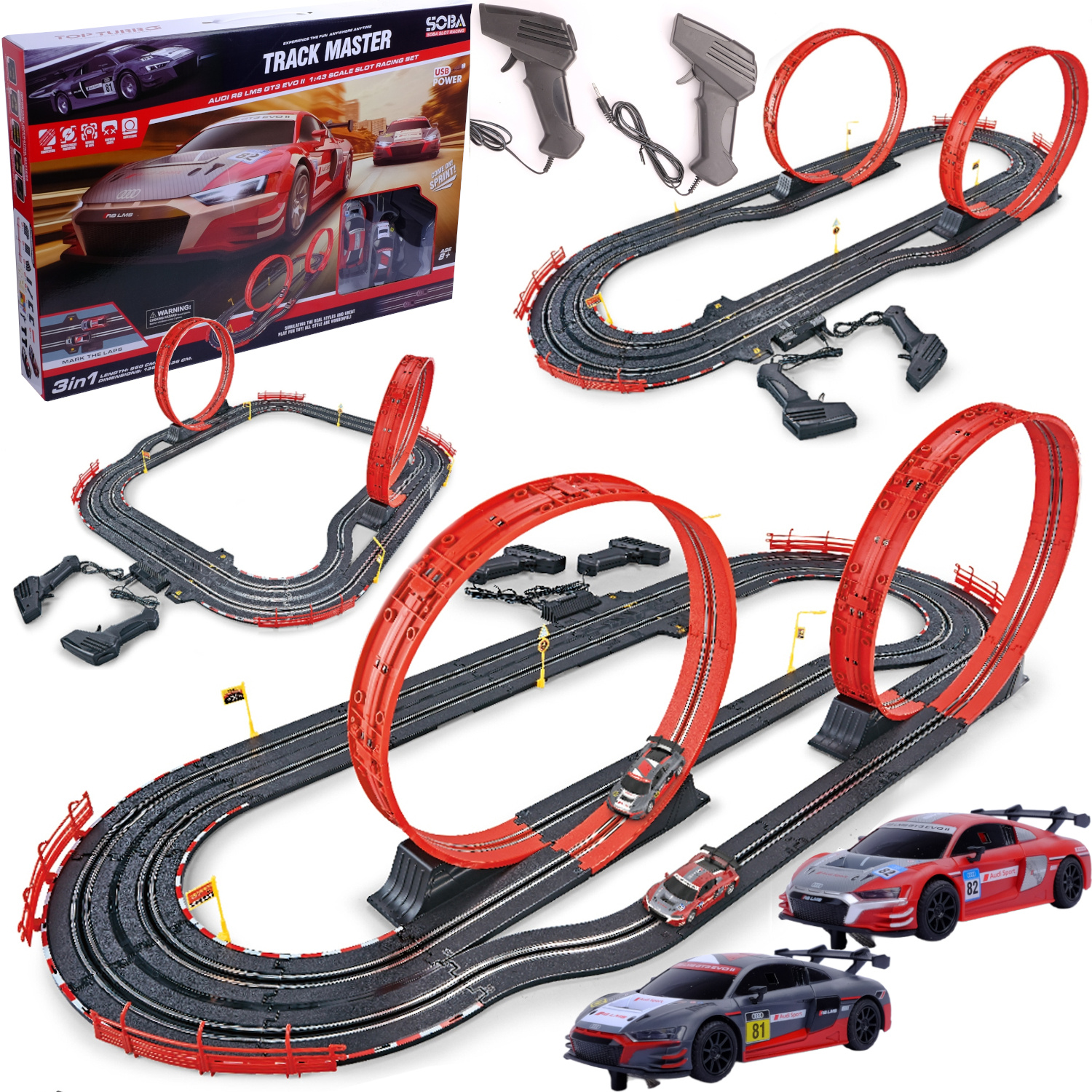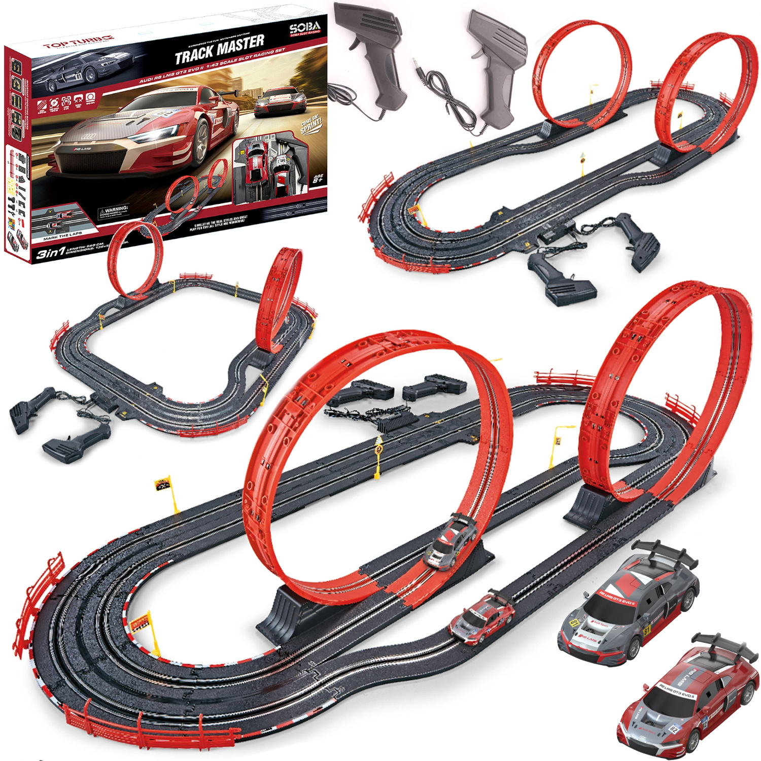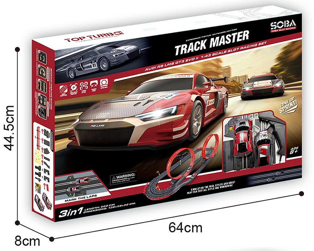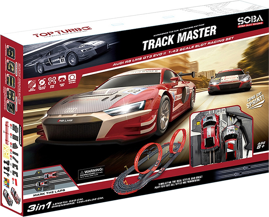 Super zabawa dla najmłodszych i tych nieco starszych fanów zabawek na czterech kółkach! Tor wyścigowy inspirowany słynnymi wyścigami! 2 samochodziki Audi R8 są wiernie odwzorowane, wyglądają niczym żywcem wyjęte z wyścigu! Tor wyścigowy 3w1 - możesz się ścigać na 3 różnych konfiguracjach toru! Ekstremalne przeszkody takie jak pętle, rozdzielony tor jazdy czy ostre zakręty zapewnią sporą dawkę adrenaliny podczas rywalizacji z innymi!