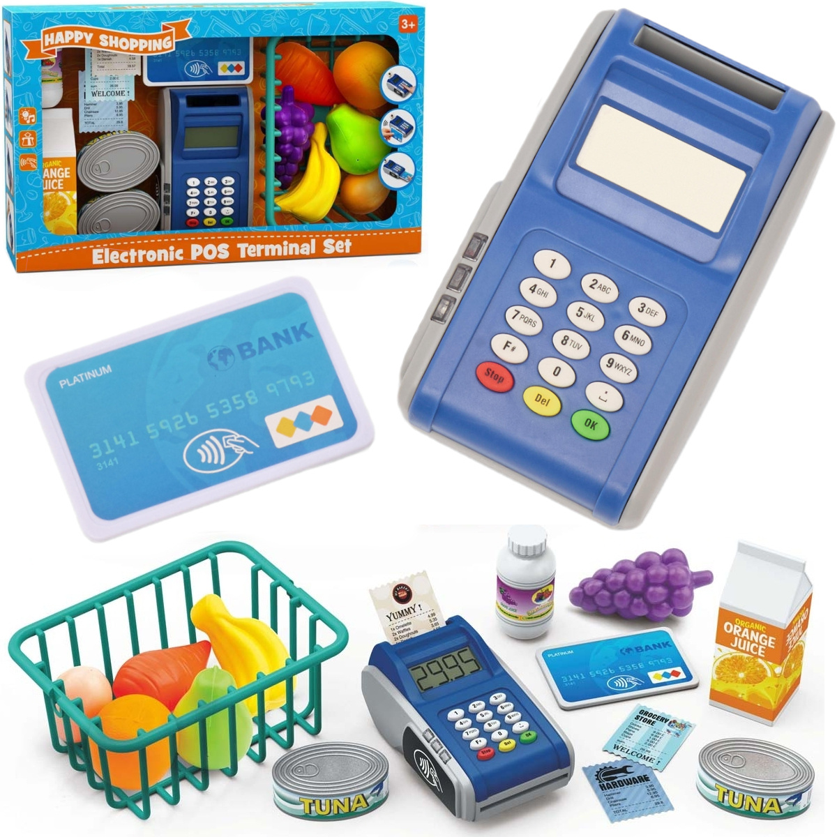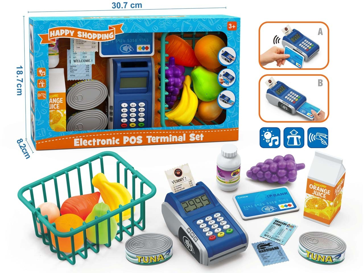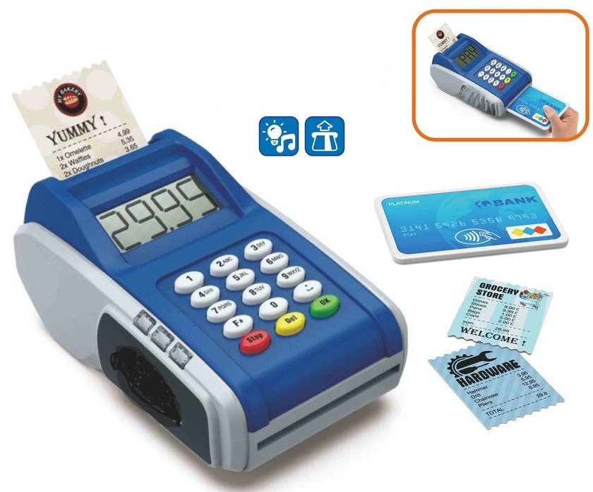 Pora odwiedzić supermarket i zrobić zakupy! Wybierz potrzebne artykuły, włóż je do koszyczka i użyj terminalu by zapłacić. Terminal płatniczy idealny do zabawy w sklep i odgrywanie ról może pomóc dzieciom w ćwiczeniu umiejętności dodawania i odejmowania. Zabawka posiada prawdziwy czytnik kart oraz wyświetlacz. W zestawie jest też karta kredytowa i paragony. Twoja pociecha poczuje się jak w realnym supermarkecie.