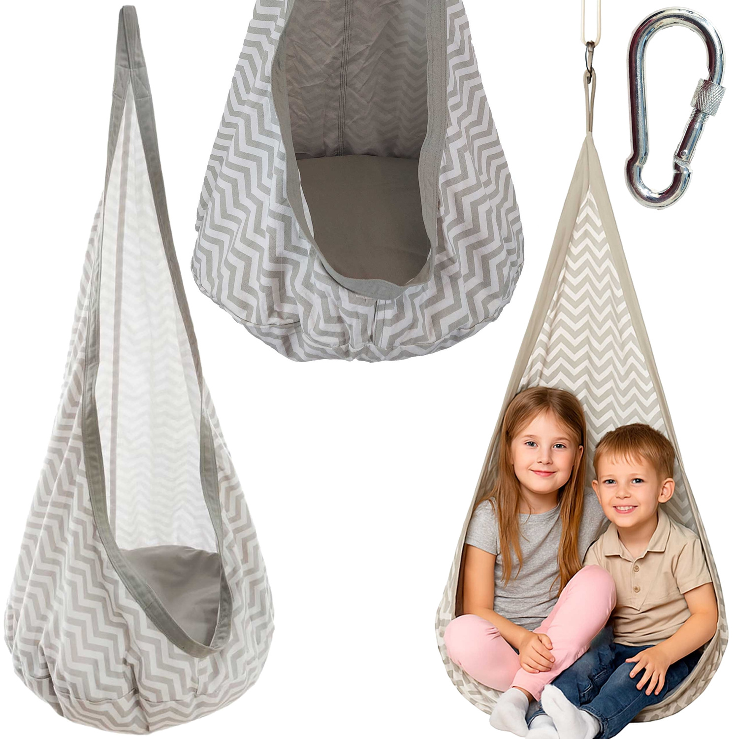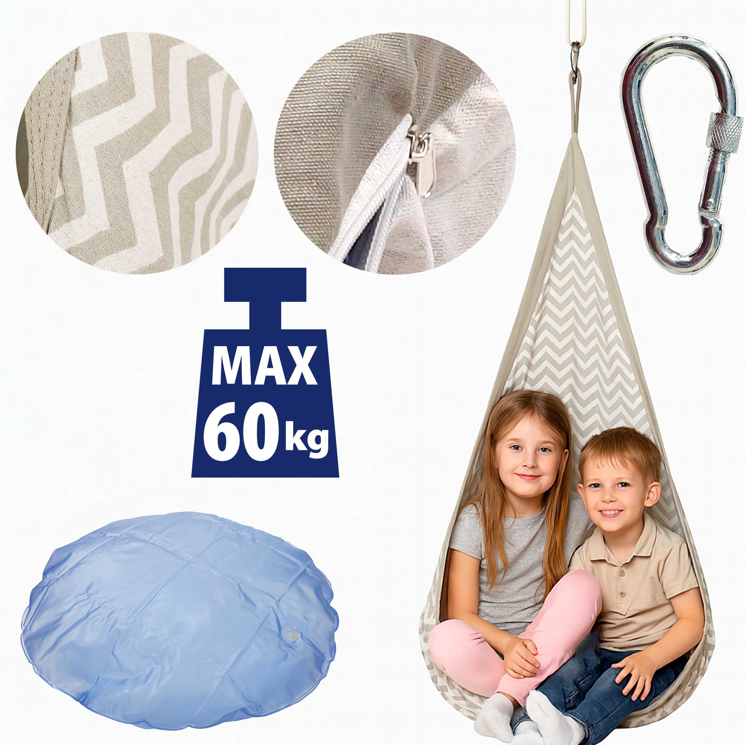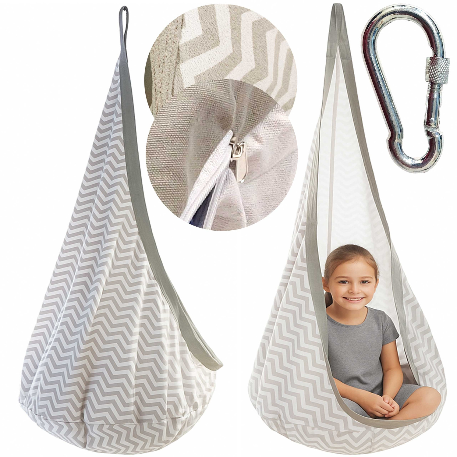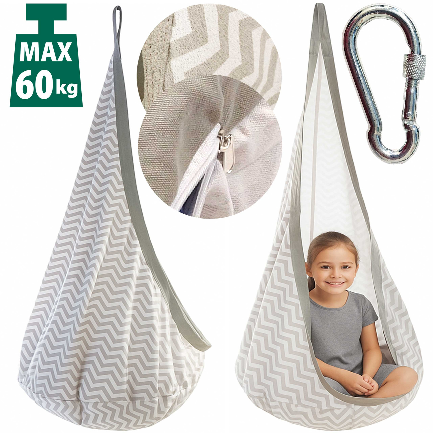 Zmień zwykły pokój lub ogród w plac zabaw, który pokocha Twoje dziecko! Kokon w eleganckim, biało szarym wzorze to idealne połączenie wygody i bezpieczeństwa. Huśtawka została zaprojektowana z myślą o najmłodszych – mocny materiał i solidny metalowy karabińczyk gwarantują stabilność i pewne mocowanie.