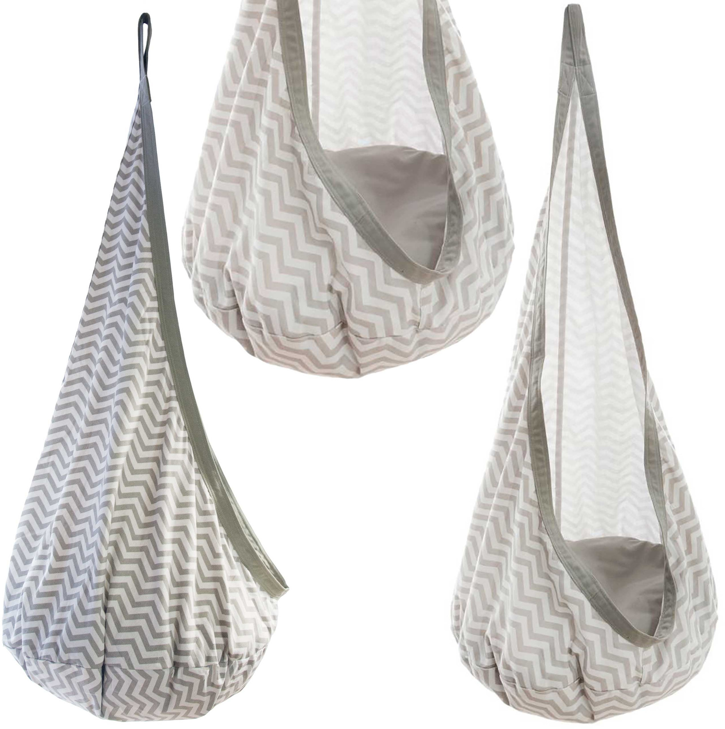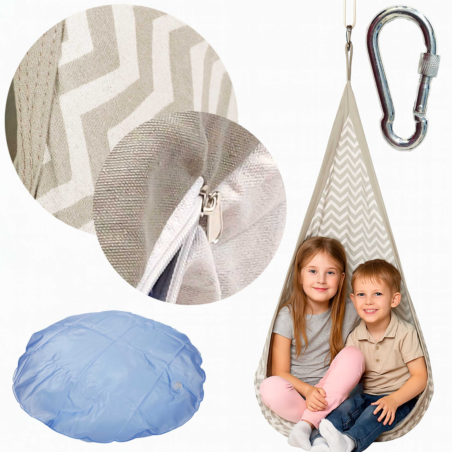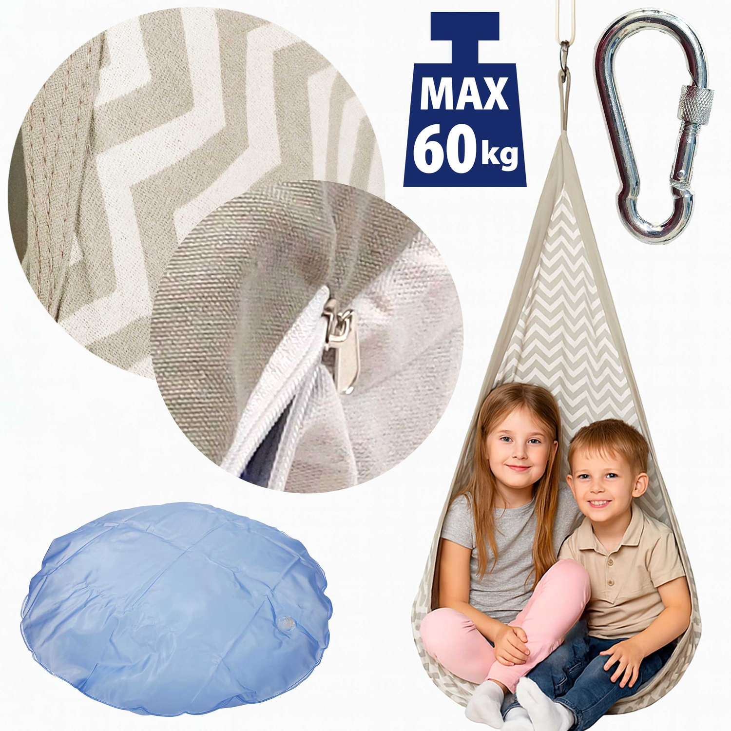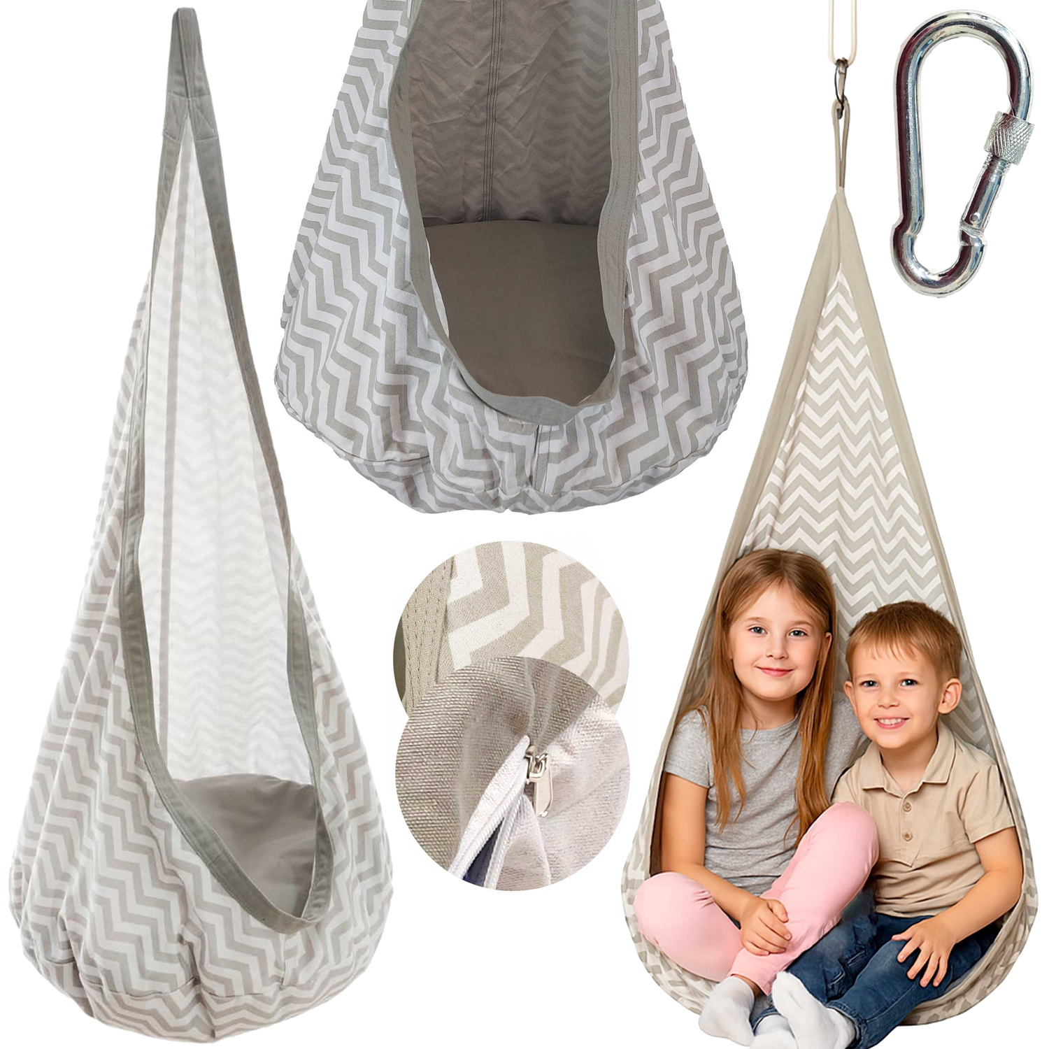 Zmień zwykły pokój lub ogród w plac zabaw, który pokocha Twoje dziecko! Kokon w eleganckim, biało szarym wzorze to idealne połączenie wygody i bezpieczeństwa. Huśtawka została zaprojektowana z myślą o najmłodszych – mocny materiał i solidny metalowy karabińczyk gwarantują stabilność i pewne mocowanie.