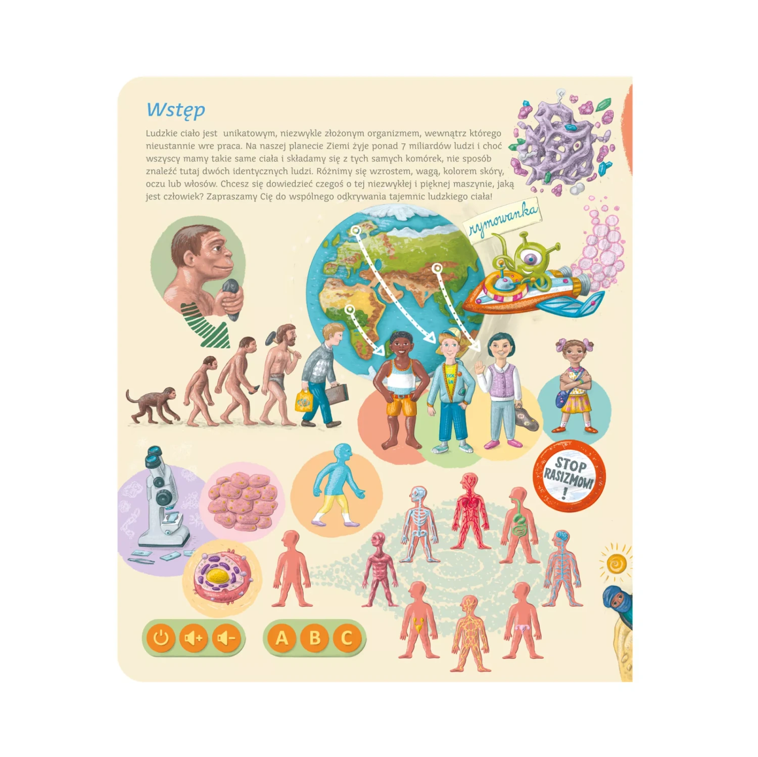Książka Ciało człowieka - podczas lektury interaktywnej książki "Ciało człowieka" towarzyszy nam miły ufoludek Prokuś, który przybył na Ziemię, aby poznać interesujące i tajemnicze ludzkie ciało. Wraz z nim zdobędziesz wiedzę o funkcjonowaniu organizmu. Na ilustracjach są zakodowane informacje o poszczególnych układach ciała człowieka i o tym, jak dbać o swoje zdrowie.