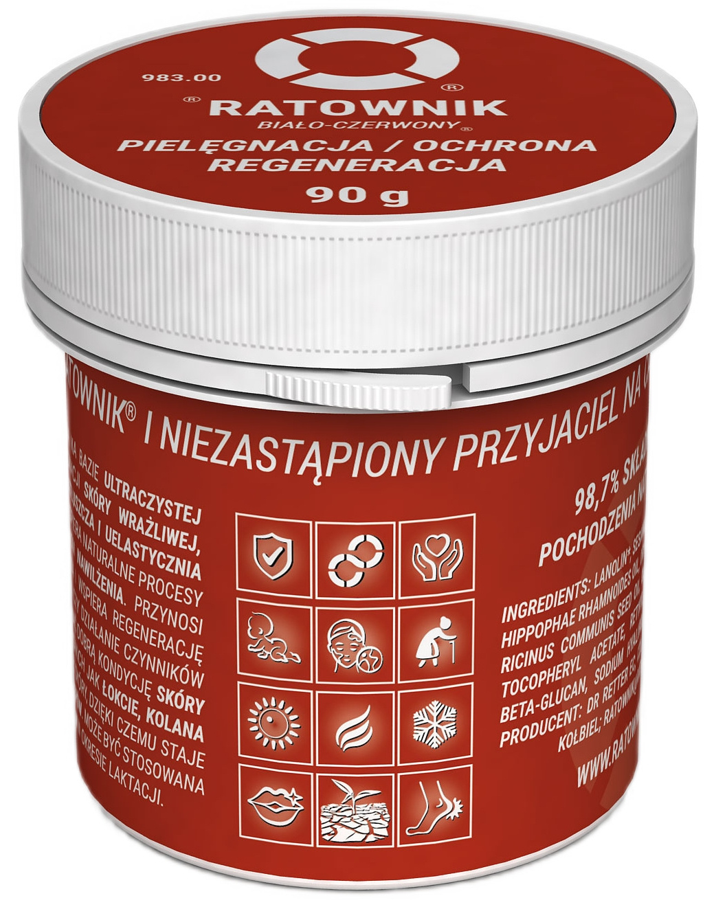Ratownik® Biało-Czerwony® Maść Lanolinowa® z Ceramidami – intensywnie regeneruje, natłuszcza i chroni skórę wrażliwą przed podrażnieniami i przesuszeniem, przynosząc natychmiastową ulgę i wspierając jej naturalną odbudowę.
