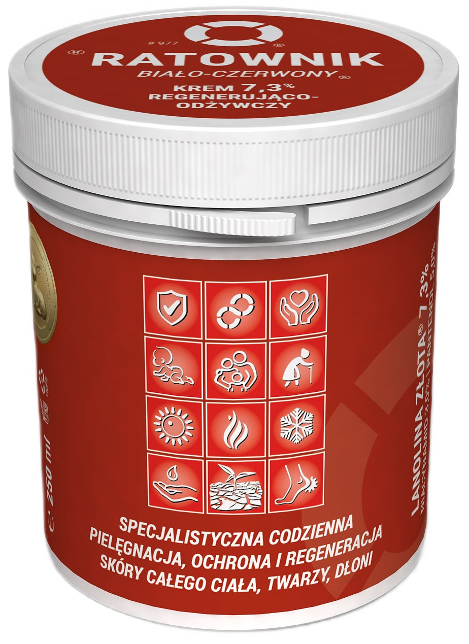 Ratownik® Biało-Czerwony® Krem Regenerująco-Odżywczy Lanolina Złota® 7,3% – odżywia, nawilża i wygładza skórę twarzy, dłoni i ciała, przywracając jej miękkość, elastyczność i zdrowy wygląd każdego dnia.