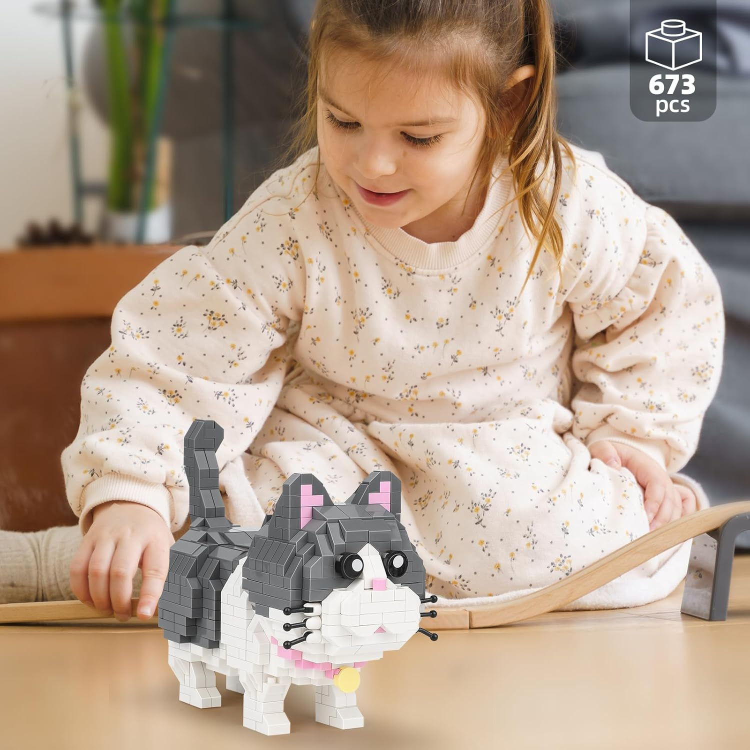 Relacyjny zestaw klocków z których biało-szarego kotka. Zwierzątko domowe z klocków wygląda jak prawdziwe! Zestaw zawiera 673 elementów, dzięki czemu zapewnia wiele godzin wciągającej zabawy. Niesamowita gratka dla małych miłośników klocków oraz kotków.